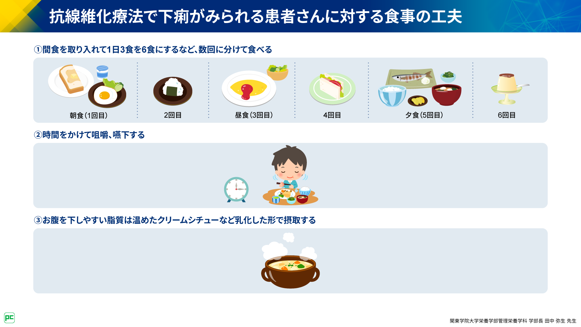 IPF患者さんが下痢でお困りの場合は、下痢のために「絶食」することは栄養状態の悪化につながるため、できる限り避けるようにとお伝えしています。また、