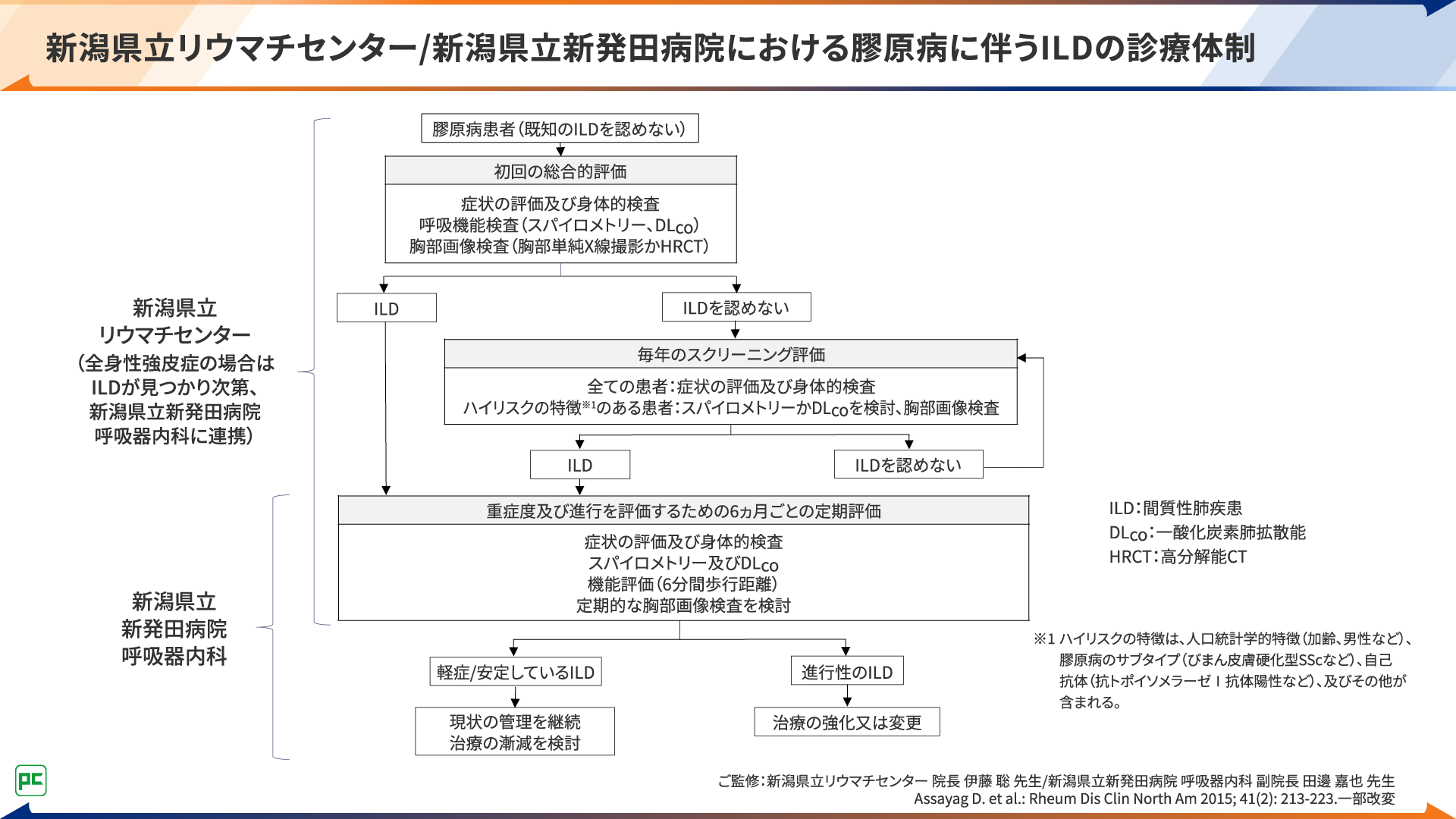 ILDに対する治療については、専門である呼吸器内科の先生に実施いただくのが、患者さんにとっても膠原病内科の先生方にとってもよいと考えています。ご施設によっては、新潟県立リウマチセンターと新発田病院のように、膠原病内科と呼吸器内科が連携して診療できる環境もあれば、膠原病内科やリウマチ内科、関節リウマチの場合は整形外科が単独で膠原病患者さんを診療するという環境もあると思います。いずれの環境においても、膠原病に伴うILDについて速やかに呼吸器内科の先生に相談できる体制を作っておくことが大切だと思います。