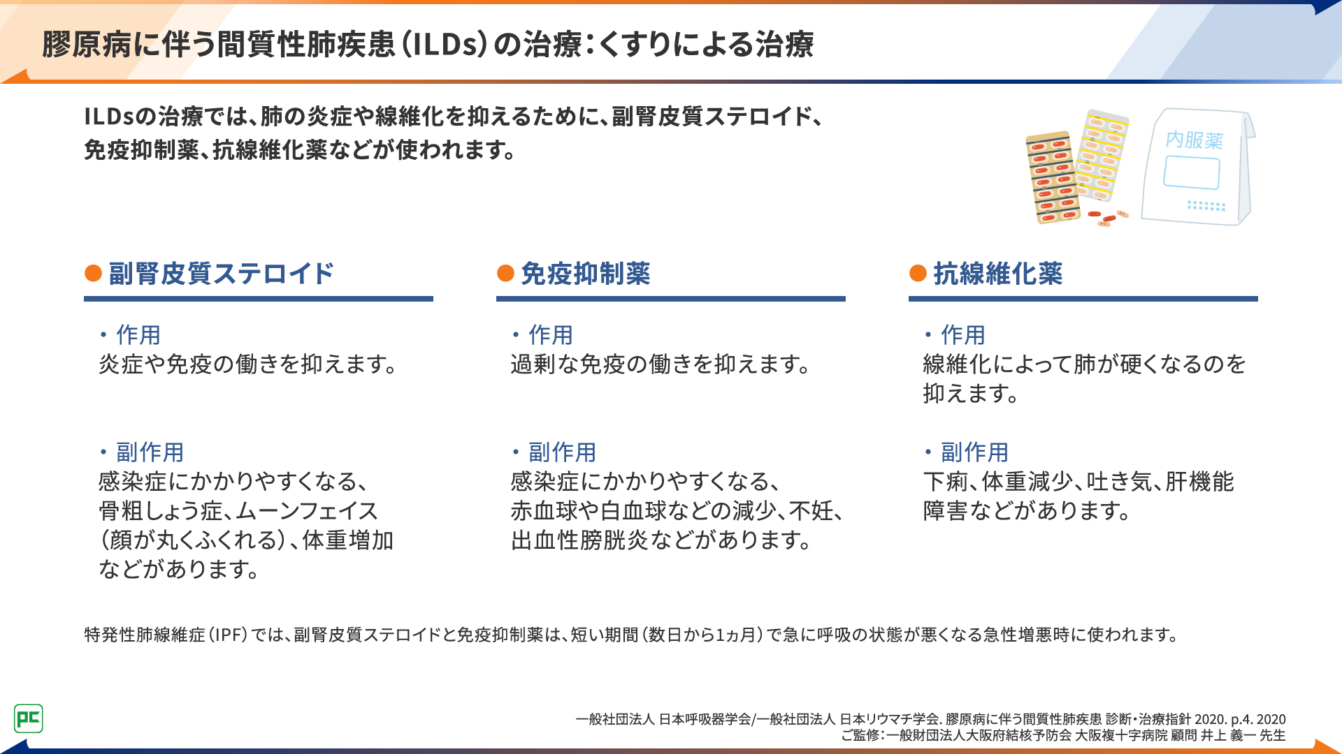 - 一般社団法人 日本呼吸器学会/一般社団法人 日本リウマチ学会. 膠原病に伴う間質性肺疾患 診断・治療指針 2020. p.2-5. 2020