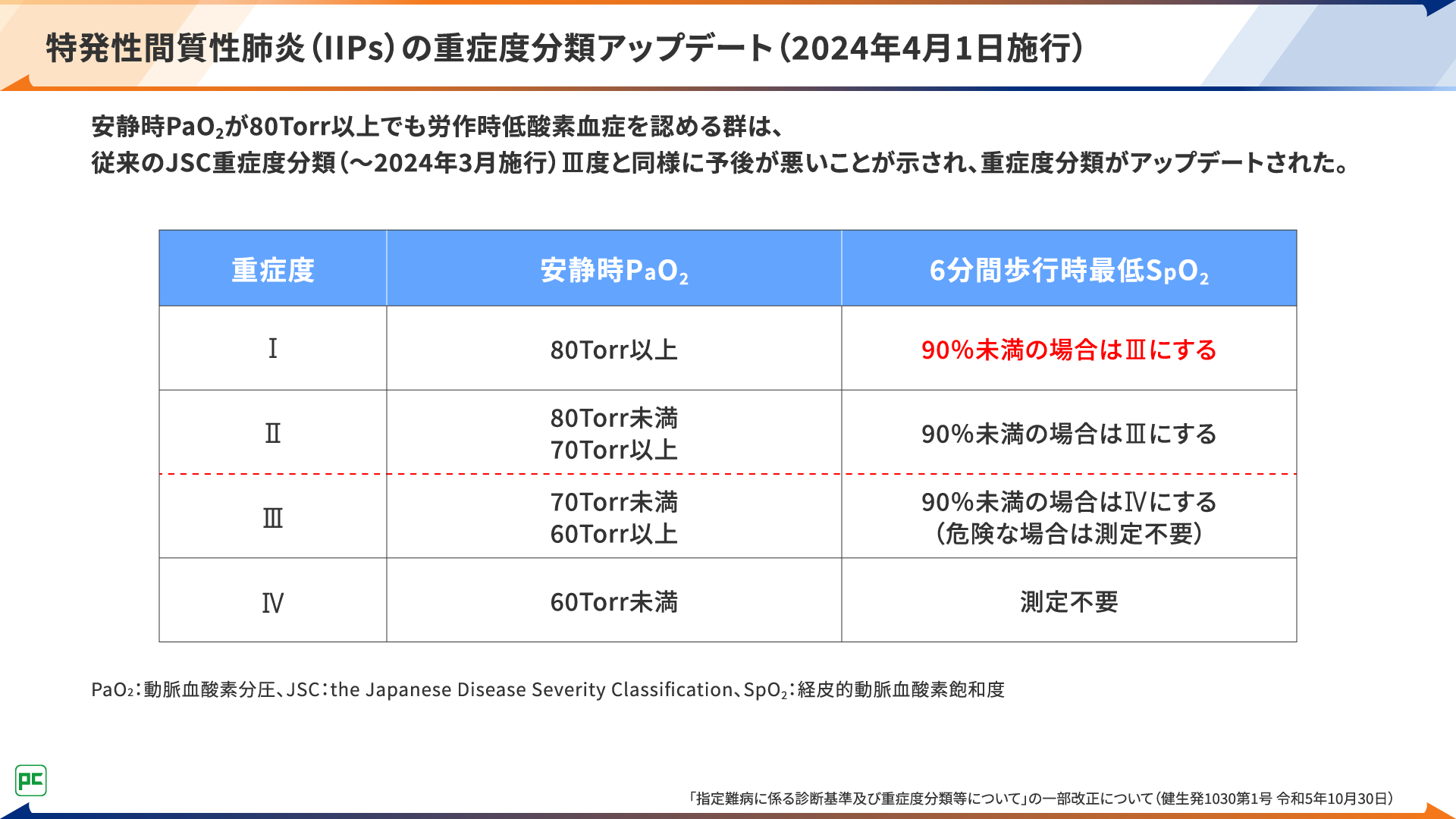 抗線維化薬のひとつであるオフェブの導入にあたっては、患者さんが医療費の負担を懸念されて、なかなか前向きになれないということがあります。新潟県立リウマチセンターから連携された患者さんの中でも特に全身性強皮症の患者さんについては、すでに全身性強皮症として指定難病の医療費助成の受給資格を取得されていることが多く、資格を有する場合は高くとも月30,000円の自己負担で治療を受けていただくことができるため2)、オフェブの導入をお勧めしやすいと感じています。全身性強皮症以外の膠原病のうち、悪性関節リウマチ、顕微鏡的多発血管炎(MPA)、多発血管炎性肉芽腫症(GPA)、好酸球性多発血管炎性肉芽腫症(EGPA)については、重症度分類の基準の一部に特発性間質性肺炎の重症度分類でⅢ度以上に該当することが含まれています3)。2024年4月の特発性間質性肺炎の重症度分類改定により、安静時PaO2の値で重症度Ⅲ度以上と判定される場合に加えて、安静時PaO2では重症度Ⅰ~Ⅱ度と判定される場合でも、6分間歩行時最低SpO2が90%未満の場合は重症度Ⅲ度に分類されるようになりました(図3)。これにより、悪性関節リウマチやMPA、GPA、EGPA患者さんでも指定難病の医療費助成の受給資格を満たす可能性が広がり、オフェブの導入をお勧めしやすくなったと感じています。