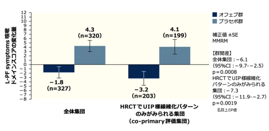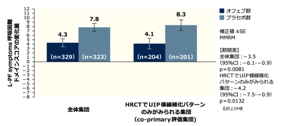 全体集団: 投与52週時におけるL-PF symptoms※1呼吸困難ドメインスコアのベースラインからの平均変化量※2はオフェブ群4.3、プラセボ群7.8、群間差は-3.5(95%CI:-6.1--0.9)でした(p=0.0081)。また、咳嗽ドメインスコアのベースラインからの平均変化量※2はオフェブ群-1.8、プラセボ群4.3、群間差は-6.1(95%CI:-9.7--2.5)でした(p=0.0008)名目上のP値。