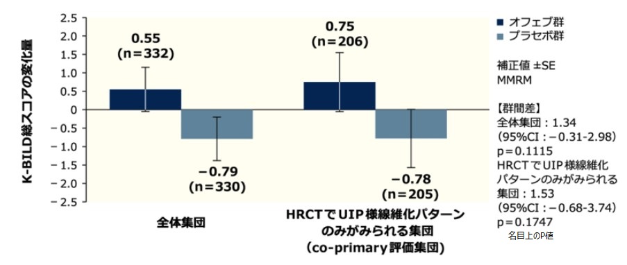 全体集団: 投与52週時におけるK-BILD※1総スコアのベースラインからの平均変化量※2はオフェブ群0.55、プラセボ群-0.79、群間差は1.34(95%CI:-0.31-2.98)でした(p=0.1115)名目上のP値。