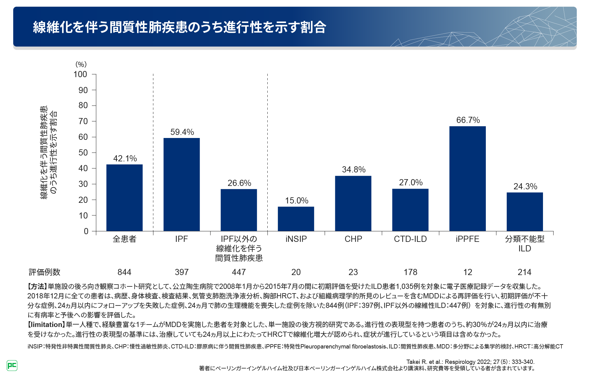 国内単施設における後ろ向き観察コホート研究によると、線維化を伴うILDのうち進行性を示す割合は、全患者で42.1%であり、CTD-ILDにおいては27.0%でした(図2)。
