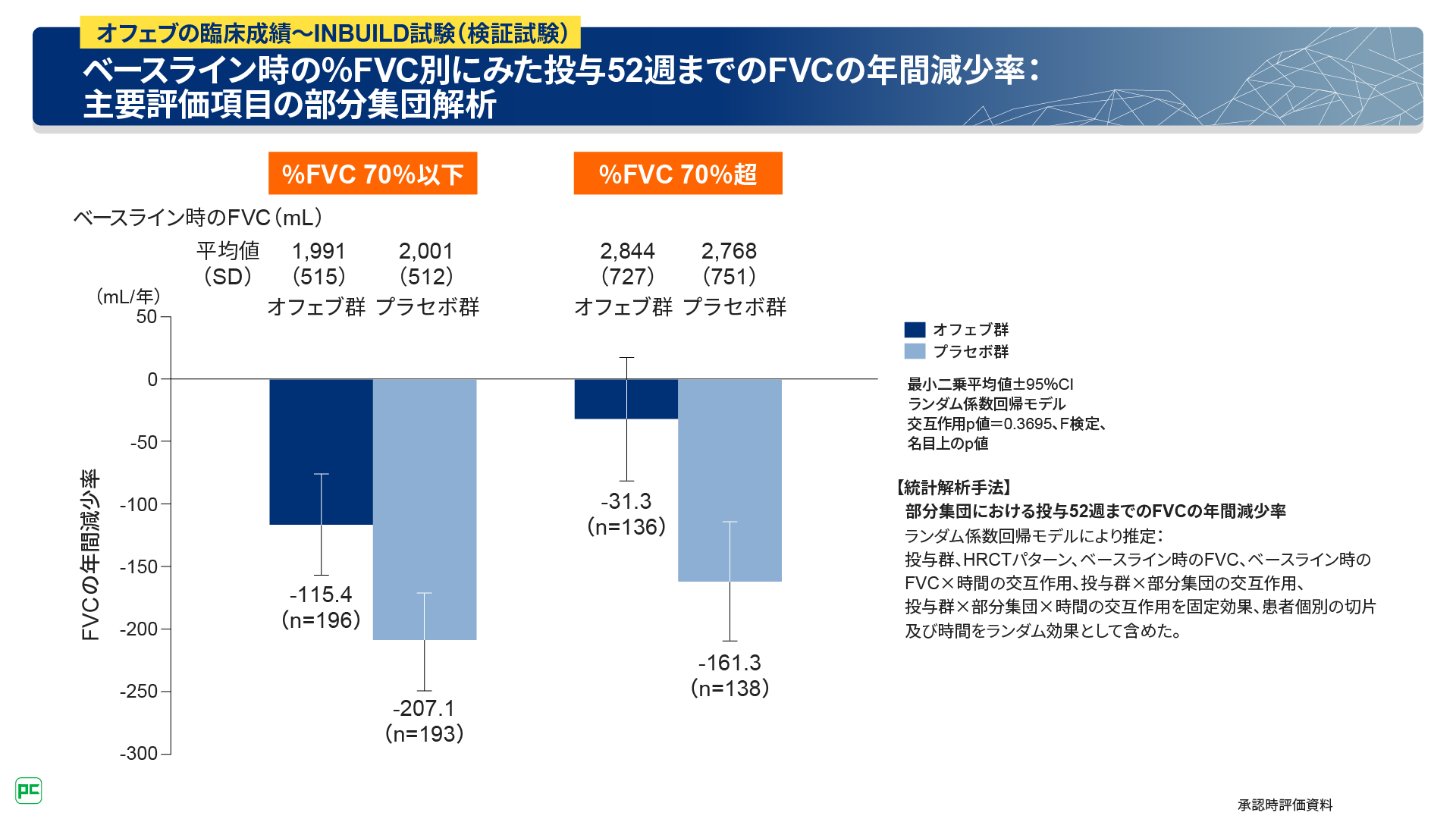本試験では、ベースライン時の%FVC別の部分集団解析も行われました。投与52週までのFVCの年間減少率は、%FVC 70%以下の集団において、オフェブ群-115.4mL/年、プラセボ群-207.1mL/年、%FVC 70%超の集団において、オフェブ群-31.3mL/年、プラセボ群-161.3mL/年でした(図12)。