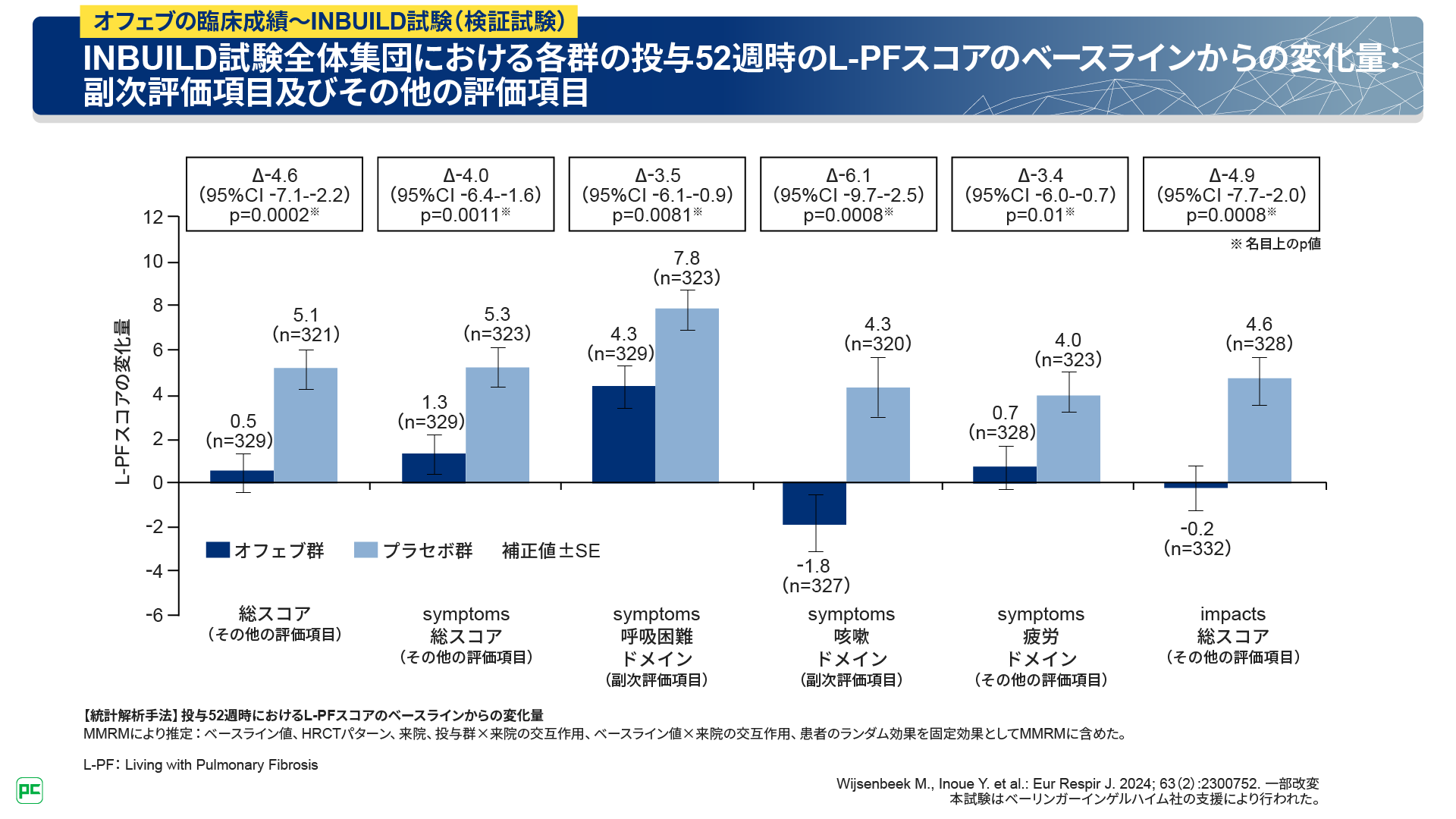 INBUILD試験全体集団における投与52週時のL-PFスコアのベースラインからの変化量について、総スコア、symptomsモジュール総スコア、impactsモジュール総スコア、呼吸困難、咳嗽、疲労の3つのドメインスコアのいずれも、オフェブ群でプラセボ群に対し変化量に有意差が認められました。symptoms咳嗽ドメインスコアについては、オフェブ群で減少が認められました(図14)。
