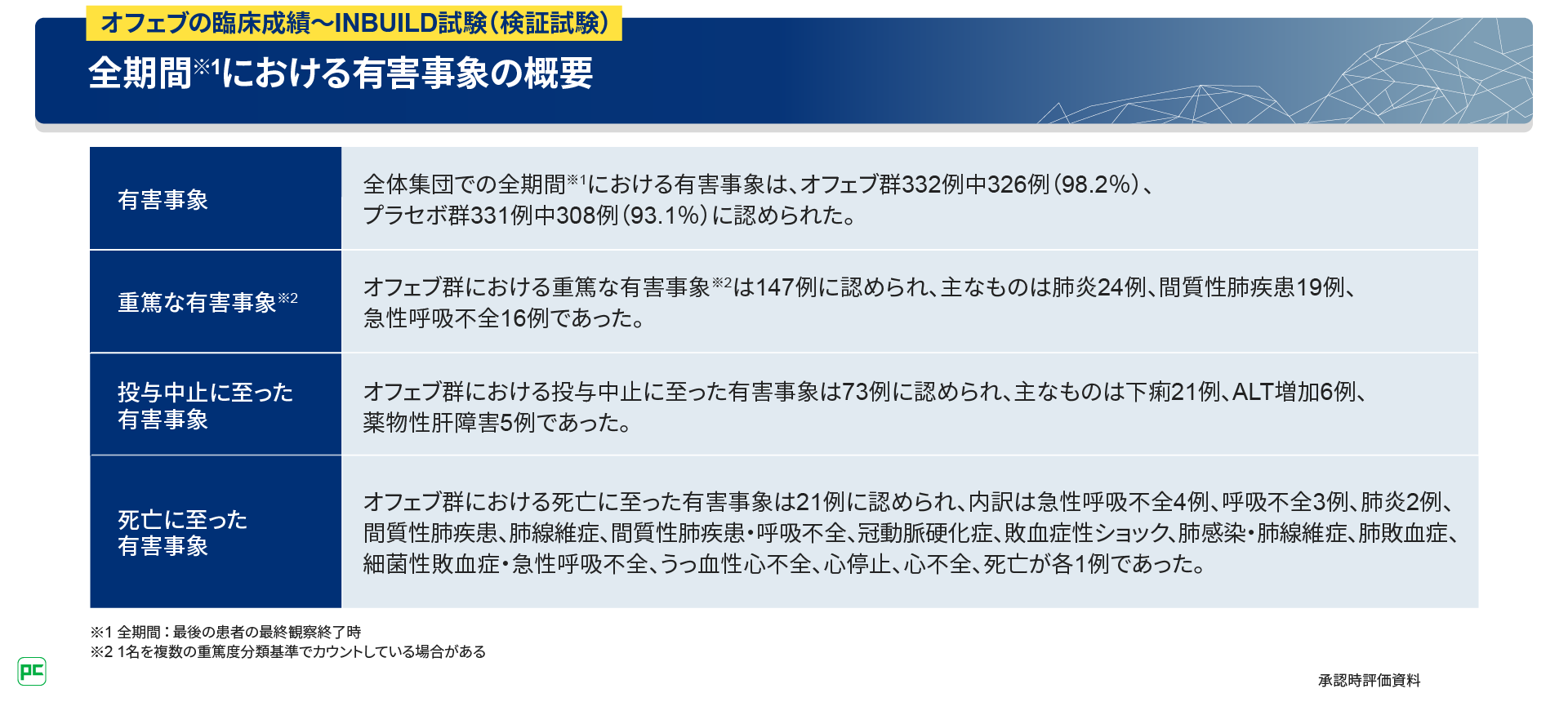 本試験の全期間における有害事象は、オフェブ群で326例(98.2%)、プラセボ群で308例(93.1%)に認められました。オフェブ群における重篤な有害事象として主なものは肺炎24例、間質性肺疾患19例、急性呼吸不全16例などでした。オフェブ群において投与中止に至った有害事象は下痢21例、ALT増加6例、薬物性肝障害5例などであり、死亡に至った有害事象は、急性呼吸不全4例、呼吸不全3例などでした(図15)。