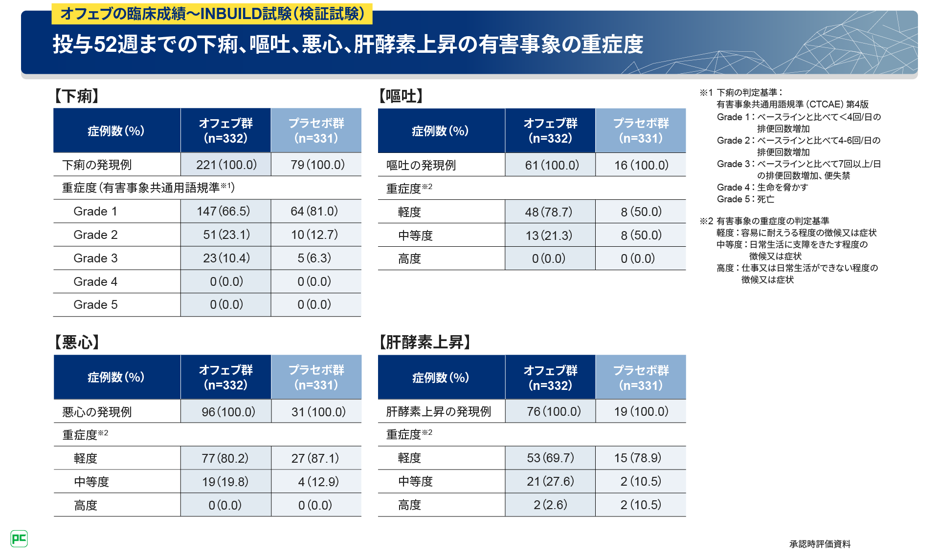 続いて、投与52週までの下痢、嘔吐、悪心、肝酵素上昇の有害事象の重症度をお示しします。オフェブ群において、下痢は、有害事象共通用語規準を用いた評価ではGrade 1が66.5%、Grade 2が23.1%、Grade 3が10.4%でした。嘔吐と悪心、肝酵素上昇は有害事象の重症度の判定基準を用いて評価しています。嘔吐は軽度が78.7%、中等度が21.3%、悪心は軽度が80.2%、中等度が19.8%でした。肝酵素上昇は軽度が69.7%、中等度が27.6%、高度が2.6%でした(図17)。