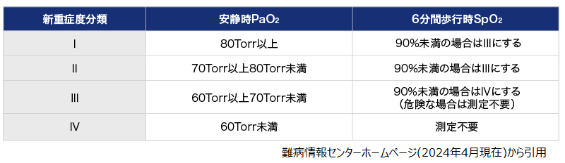 重症度Ⅱ度以上で6分間歩行時経皮的動脈血酸素飽和度(SpO2)が90%未満となる場合は、重症度を一段階高く評価します。ただし、安静時動脈血酸素分圧(PaO2)が70Torr未満の時には、6分間歩行時SpO2は必ずしも測定する必要はないとされています。
