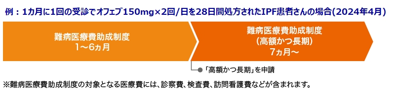 オフェブを処方される重症度Ⅲ〜Ⅳ度のIPF患者さんは、難病医療費助成制度を活用して医療費自己負担額を軽減できる可能性があります。また、医療費総額が50,000円(自己負担が2割の場合、自己負担額が10,000円)を超える月が12ヵ月の間に6回以上ある場合は、難病医療費助成制度の「高額かつ長期」を活用して、自己負担額がより軽減される可能性があります。