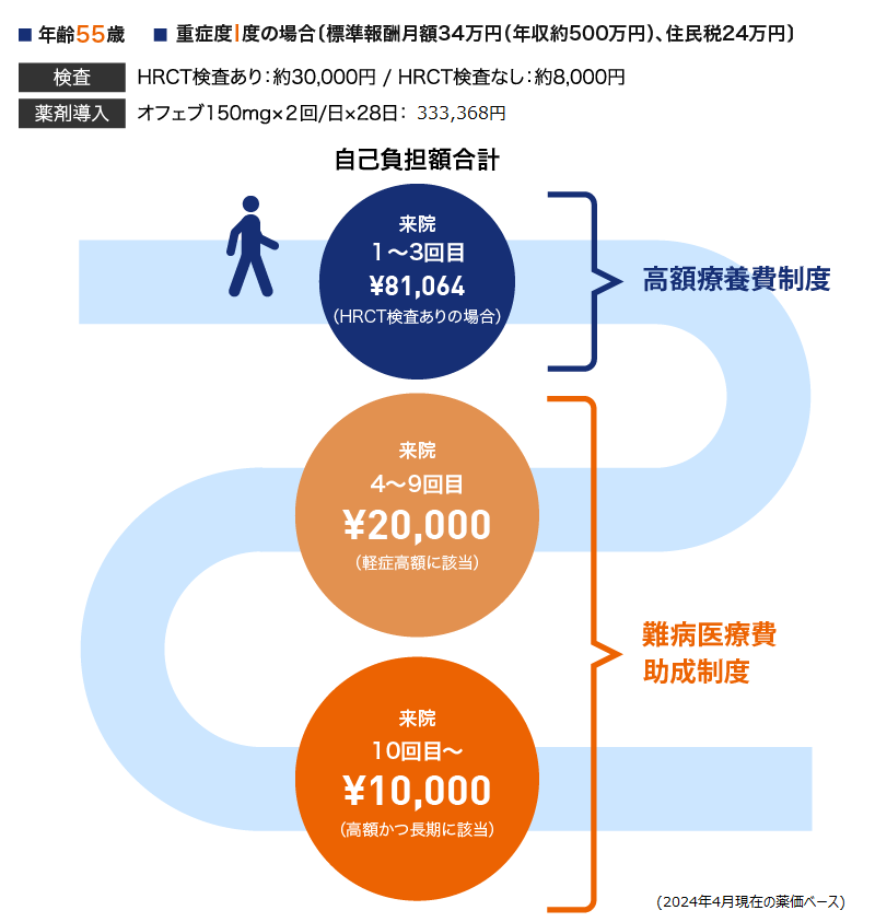 55歳、重症度Ⅰ度のIPF患者さんでは、高額療養費制度を活用することで、月々の自己負担額は81,469円(HRCT検査あり)※までに抑えることができます。