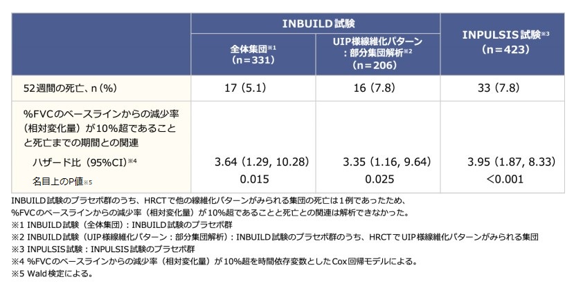 INBUILD試験及びINPULSIS試験の52週までのデータを用いて、%FVCのベースラインからの減少率(相対変化量)が10%超であることと死亡までの期間の関連を分析した。FVCの低下と死亡率の関連に関する評価は、%FVCのベースラインからの減少率(相対変化量)が10%を超えるまでの期間を時間依存変数として含むCox比例ハザードモデルに基づいた。