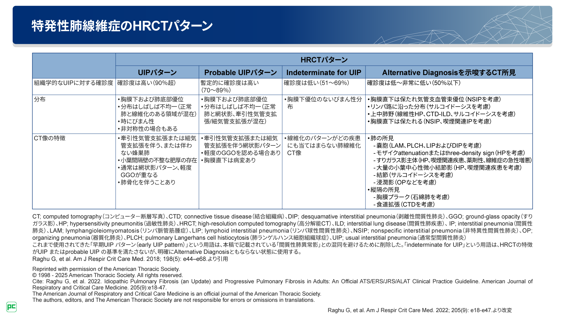 HRCTパターンは、陰影の分布とCT像の特徴をもとにUIP、Probable UIP、Indeterminate for UIP、Alternative Diagnosisを示唆するCT所見の4種に分類され、組織学的なUIPに対する確診度に対応するようになっています(図5)。なお、HRCTでUIPパターンまたはProbable UIPパターンが認められた場合は、外科的肺生検を行わずに集学的検討(MDD)の後にIPFの診断を受けることができます14)。