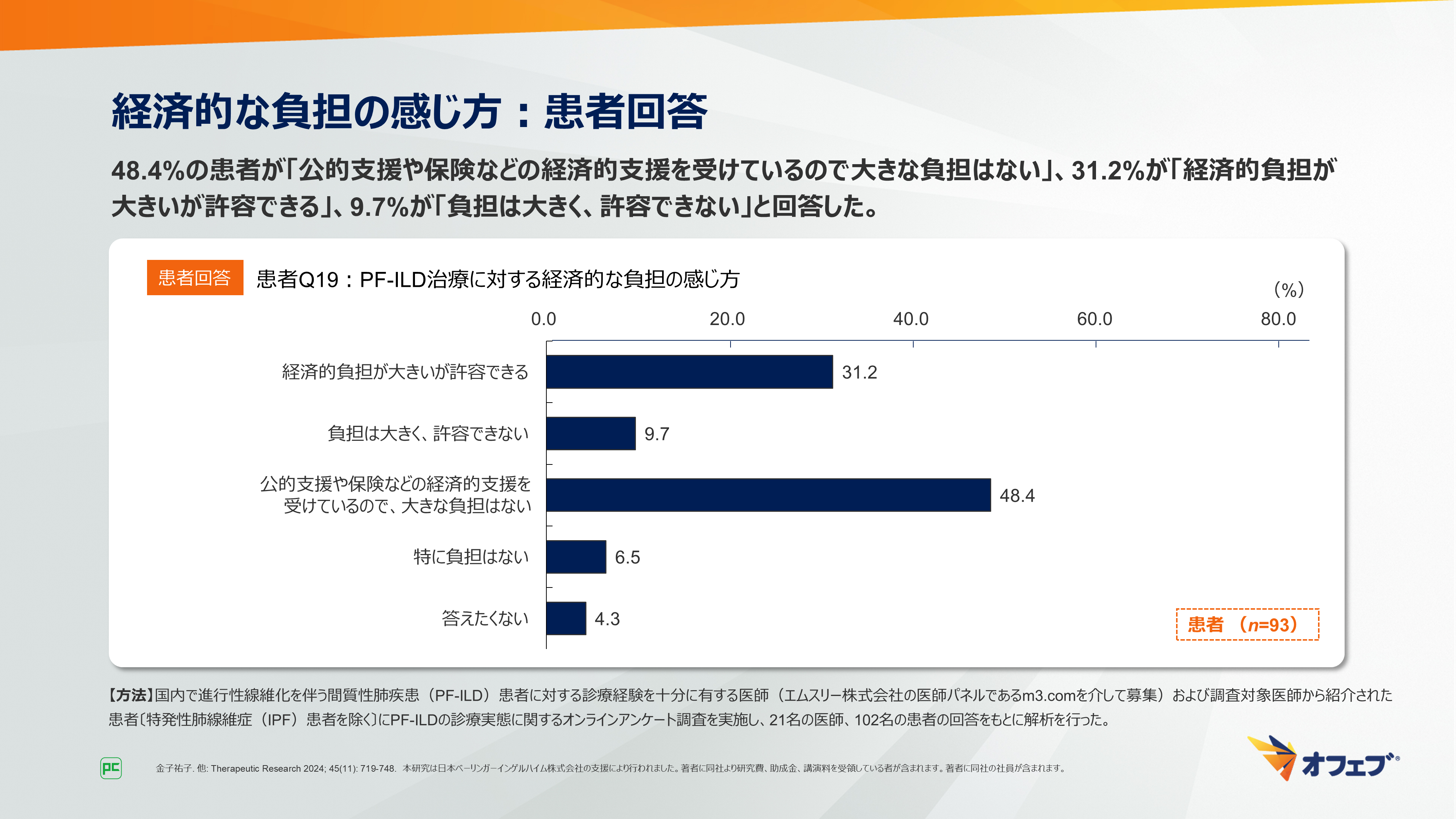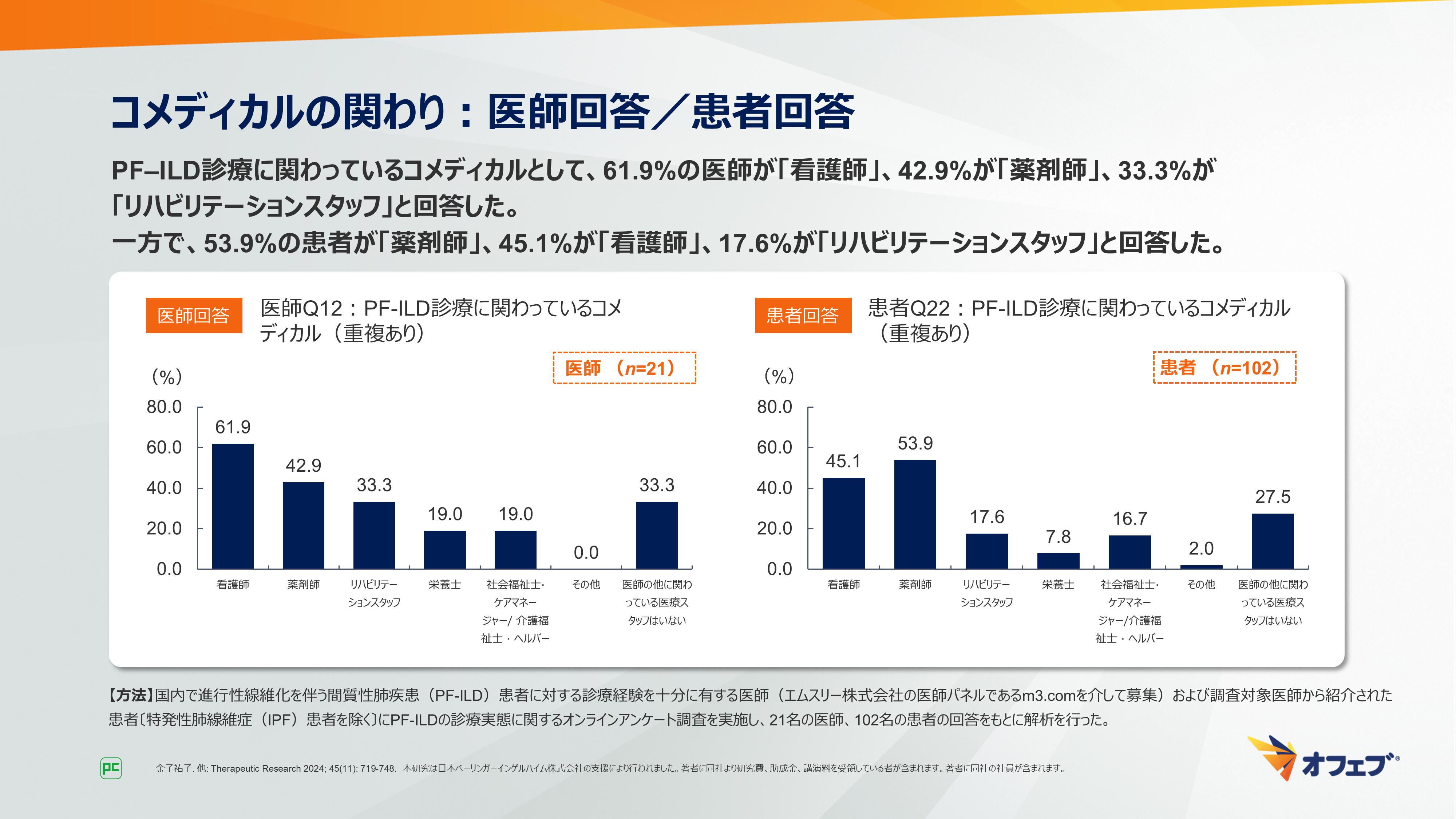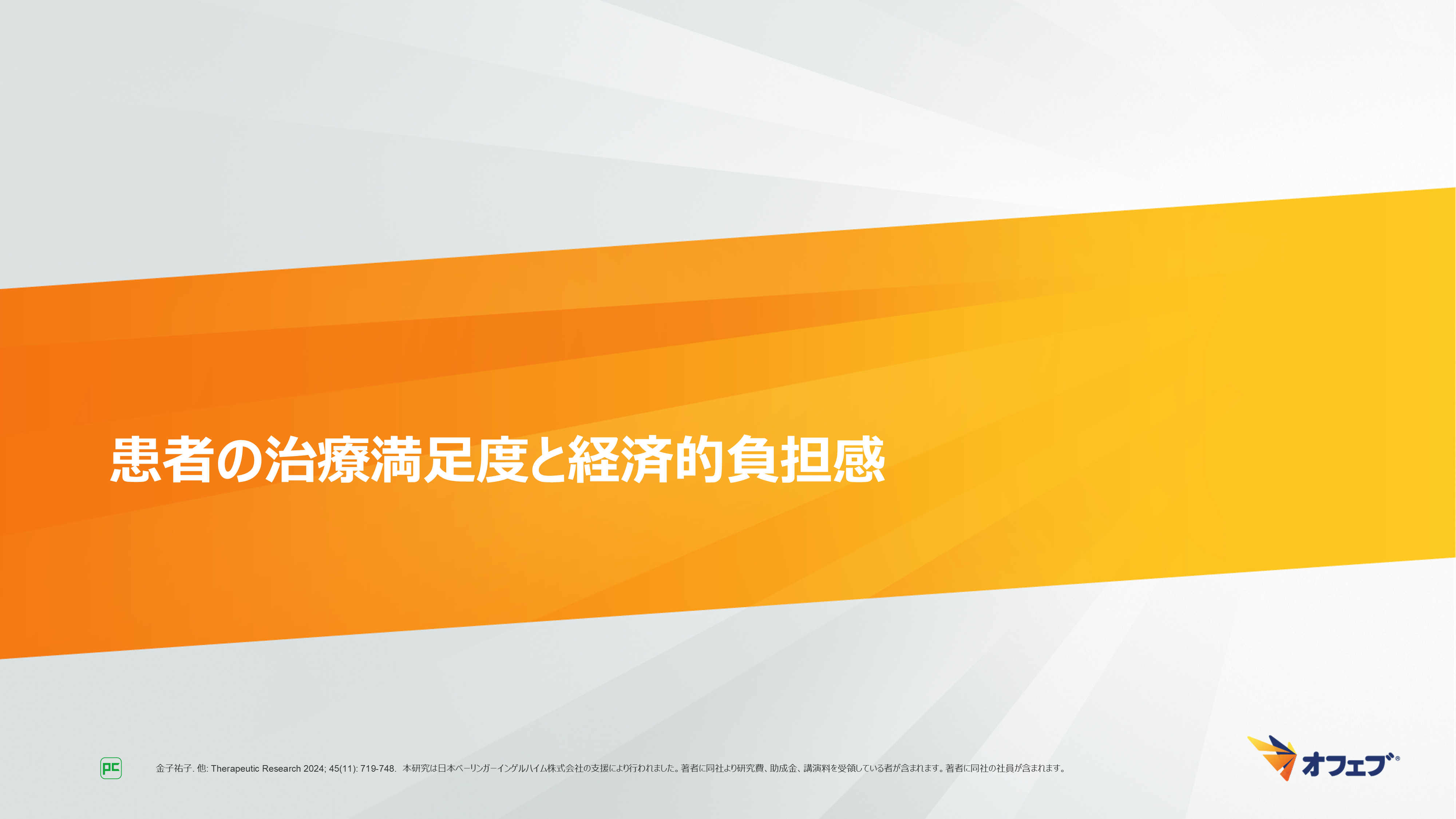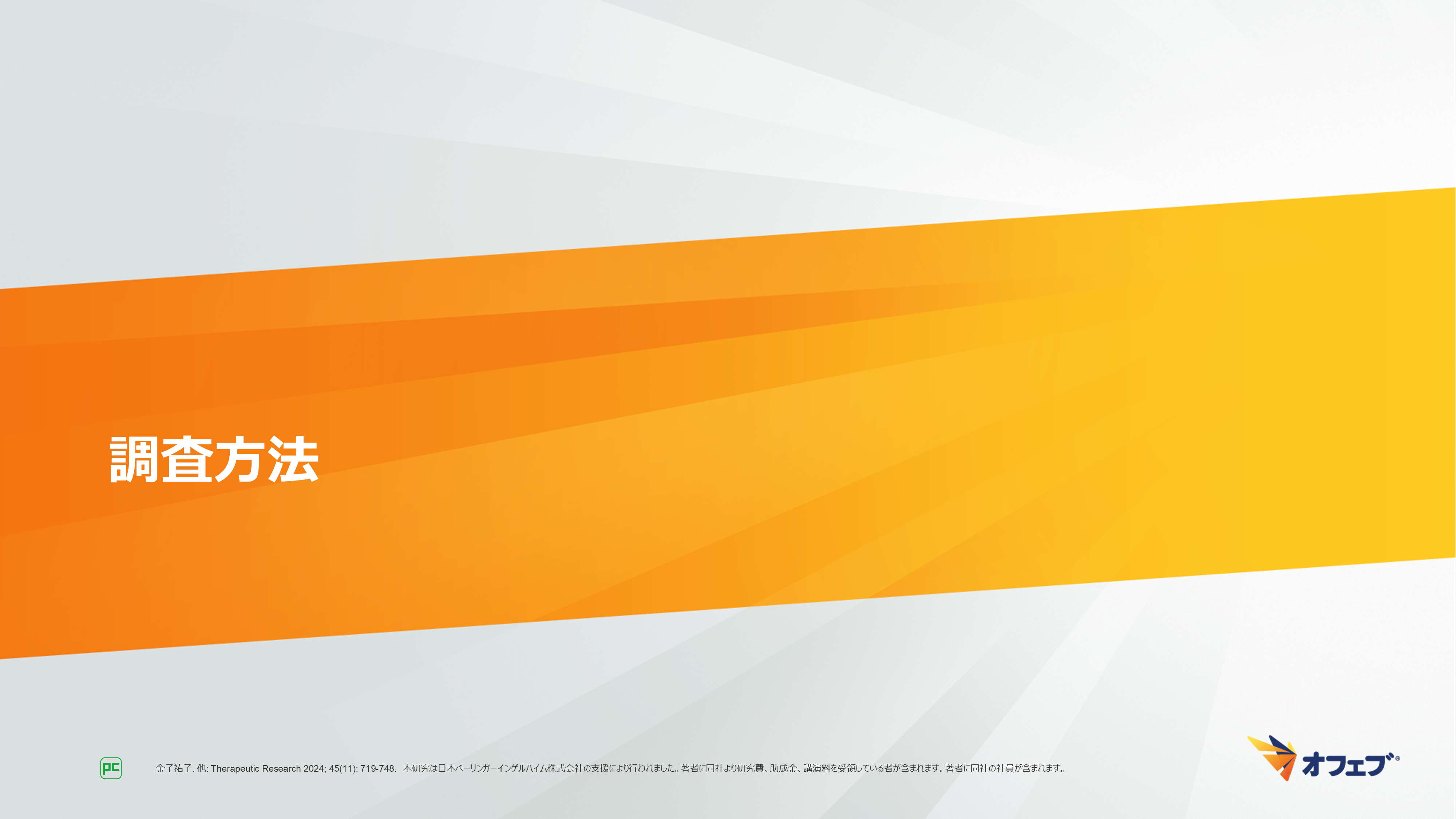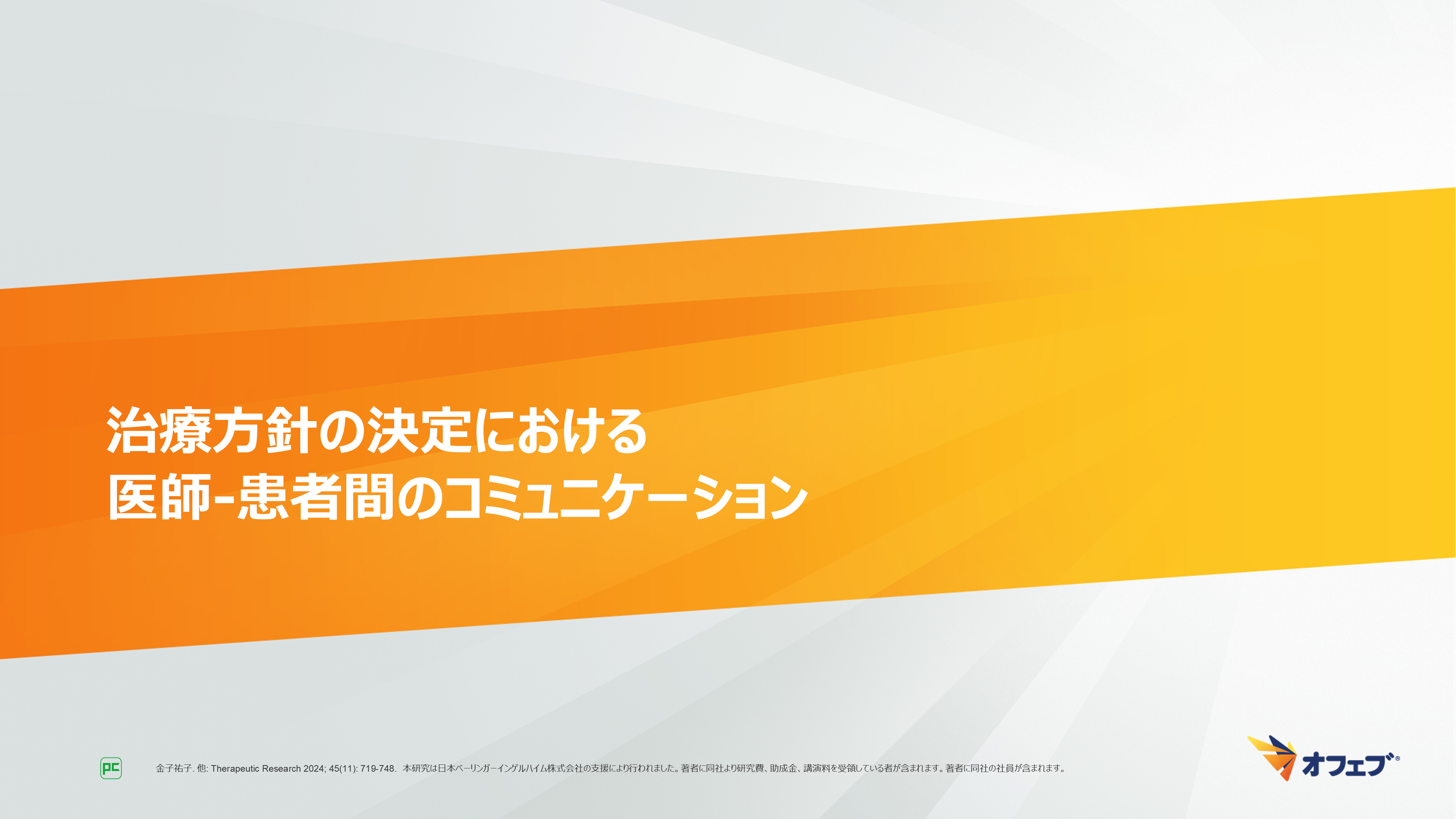 - 金子祐子. 他: Therapeutic Research 2024; 45(11): 719-748. 本研究は日本ベーリンガーインゲルハイム株式会社の支援により行われました。著者に同社より研究費、助成金、講演料を受領している者が含まれます。著者に同社の社員が含まれます。