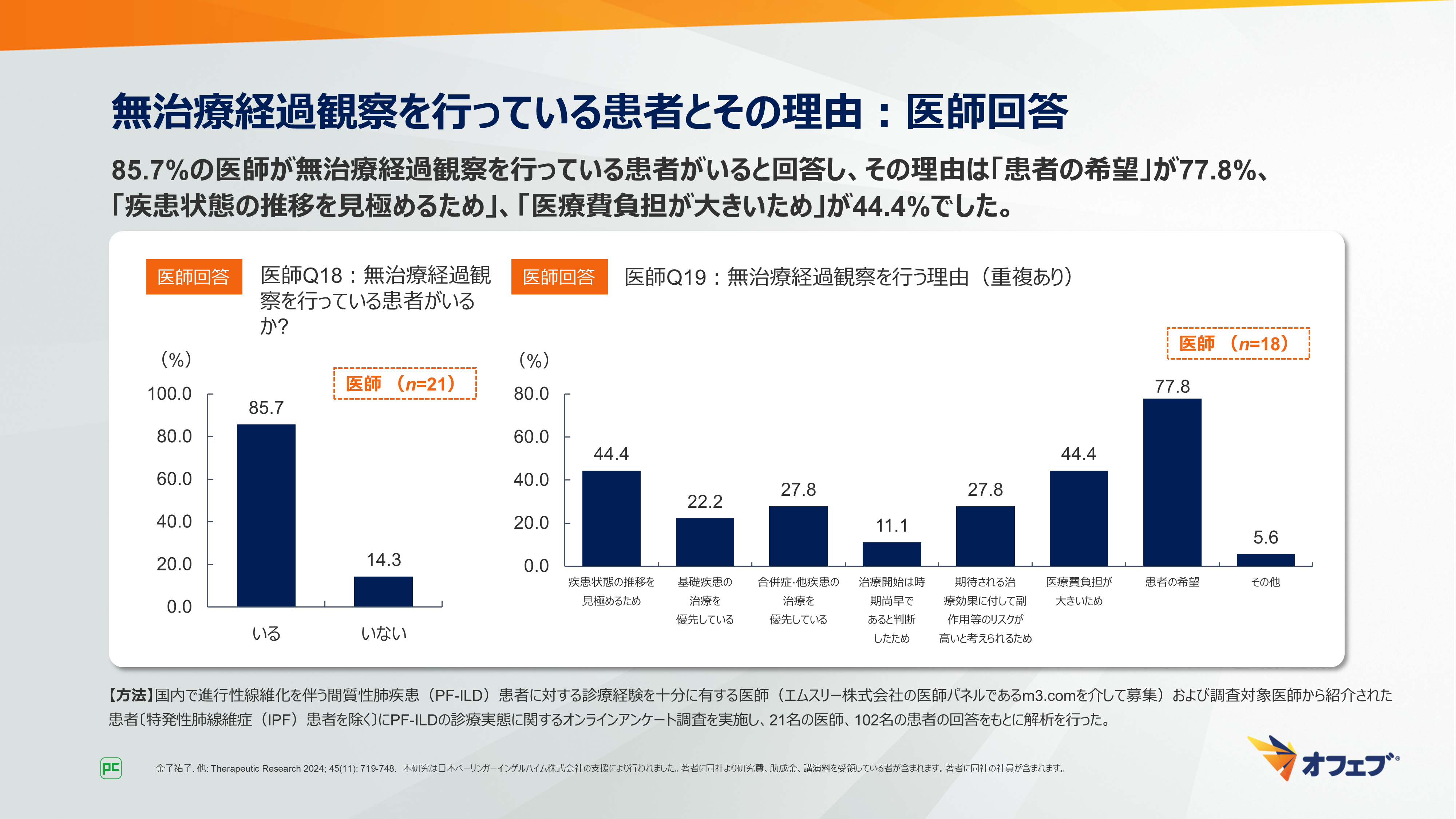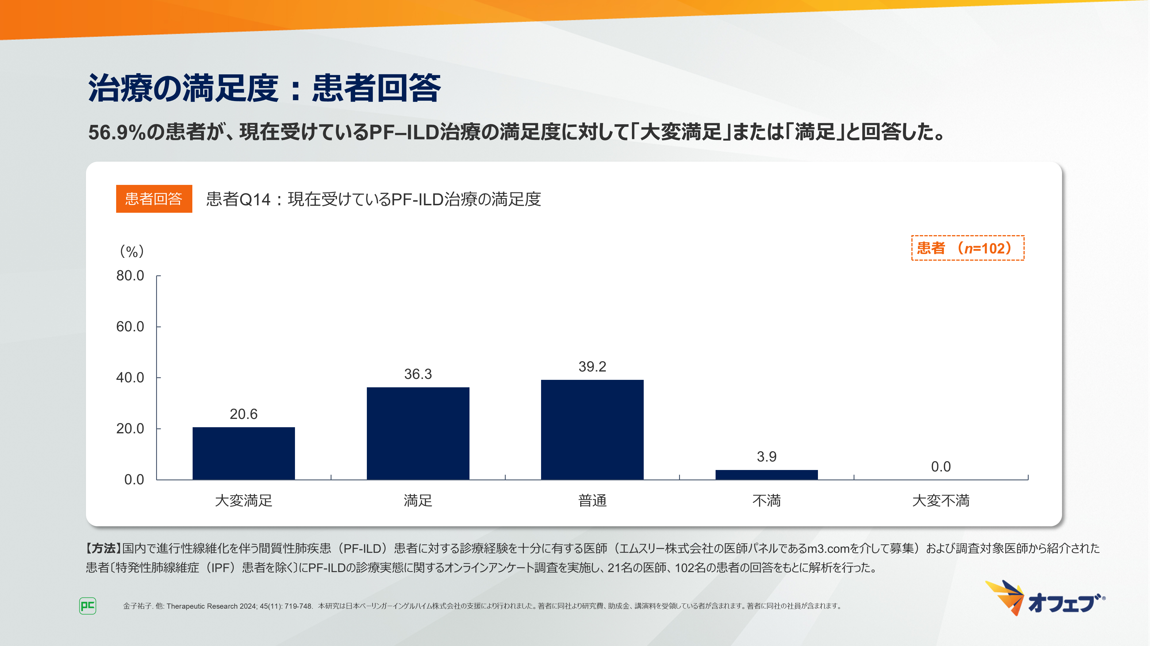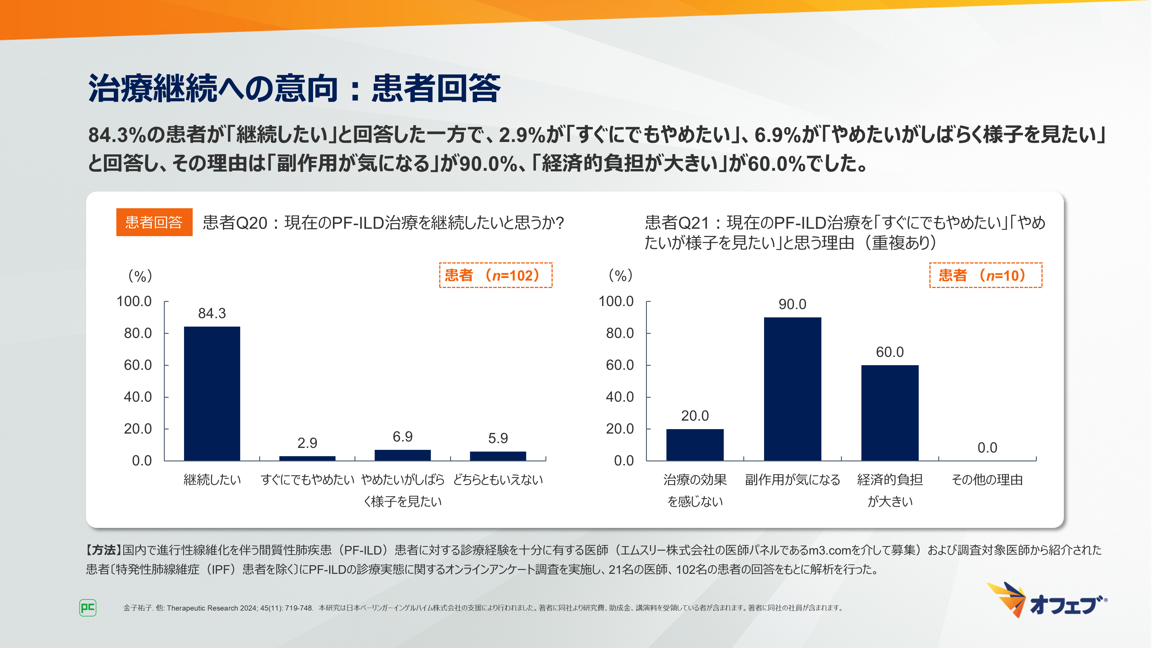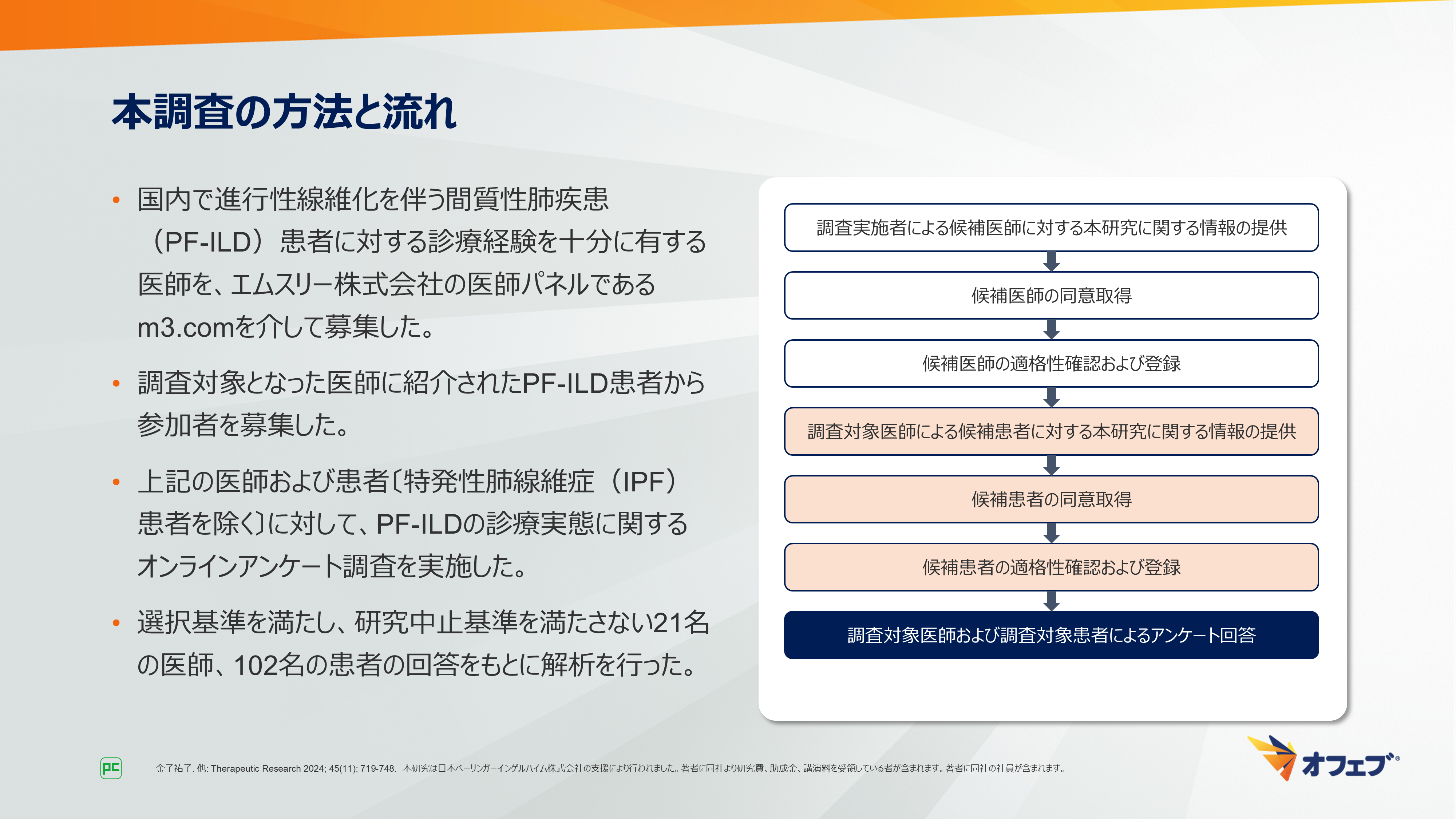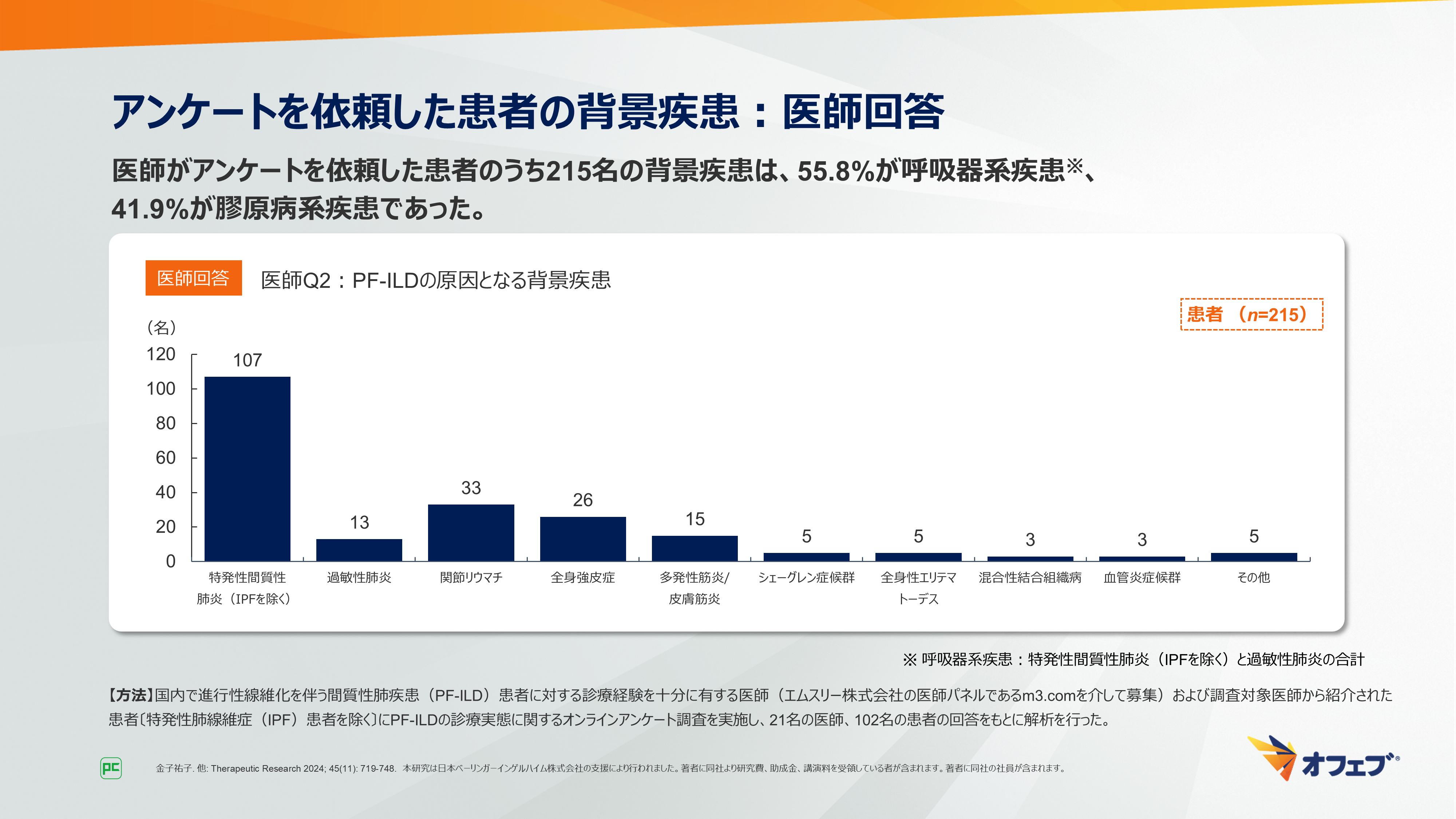 本調査では、国内で進行性線維化を伴う間質性肺疾患(PF-ILD)患者に対する診療経験を十分に有する医師を、エムスリー株式会社の医師パネルであるm3.comを介して募集し、調査対象となった医師に紹介されたPF-ILD患者から参加者を募集しました。これらの医師および患者〔特発性肺線維症(IPF)患者を除く〕に対して、PF-ILDの診療実態に関するオンラインアンケート調査を実施し、21名の医師、102名の患者の回答をもとに解析を行いました(図2)。