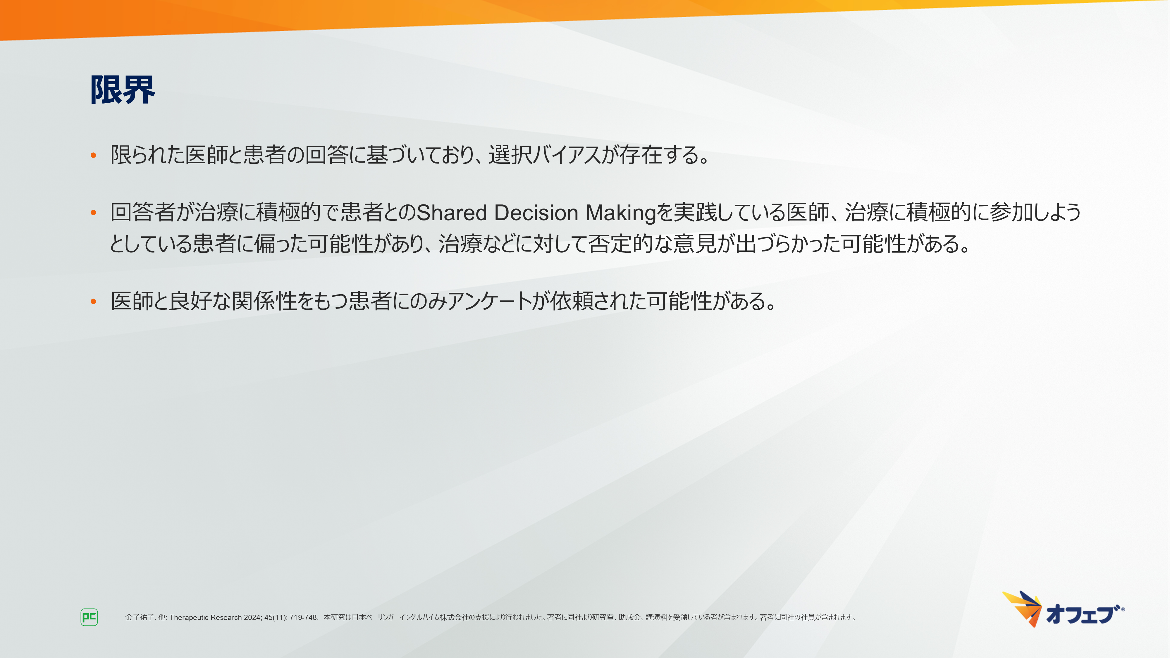 本調査の限界として、限られた医師と患者の回答に基づいており、選択バイアスが存在することがあげられます。回答者が治療に積極的で患者とのShared Decision Makingを実践している医師、治療に積極的に参加しようとしている患者に偏った可能性があり、治療などに対して否定的な意見が出づらかった可能性があります。また、医師と良好な関係性をもつ患者にのみアンケートが依頼された可能性があります(図3)。
