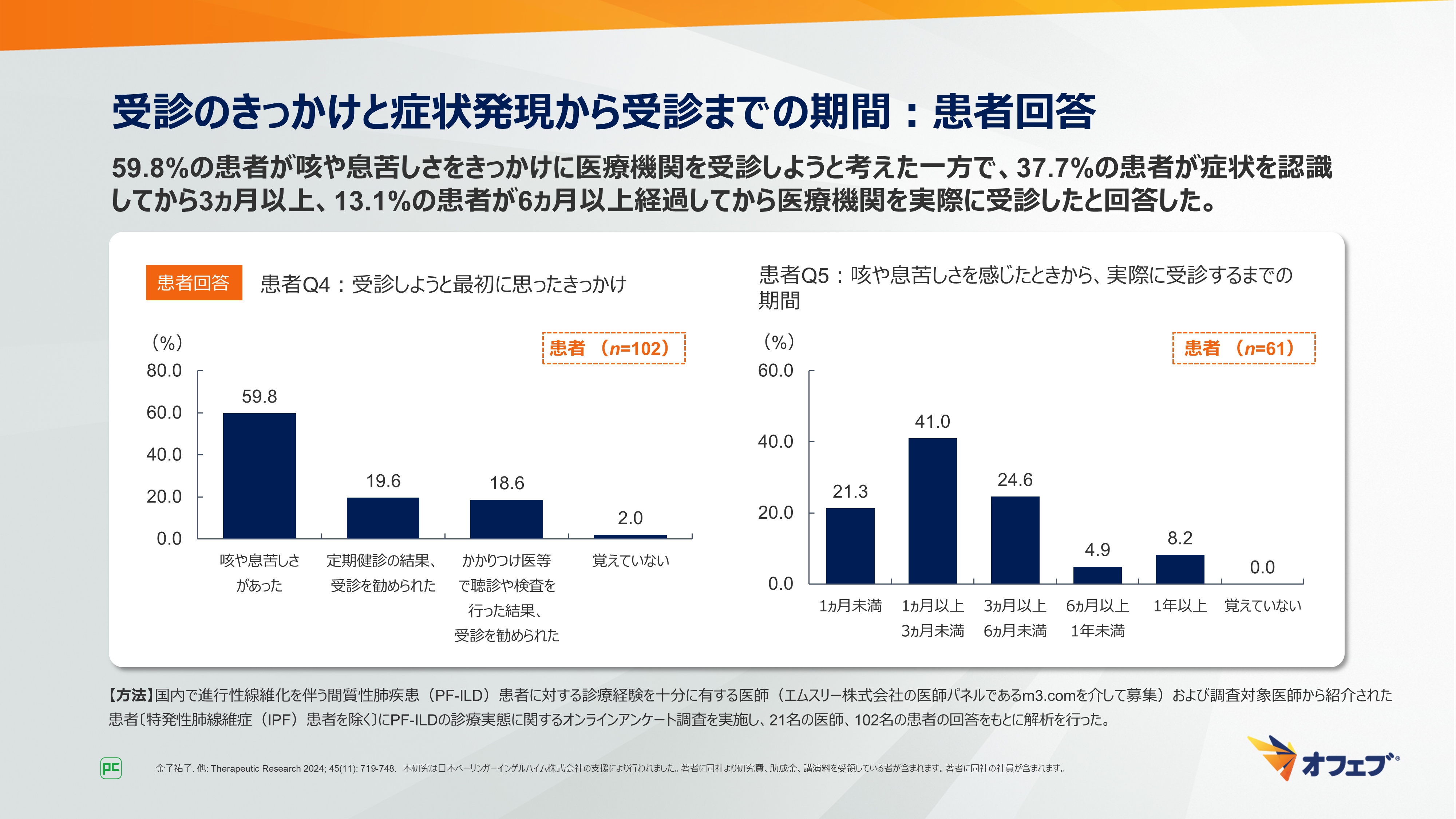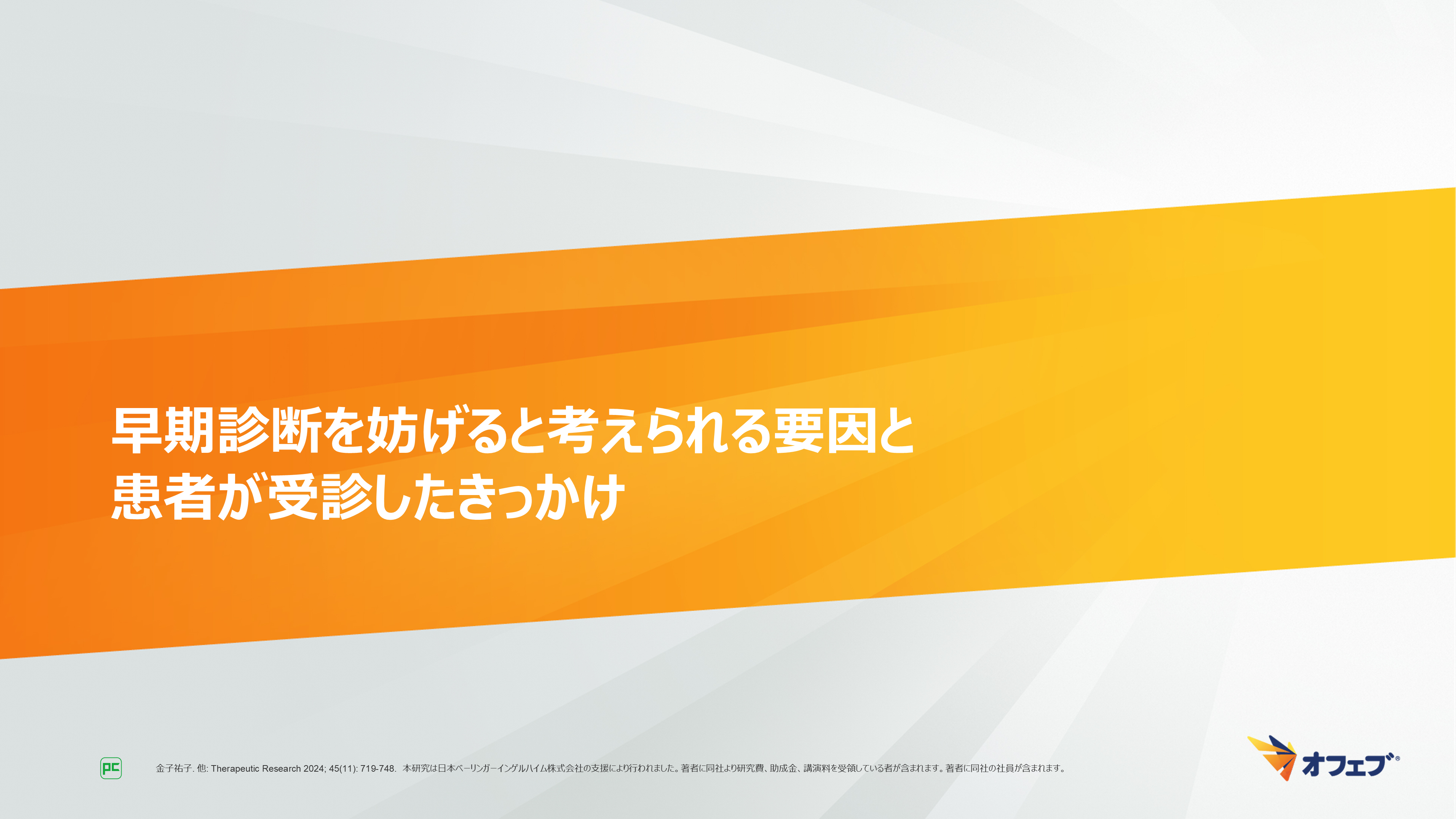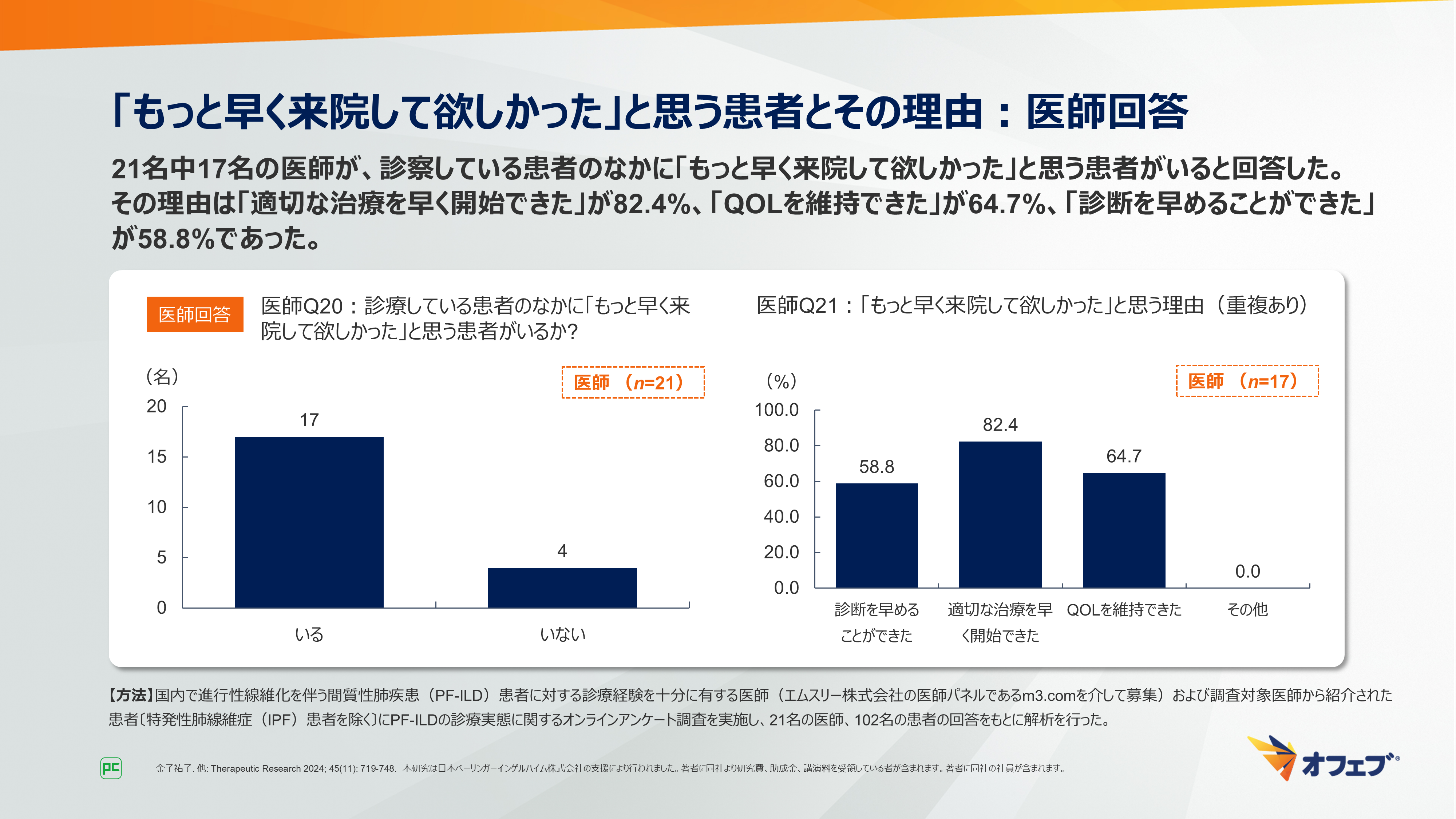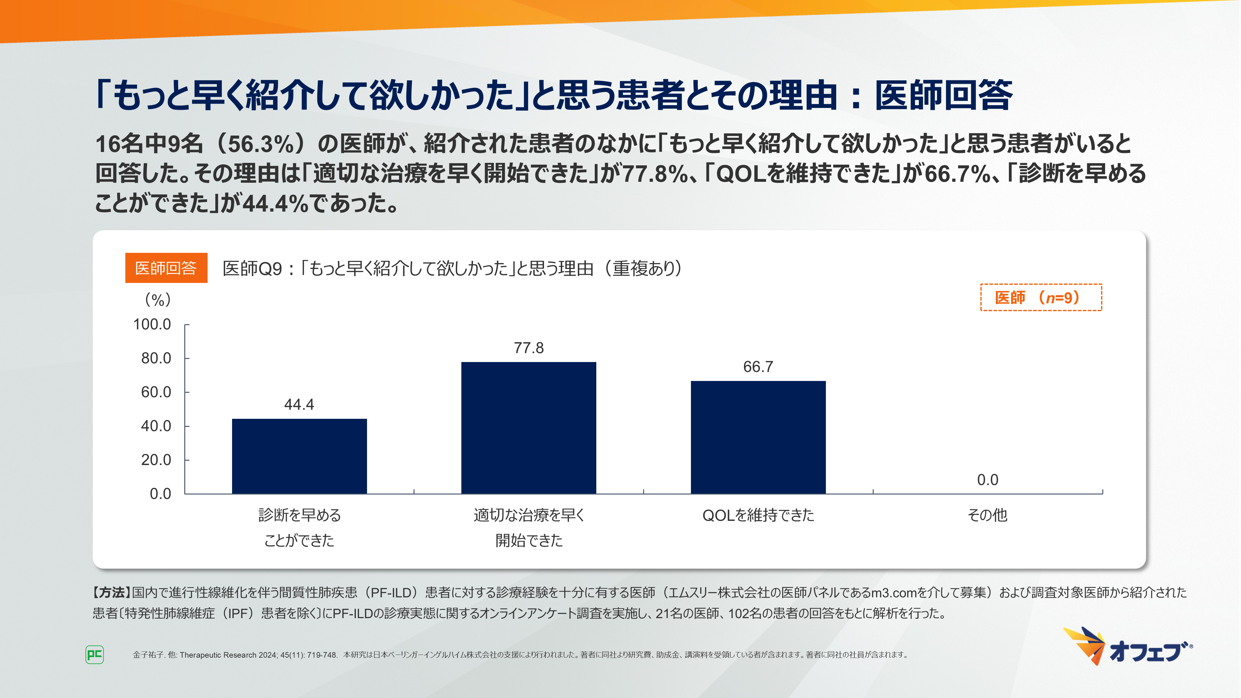 多くの医師は、早期診断・治療・QOLの維持につながるため、より早期に患者に来院して欲しい、また、より早期にかかりつけ医・非専門医に患者を紹介して欲しいと考えている可能性が示唆されました。