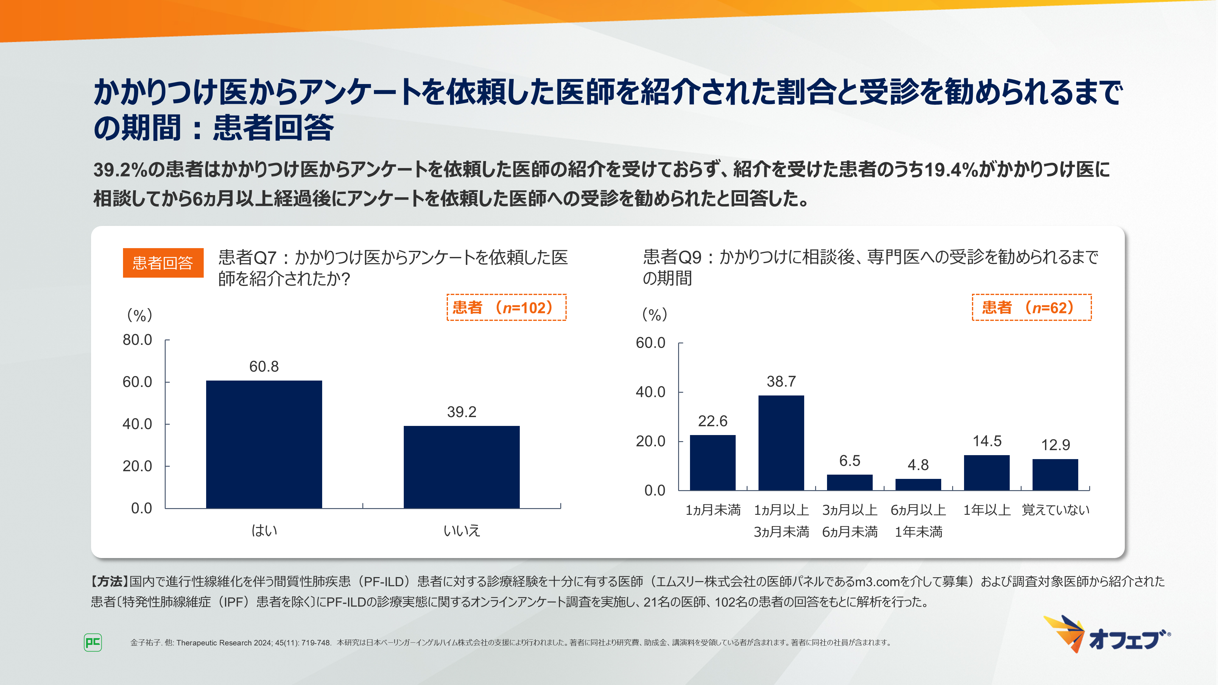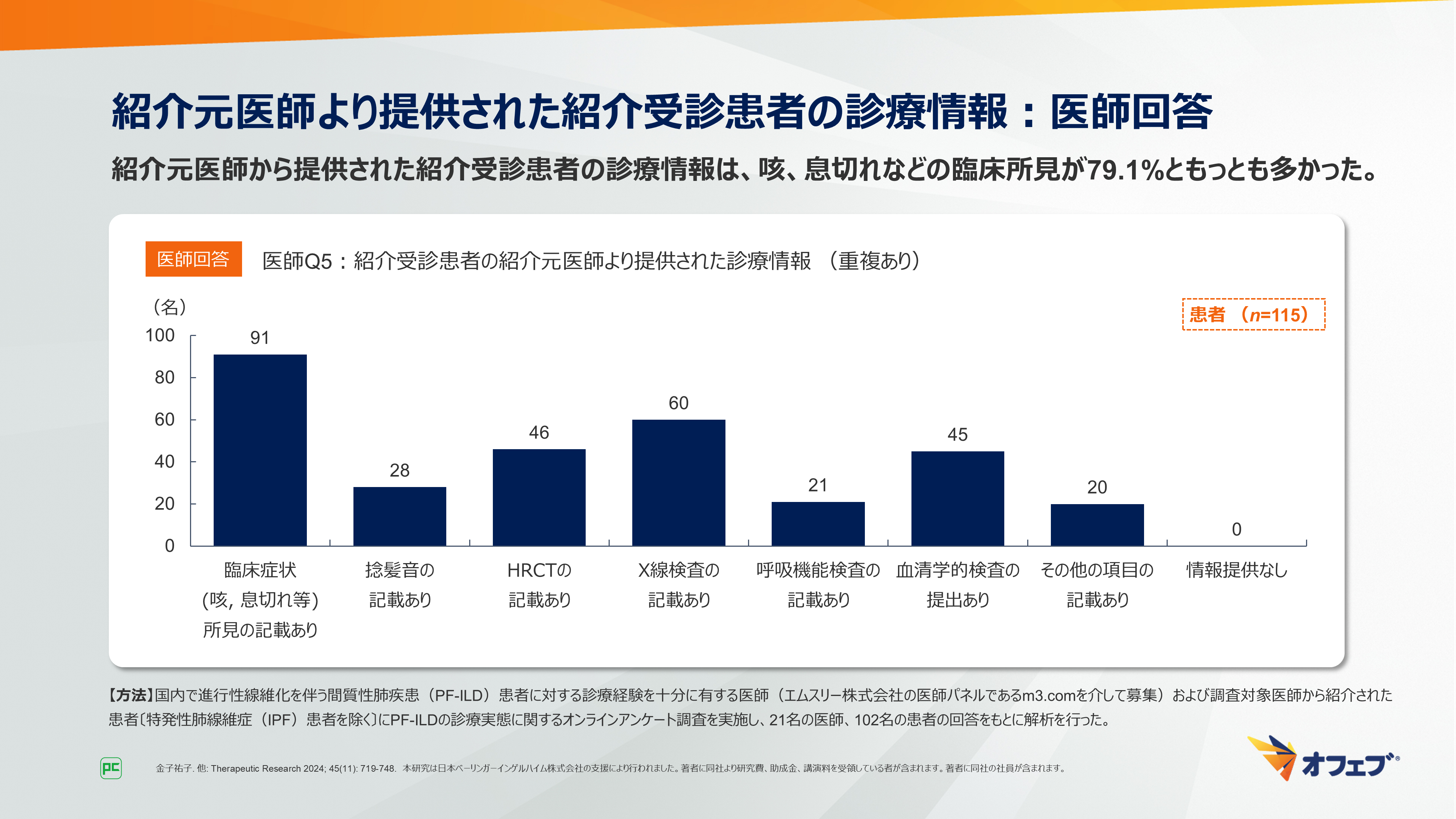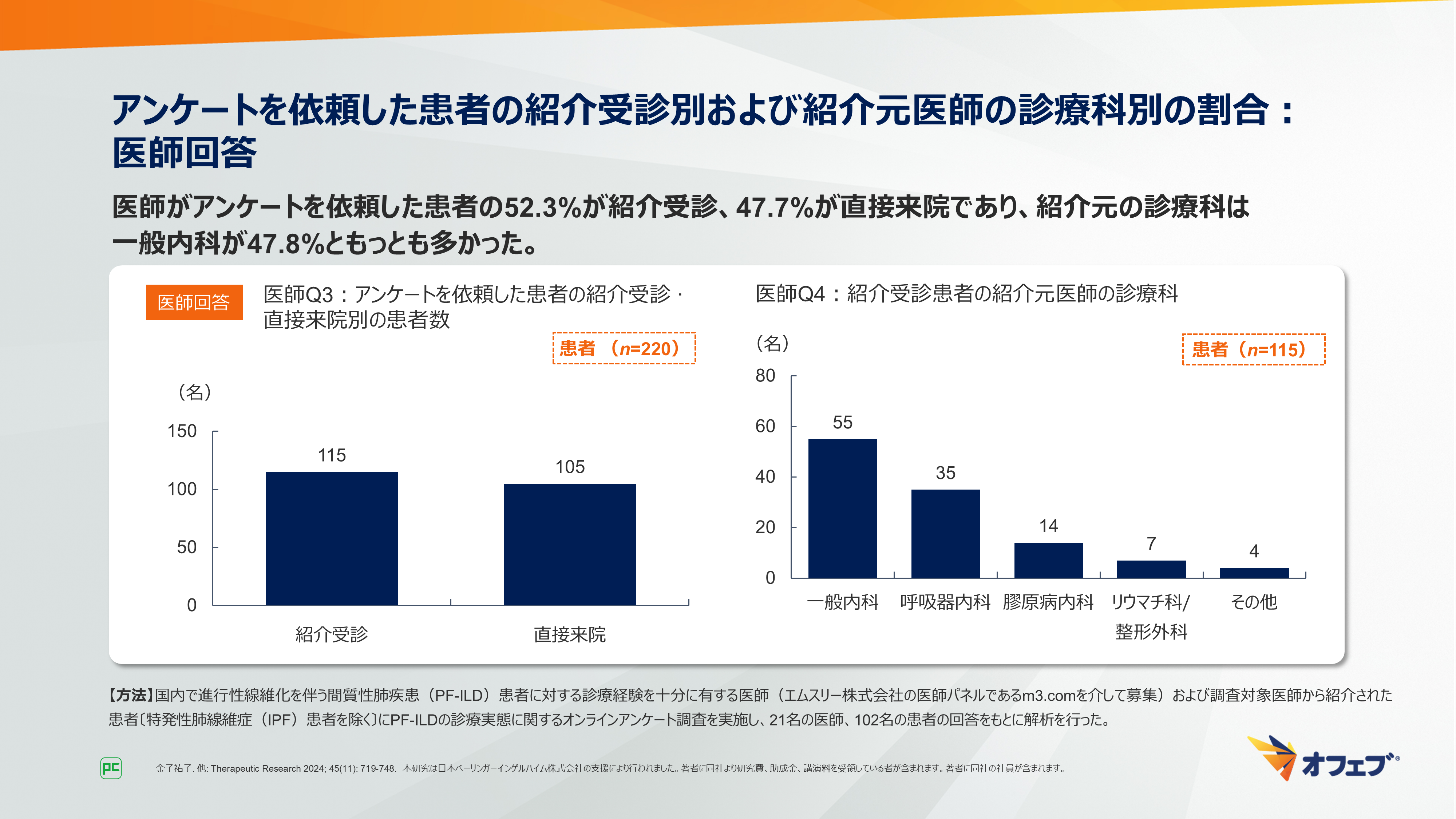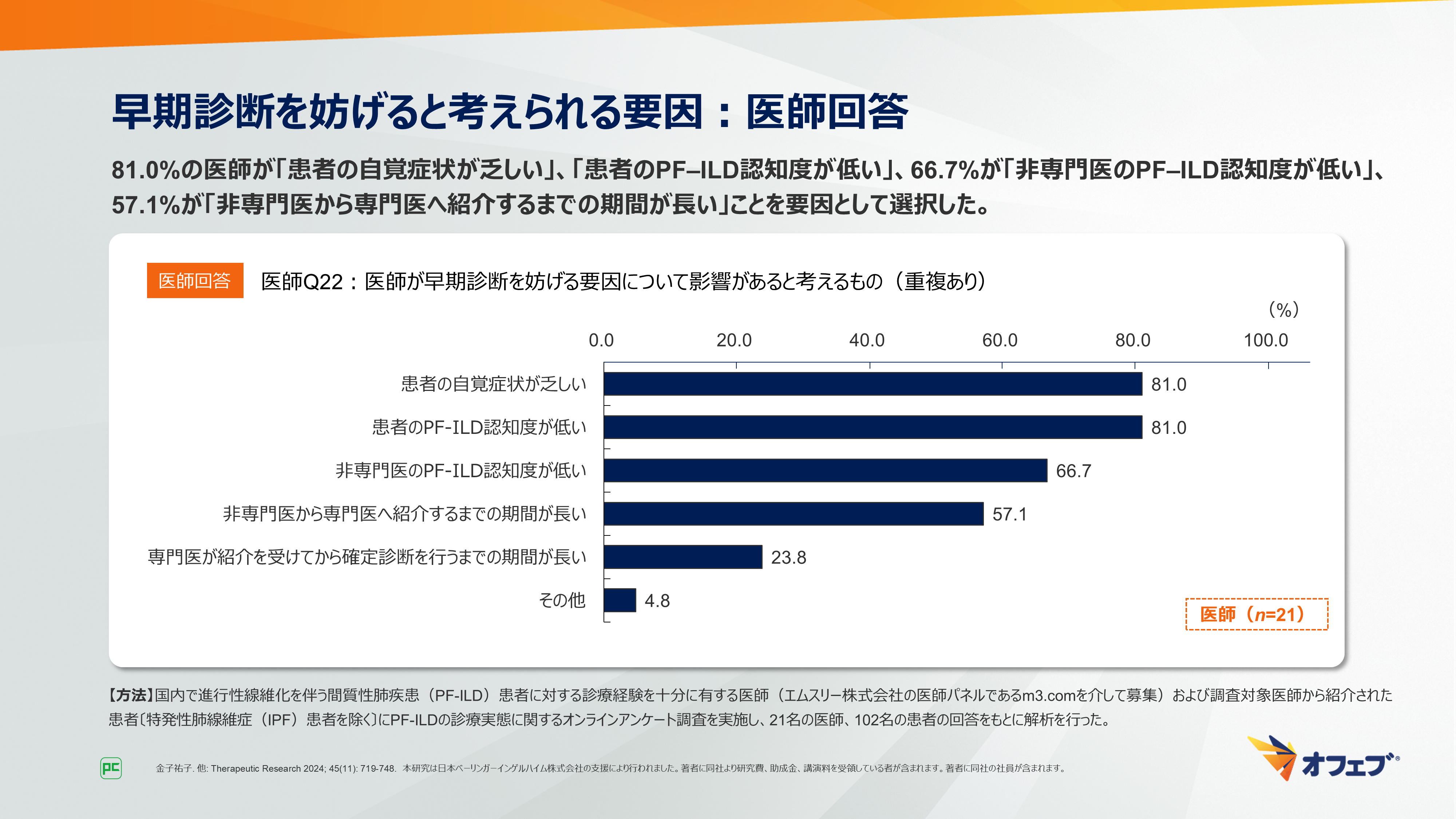 多くの医師は、早期診断・治療・QOLの維持につながるため、より早期に患者に来院して欲しい、また、より早期にかかりつけ医・非専門医に患者を紹介して欲しいと考えている可能性が示唆されました。