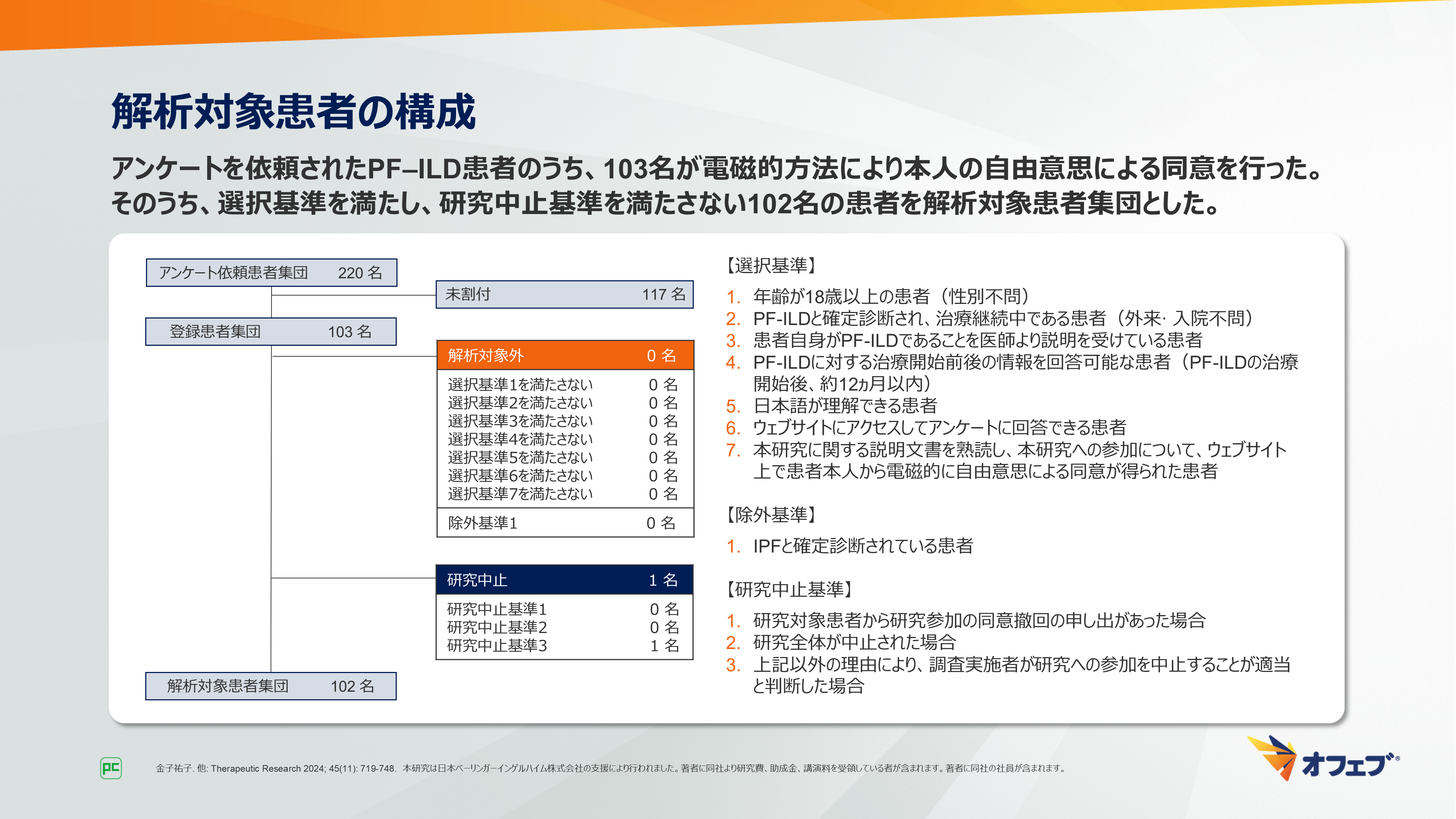 アンケート調査の解析対象患者の構成です。アンケートを依頼されたPF‒ILD患者のうち、103名が電磁的方法により本人の自由意思による同意を行いました。そのうち、選択基準を満たし、研究中止基準を満たさない102名の患者を解析対象患者集団としました(図11)。
