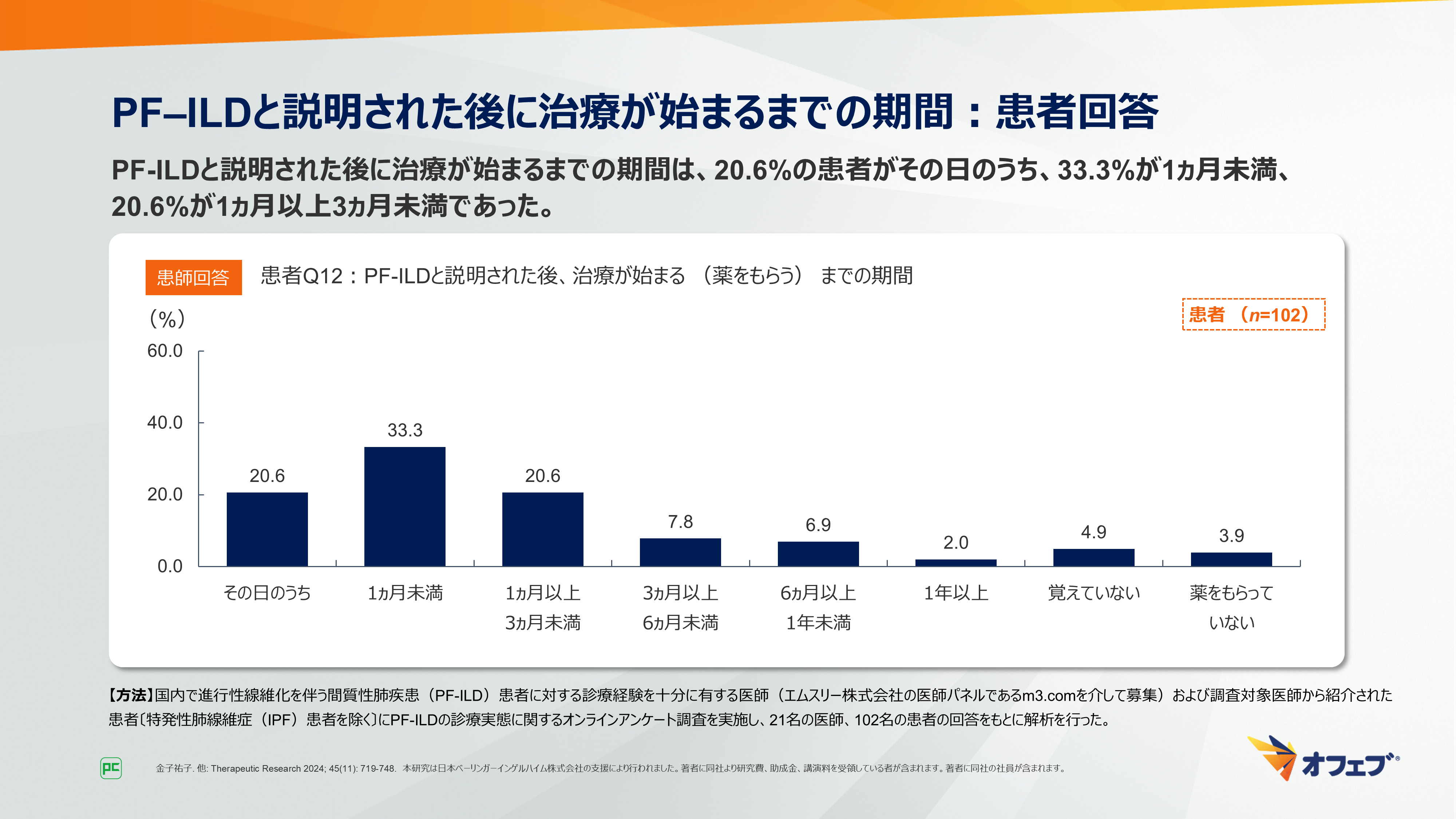PF-ILDと説明された後に治療が始まるまでの期間は、20.6%の患者がその日のうち、33.3%が1ヵ月未満、20.6%が1ヵ月以上3ヵ月未満でした(図14)。