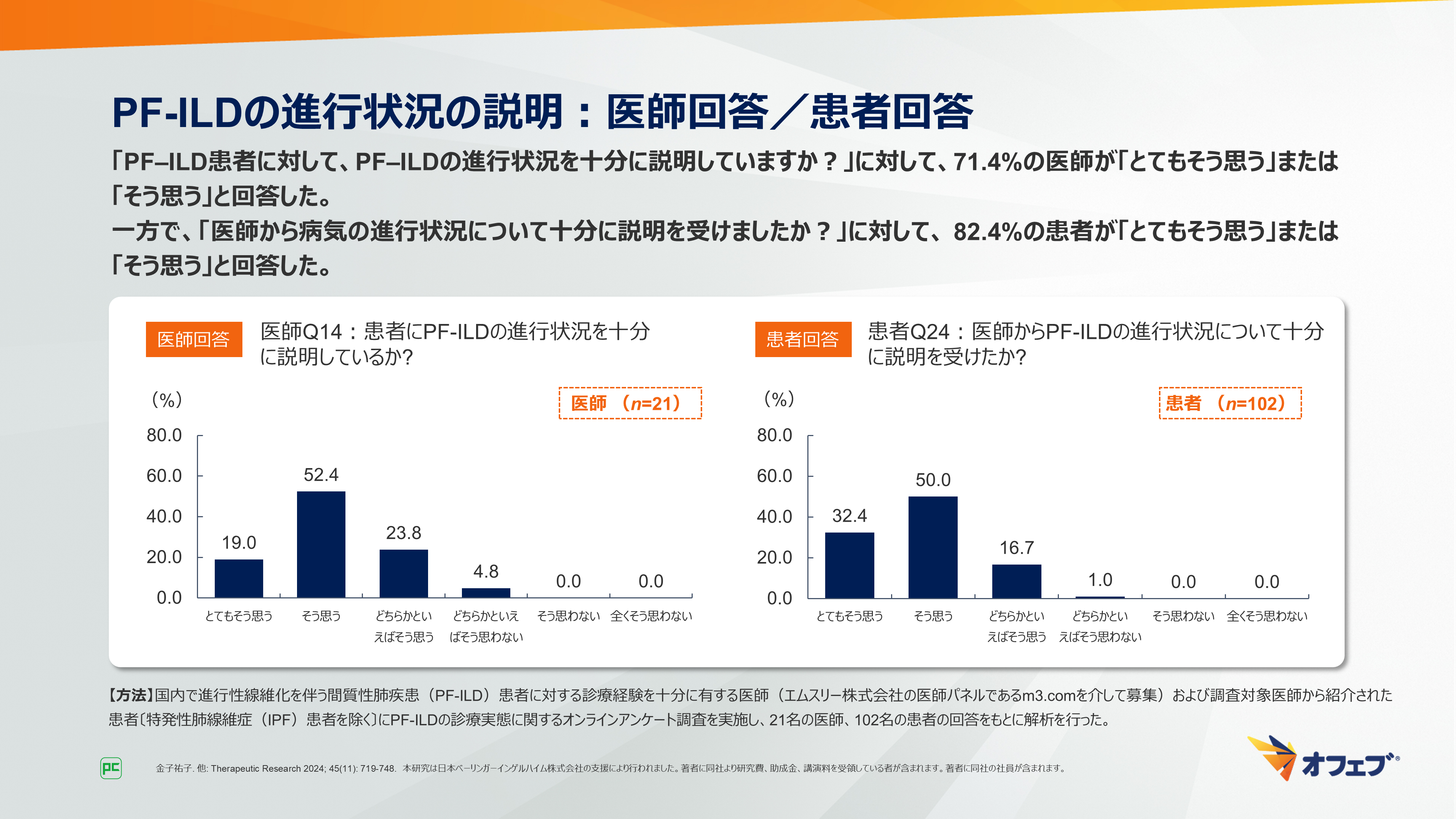 「PF‒ILD患者に対して、PF‒ILDの進行状況を十分に説明していますか?」という質問では、71.4%の医師が「とてもそう思う」または「そう思う」と回答しました。