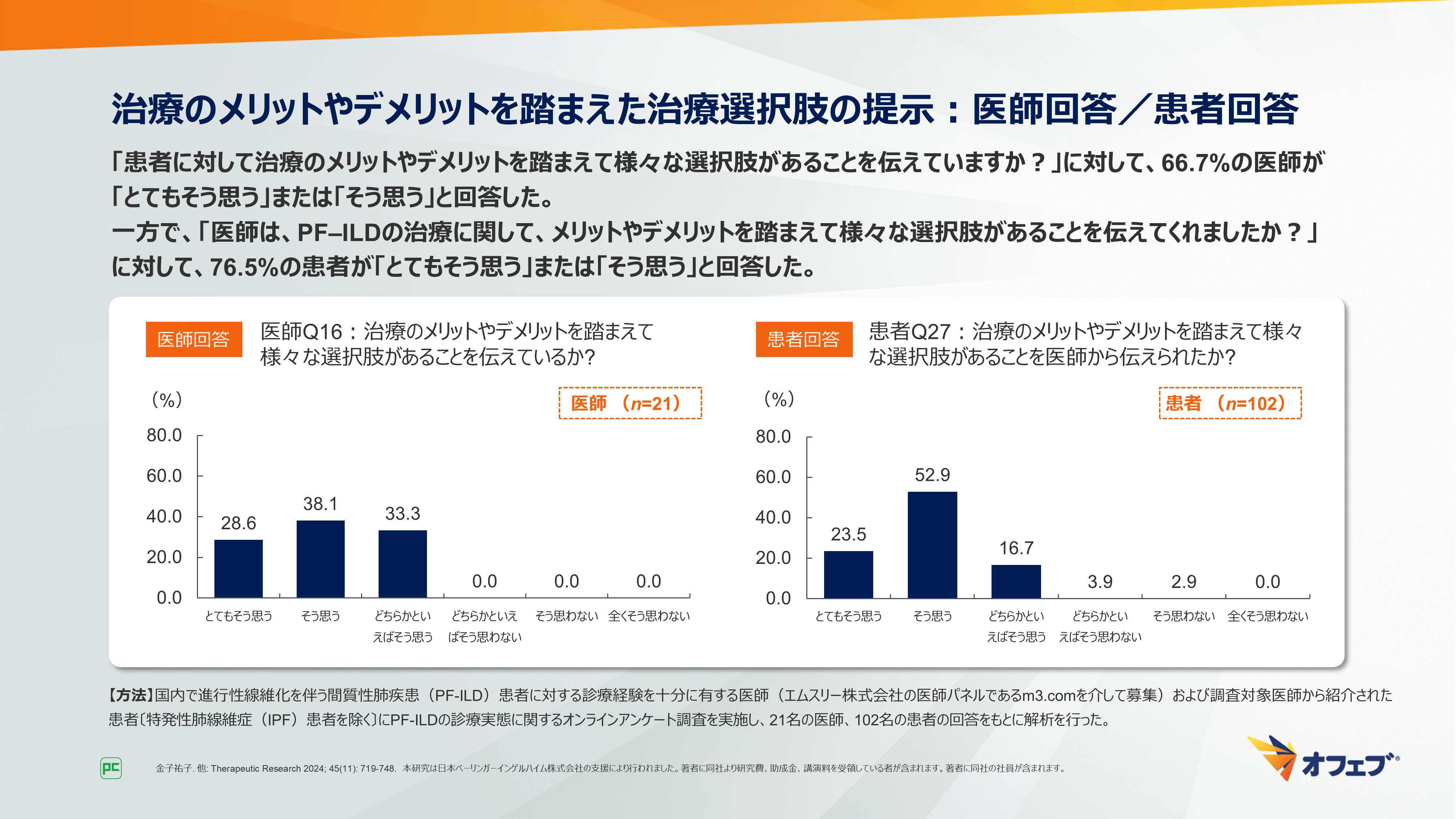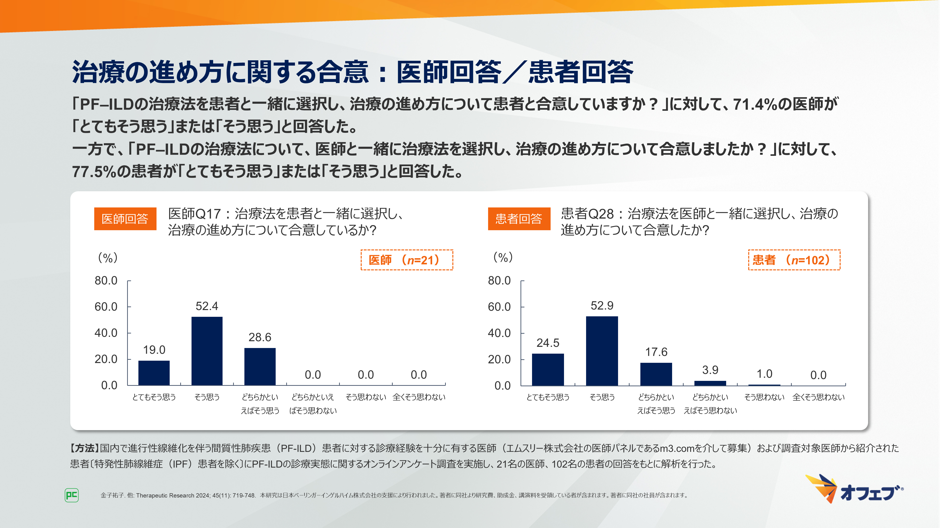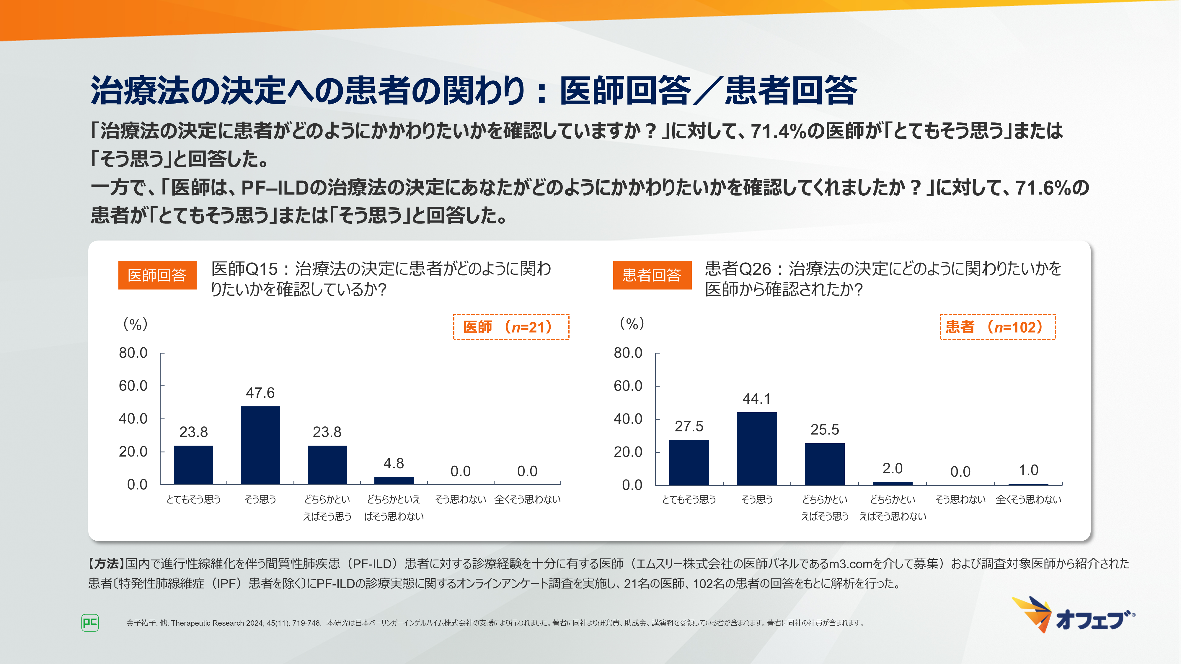 「PF‒ILDの治療法を患者と一緒に選択し、治療の進め方について患者と合意していますか?」という質問では、71.4%の医師が「とてもそう思う」または「そう思う」と回答しました。