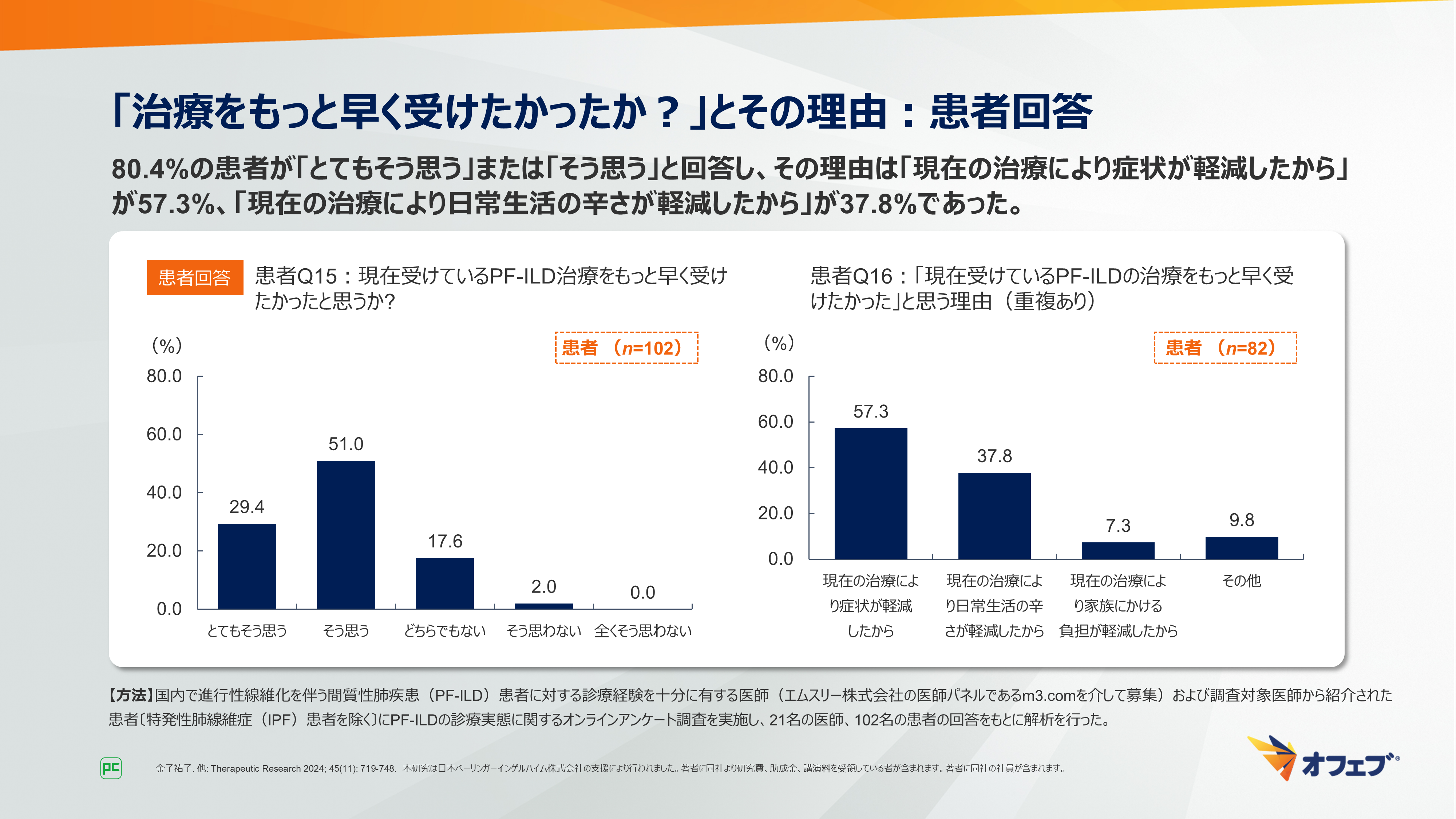 治療を受けた患者の多くは治療に対する満足度が高く、もっと早く治療を受けたかったと考えている可能性が示唆されました。