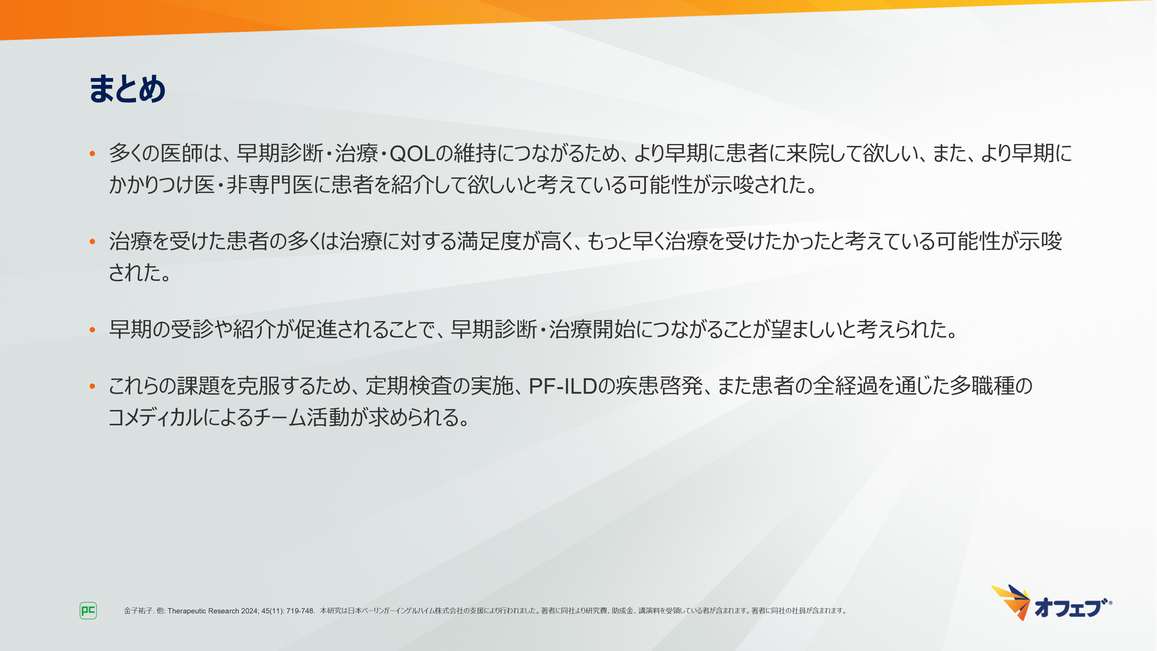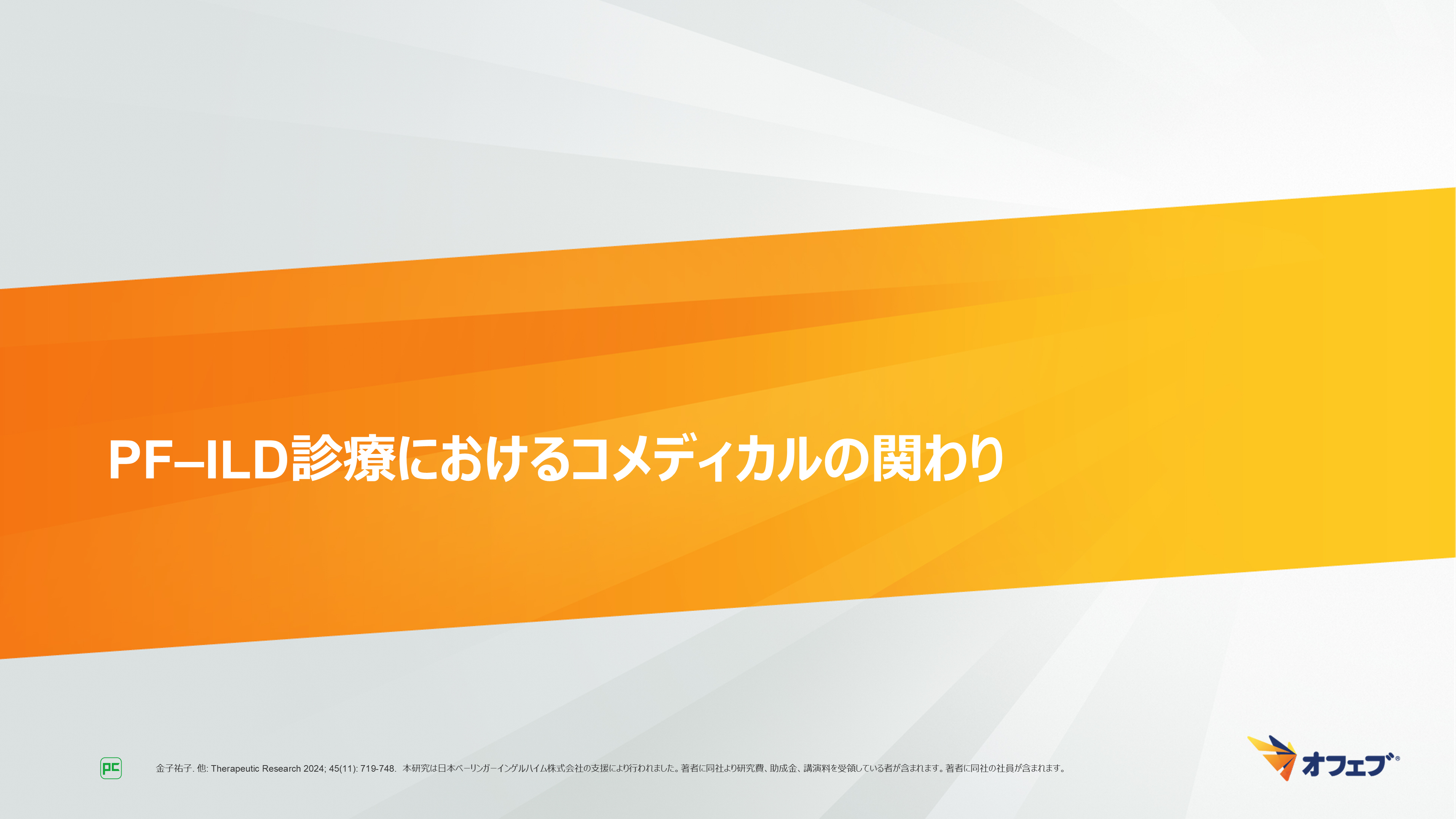 これらの課題を克服するため、定期検査の実施、PF-ILDの疾患啓発、また患者の全経過を通じた多職種のコメディカルによるチーム活動が求められます。