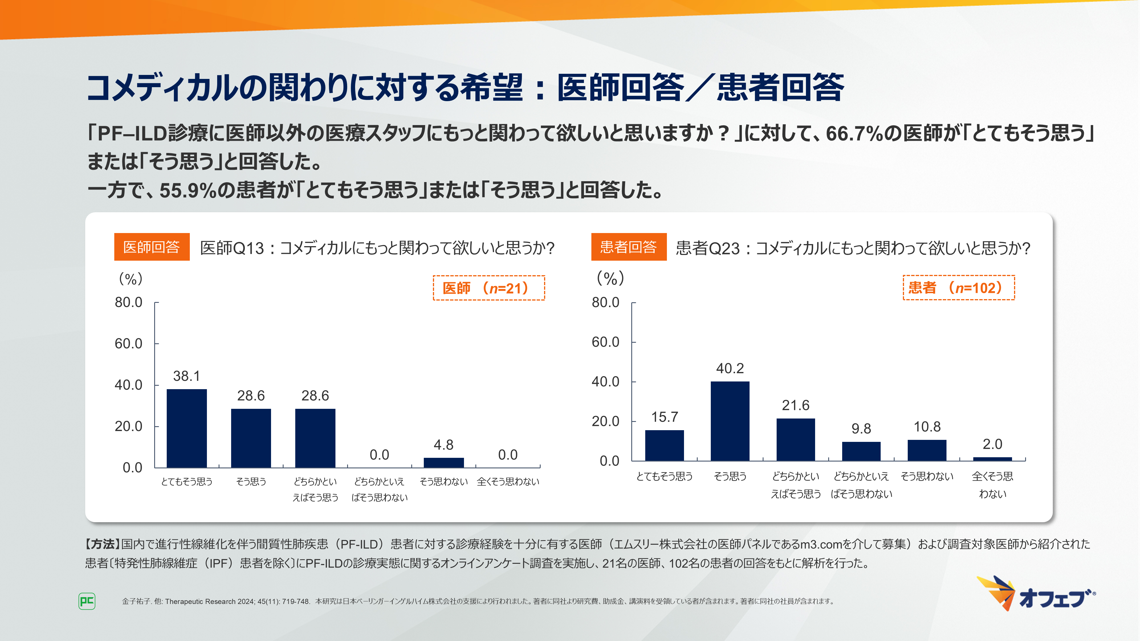 「PF‒ILD診療に医師以外の医療スタッフにもっと関わって欲しいと思いますか?」という質問では、66.7%の医師が「とてもそう思う」または「そう思う」と回答しました。