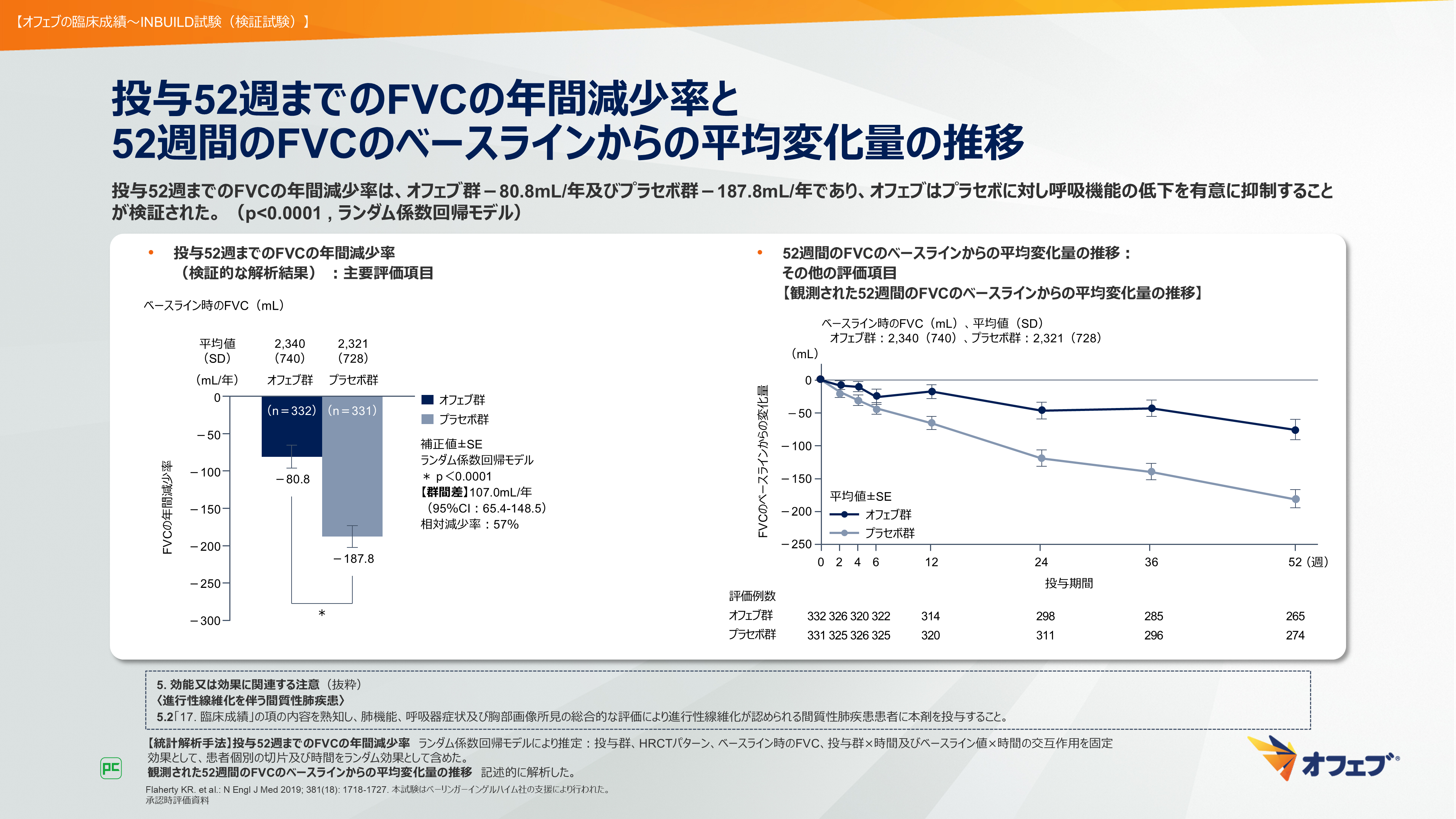 本試験の結果、投与52週までのFVCの年間減少率は、オフェブ群-80.8mL/年及びプラセボ群-187.8mL/年であり、オフェブはプラセボに対し呼吸機能の低下を有意に抑制することが検証されました(図43左)。
