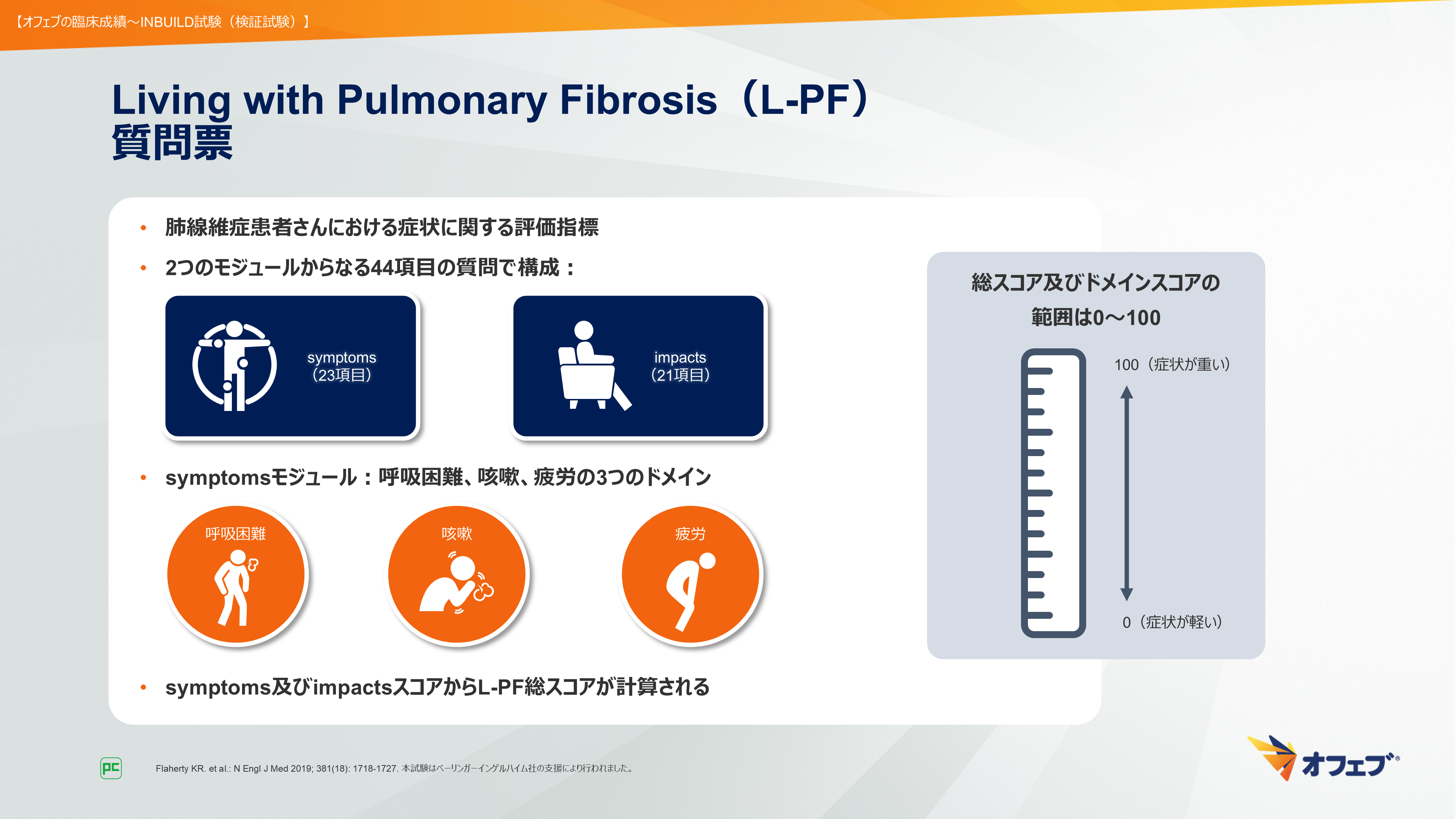 本試験では、オフェブの呼吸器症状に対する影響について、L-PFスコアを用いて検討されました。L-PFスコアは、肺線維症患者さんにおける症状に関する評価指標であり、symptomsとimpactsという2つのモジュールからなる44項目の質問で構成されます。なお、symptomsモジュールは、呼吸困難、咳嗽、疲労の3つのドメインで構成されています。symptoms及びimpactsスコアからL-PF総スコアが計算されます。