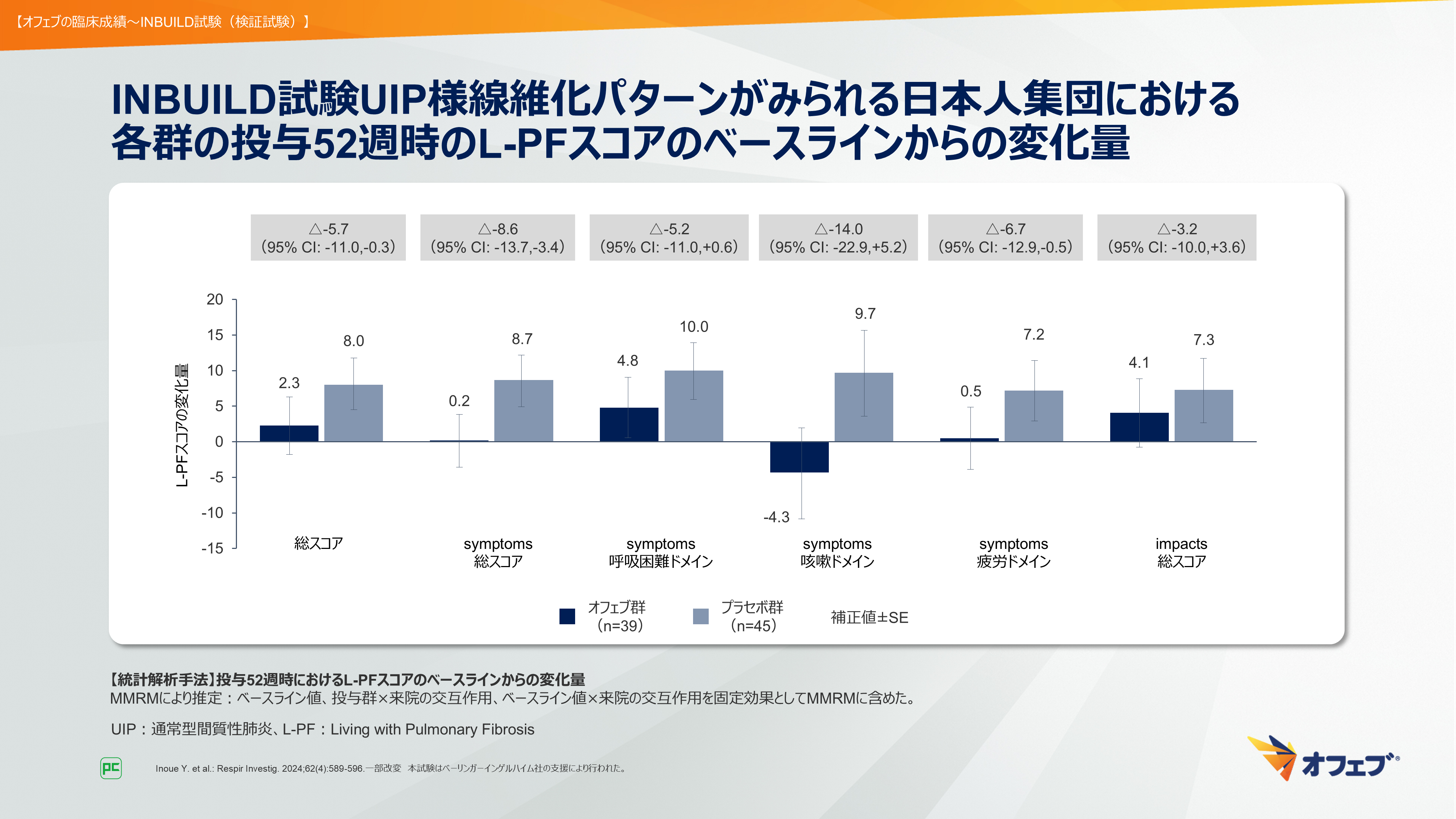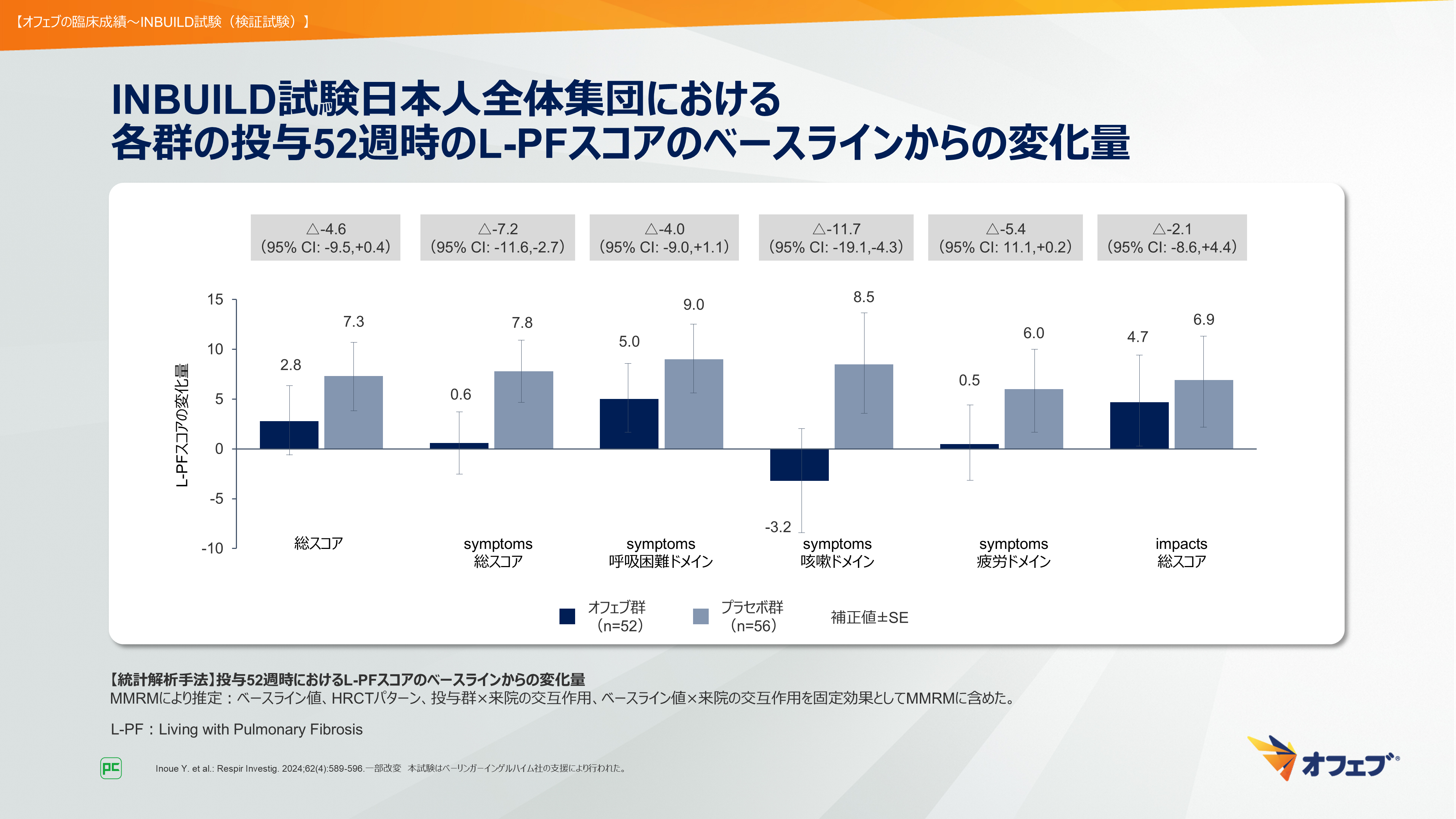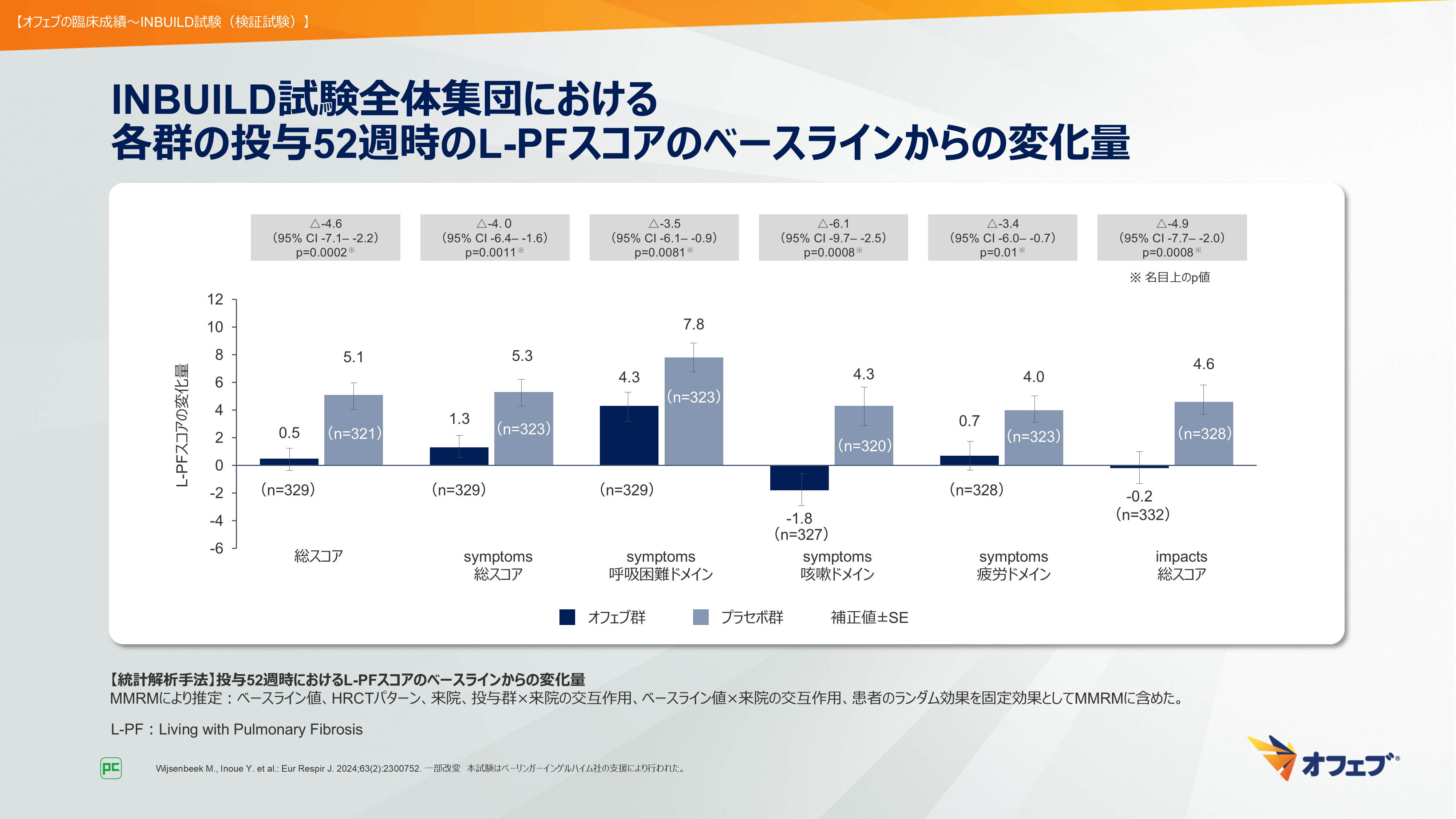 図に、日本人全体集団における投与52週時のL-PFスコアのベースラインからの変化量をお示しします。日本人全体集団においても、INBUILD試験全体集団と同様に、オフェブ群でsymptoms咳嗽ドメインスコアの減少が認められました。