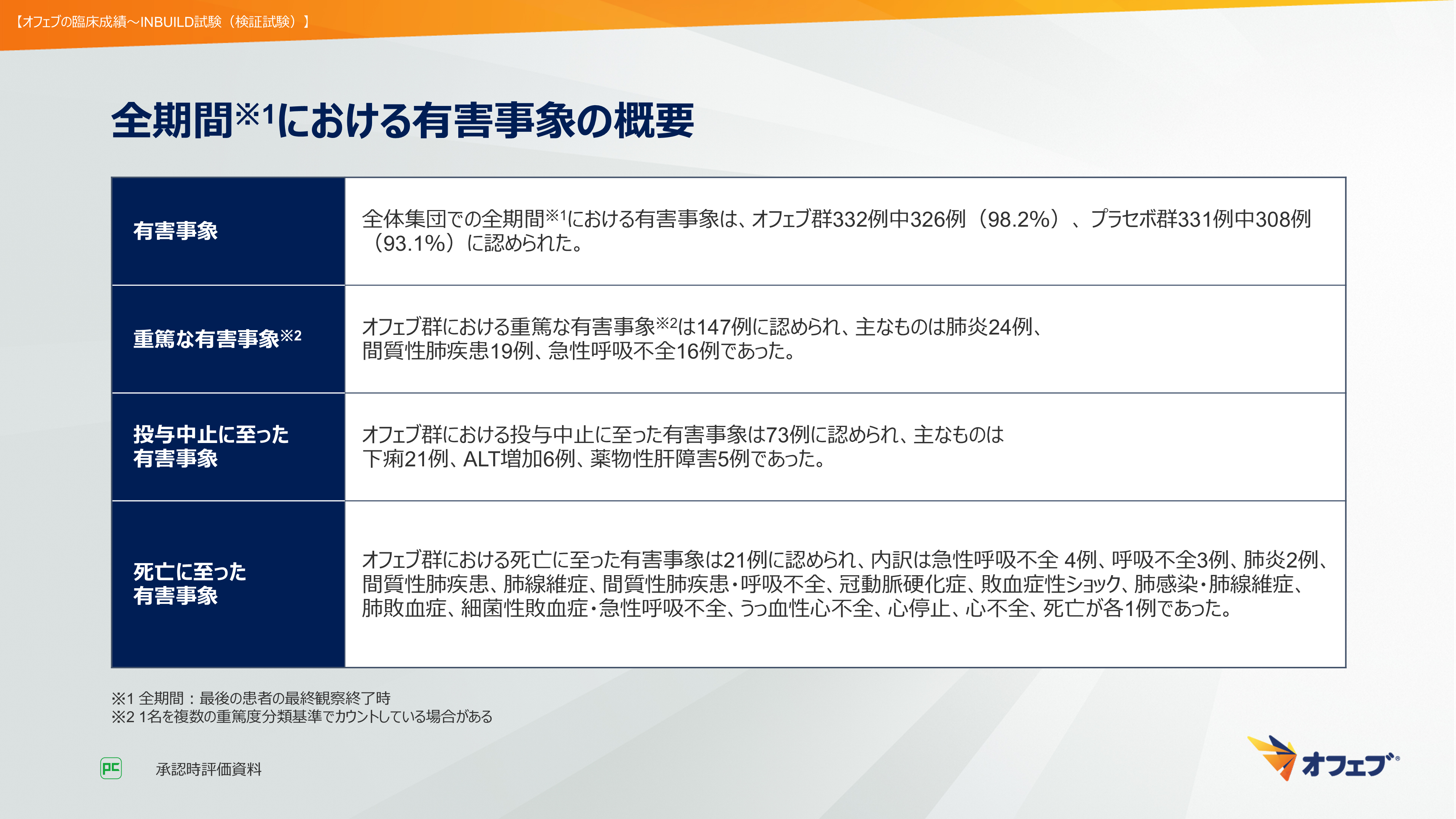 本試験の全期間における有害事象は、オフェブ群で326例(98.2%)、プラセボ群で308例(93.1%)に認められました。オフェブ群における重篤な有害事象として主なものは肺炎24例、間質性肺疾患19例、急性呼吸不全16例などでした。オフェブ群において投与中止に至った有害事象は下痢21例、ALT増加6例、薬物性肝障害5例などであり、死亡に至った有害事象は、急性呼吸不全4例、呼吸不全3例などでした(図48)。