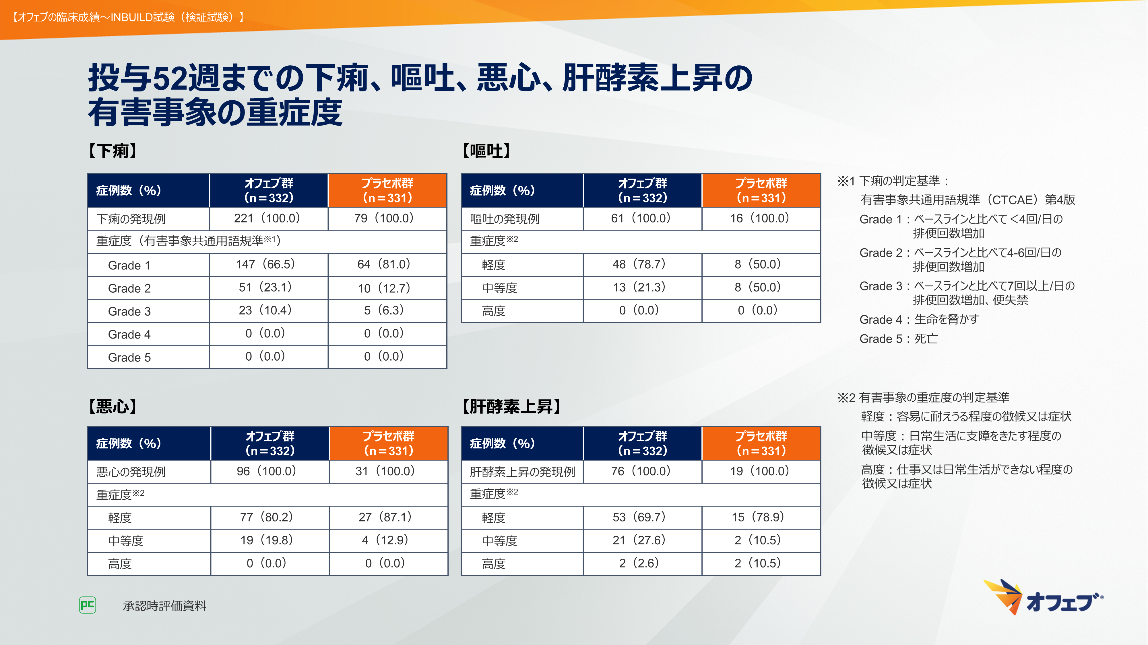 続いて、投与52週までの下痢、嘔吐、悪心、肝酵素上昇の有害事象の重症度をお示しします。オフェブ群において、下痢は、有害事象共通用語規準を用いた評価ではGrade 1が66.5%、Grade 2が23.1%、Grade 3が10.4%でした。嘔吐と悪心、肝酵素上昇は有害事象の重症度の判定基準を用いて評価しています。嘔吐は軽度が78.7%、中等度が21.3%、悪心は軽度が80.2%、中等度が19.8%、でした。肝酵素上昇は軽度が69.7%、中等度が27.6%、高度が2.6%でした(図50)。