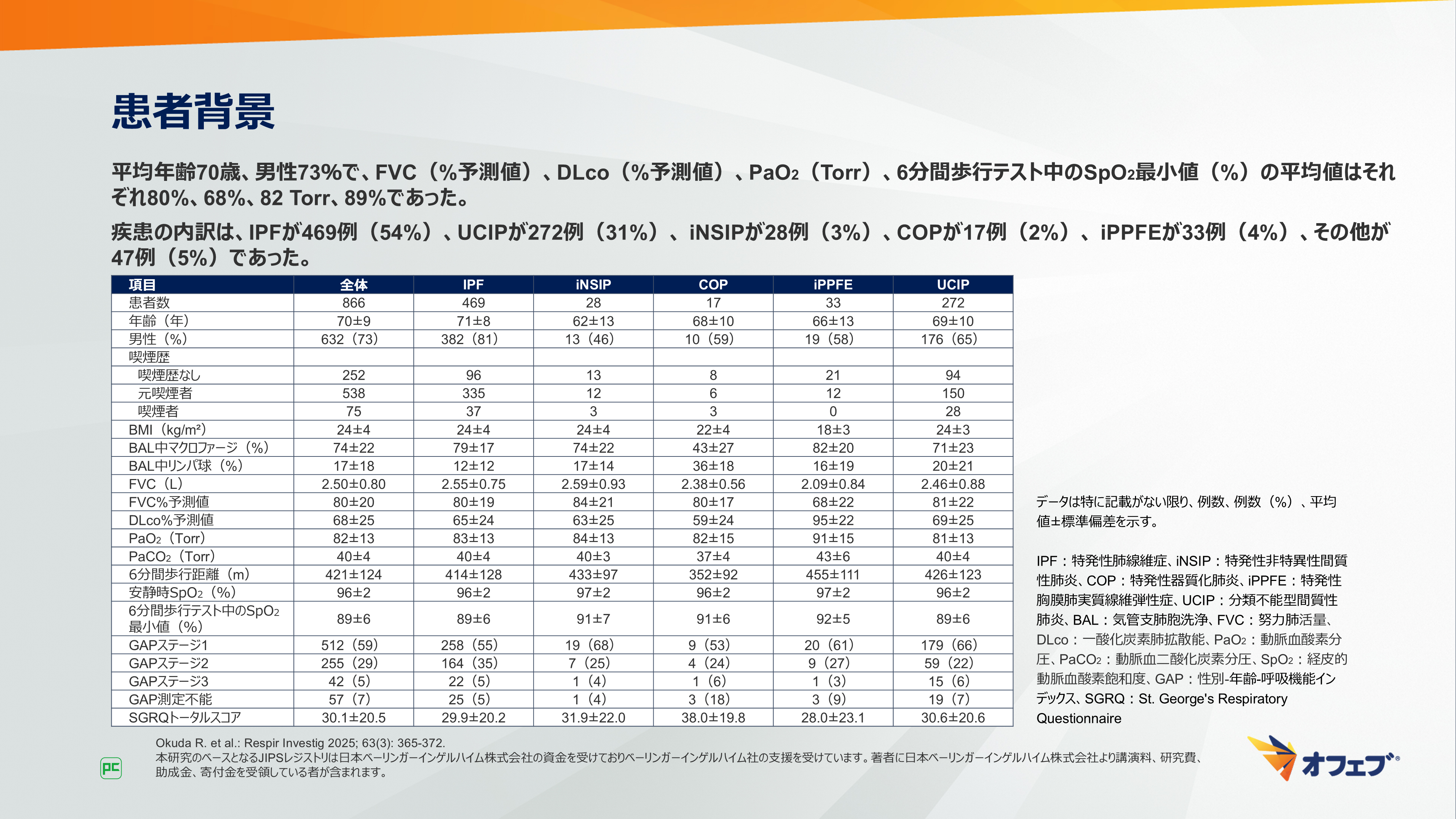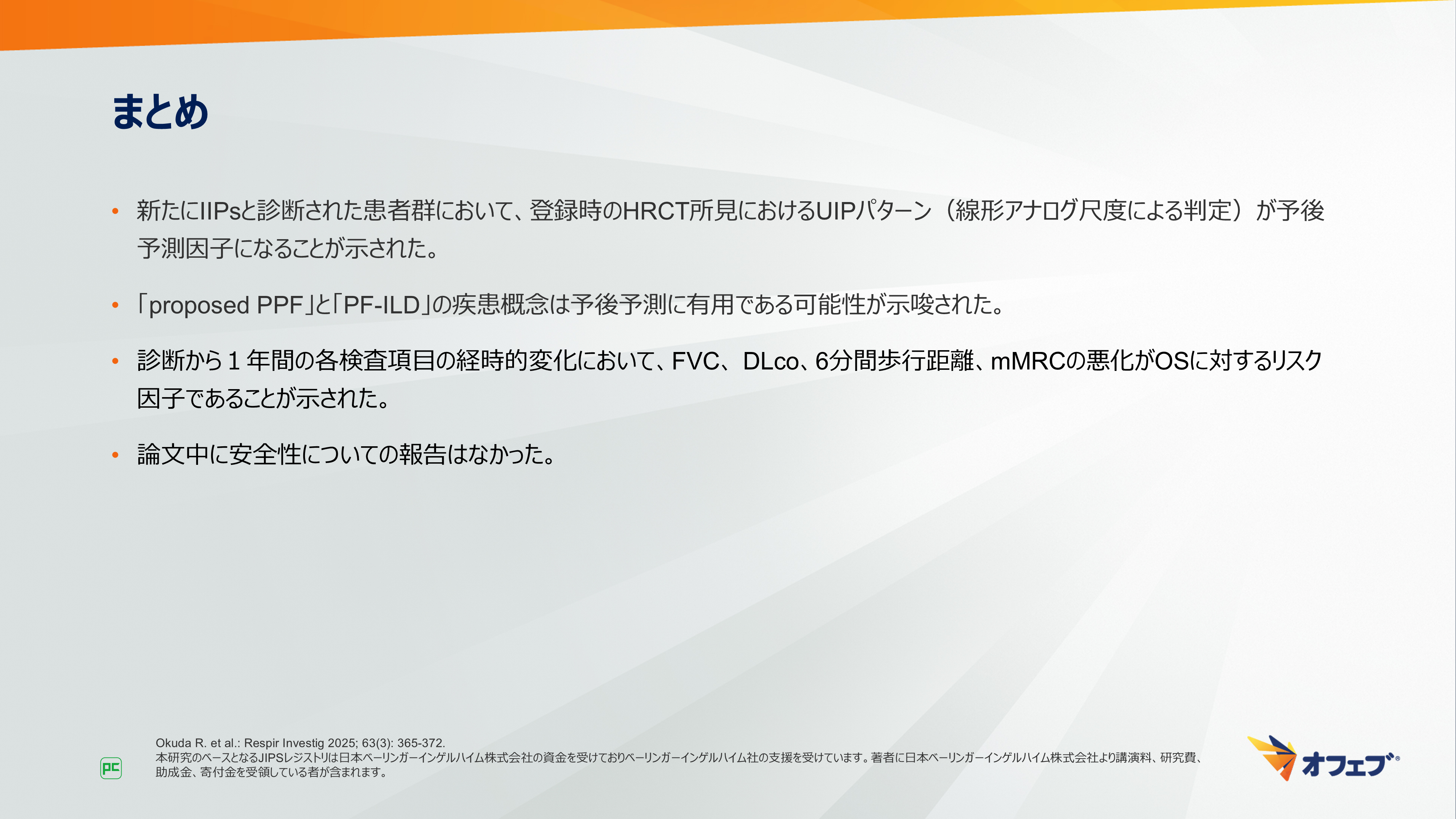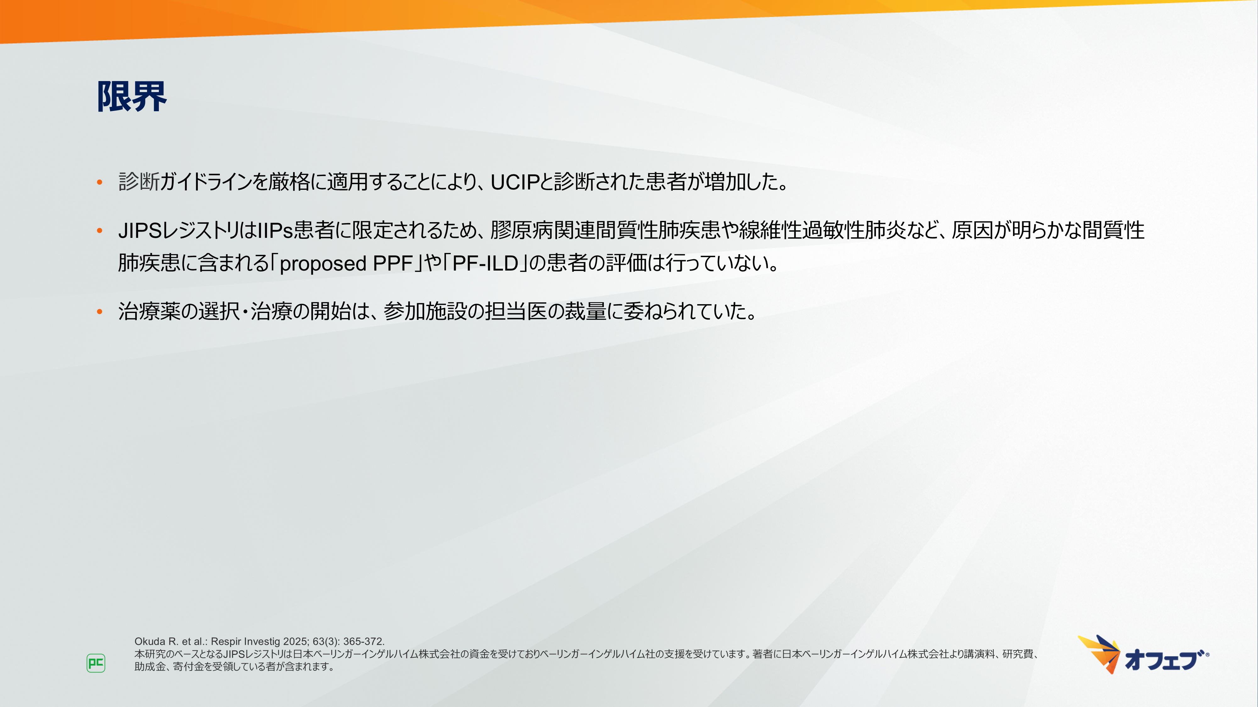 - Okuda R. et al.: Respir Investig 2025; 63(3): 365-372. 本研究のベースとなるJIPSレジストリは日本ベーリンガーインゲルハイム株式会社の資金を受けておりベーリンガーインゲルハイム社の支援を受けています。著者に日本ベーリンガーインゲルハイム株式会社より講演料、研究費、助成金、寄付金を受領している者が含まれます。