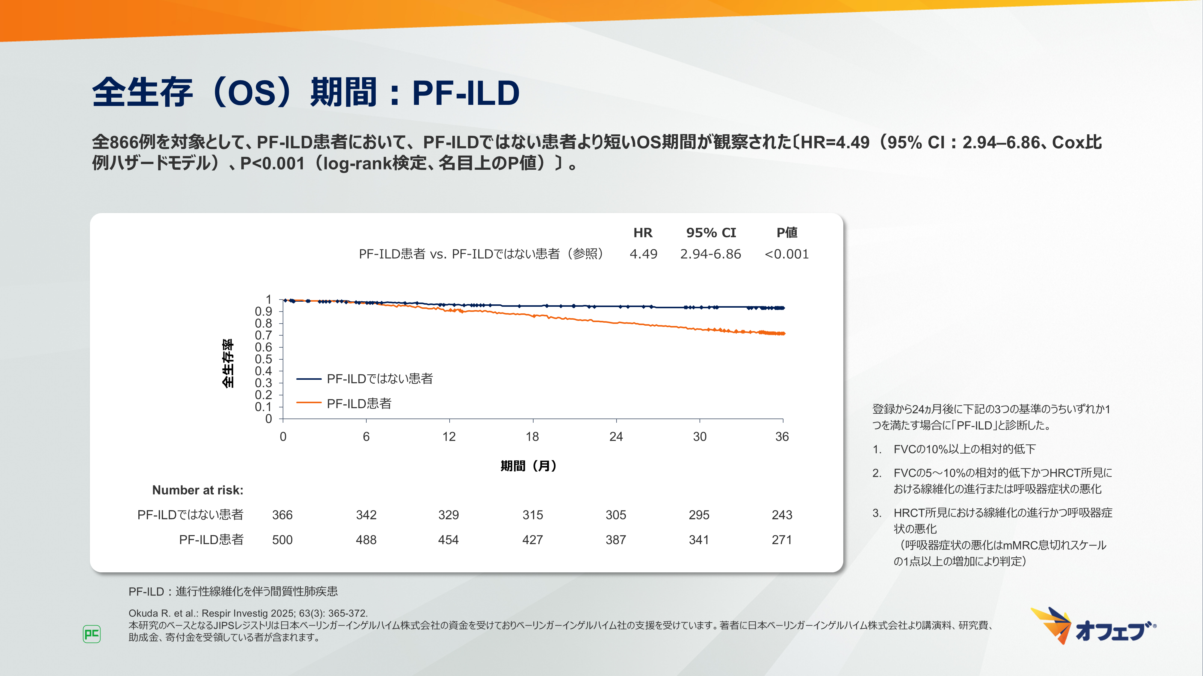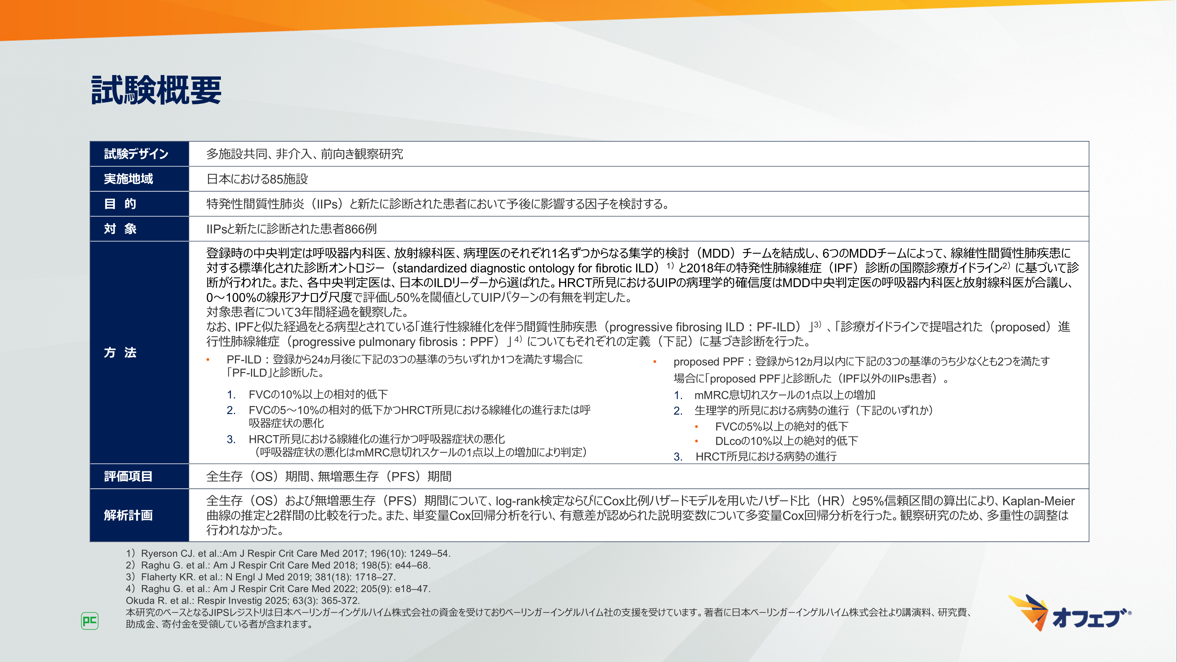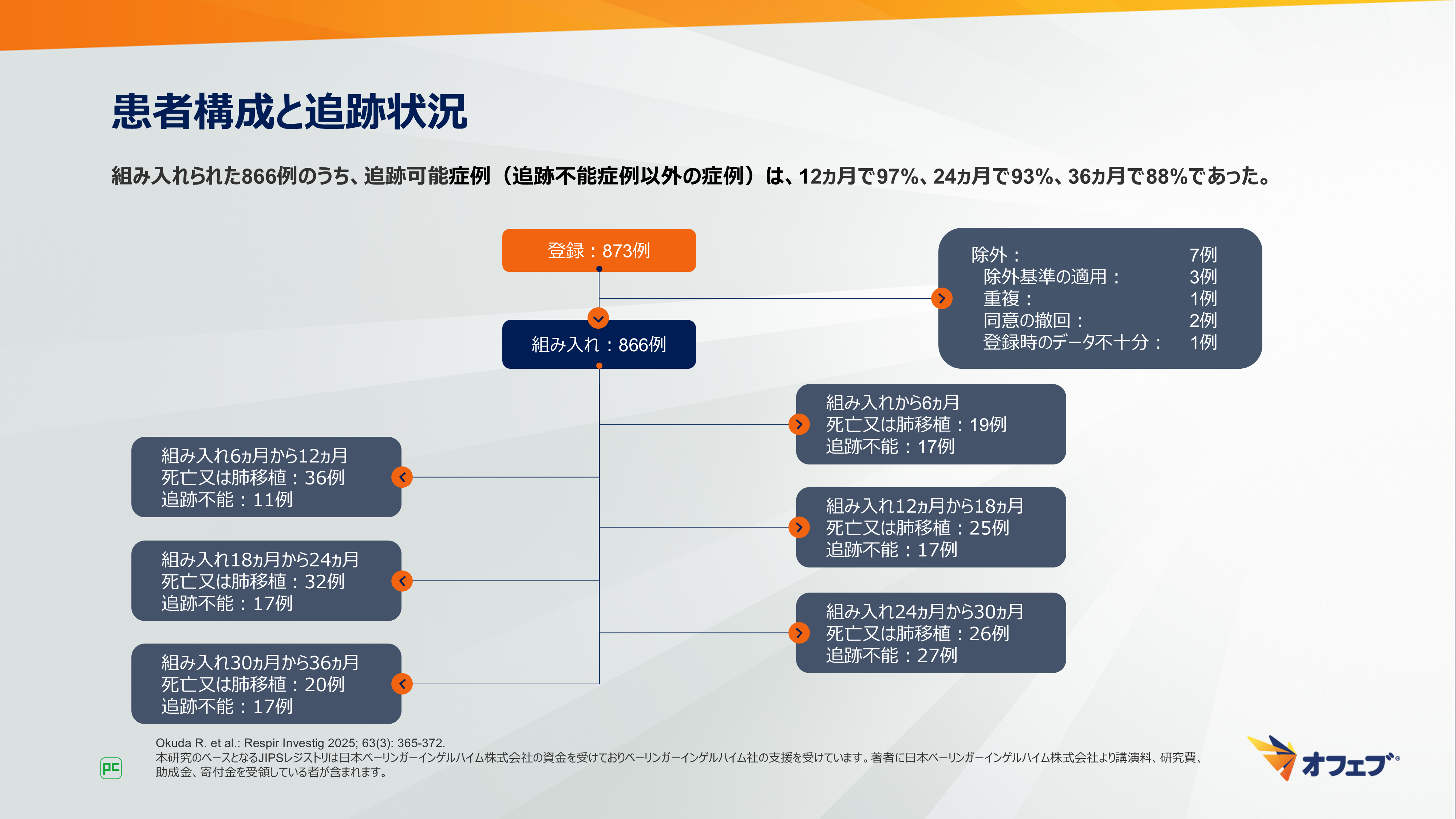 - Okuda R. et al.: Respir Investig 2025; 63(3): 365-372. 本研究のベースとなるJIPSレジストリは日本ベーリンガーインゲルハイム株式会社の資金を受けておりベーリンガーインゲルハイム社の支援を受けています。著者に日本ベーリンガーインゲルハイム株式会社より講演料、研究費、助成金、寄付金を受領している者が含まれます。
