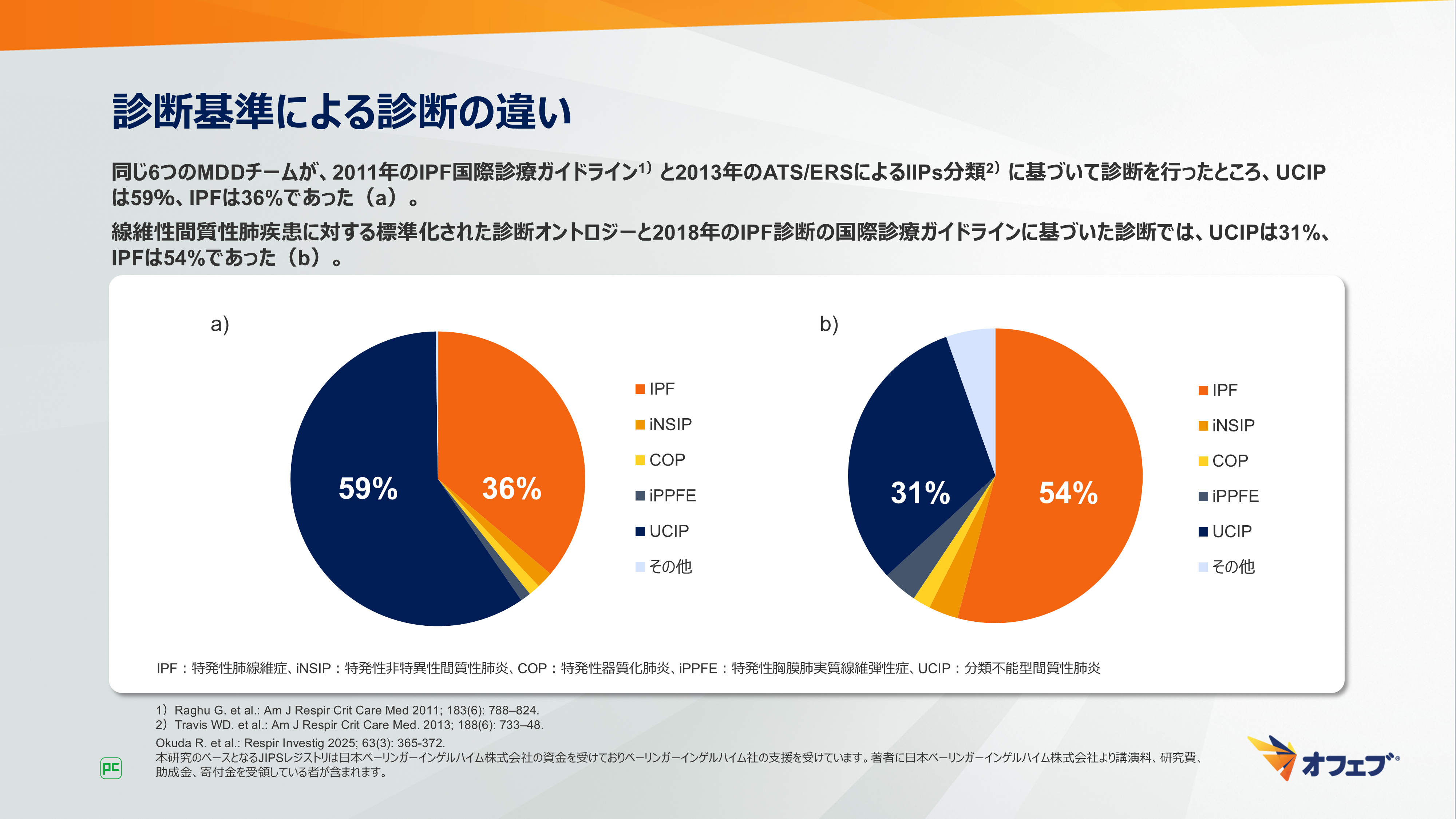 同じ6つのMDDチームが、2011年のIPF国際診療ガイドライン6)と2013年のATS/ERSによるIIPs分類7)に基づいて診断を行ったところ、UCIPは59%、IPFは36%でした(a)。「患者背景」でご説明した通り、線維性間質性肺疾患に対する標準化された診断オントロジーと2018年のIPF診断の国際診療ガイドラインに基づいた診断では、UCIPは31%、IPFは54%でした(b)。この結果から、診断オントロジーを用いることでUCIPの割合が減少することが示されました。