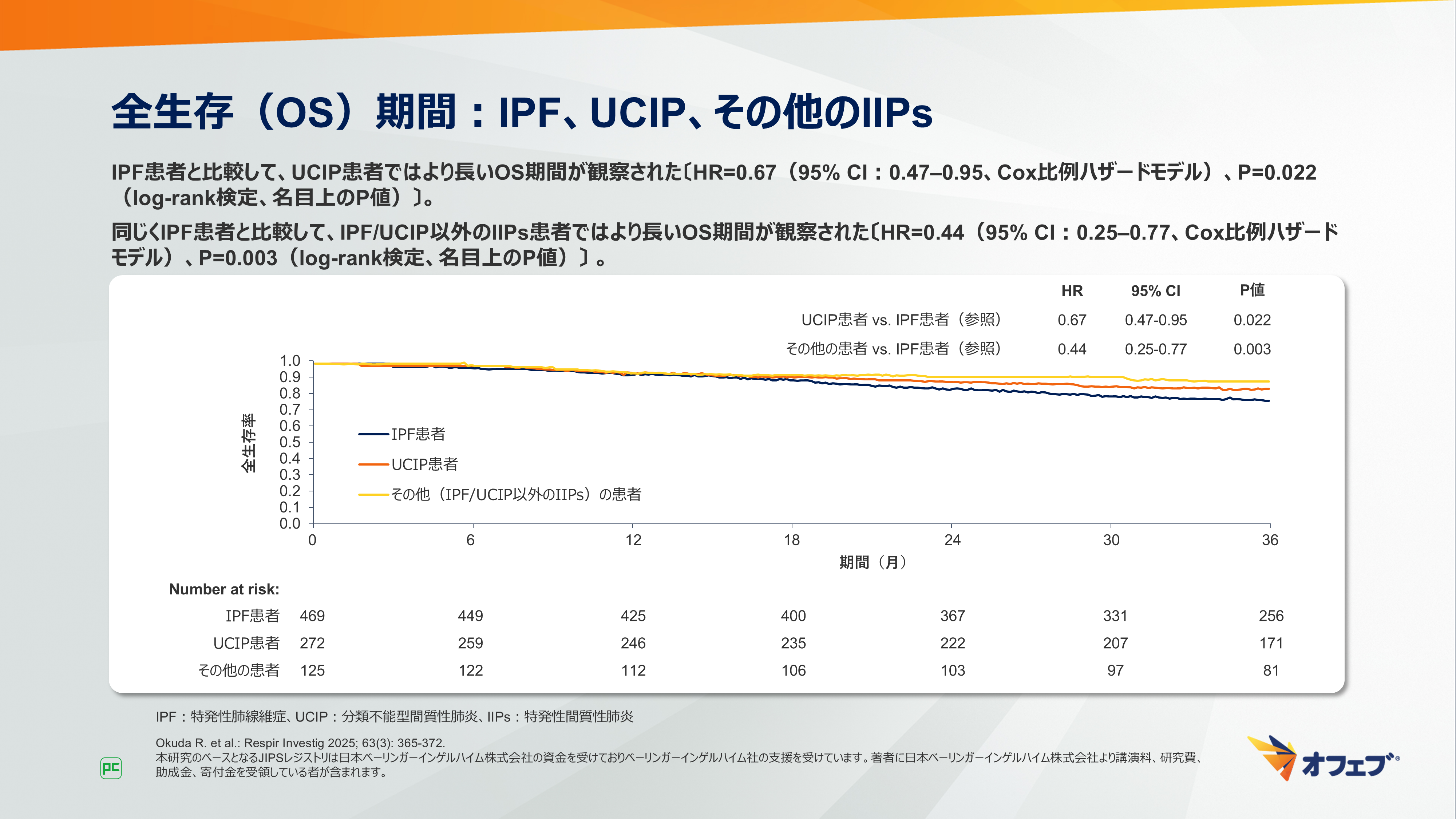 IPF患者と比較して、UCIP患者ではより長いOS期間が観察されました〔HR=0.67(95% CI:0.47–0.95、Cox比例ハザードモデル)、P=0.022(log-rank検定、名目上のP値)〕。また 、同じくIPF患者と比較して、IPF/UCIP以外のIIPs患者(iNSIP、COP、iPPFEなど)ではより長いOS期間が観察されました〔HR=0.44(95% CI:0.25–0.77、Cox比例ハザードモデル)、P=0.003(log-rank検定、名目上のP値)〕。