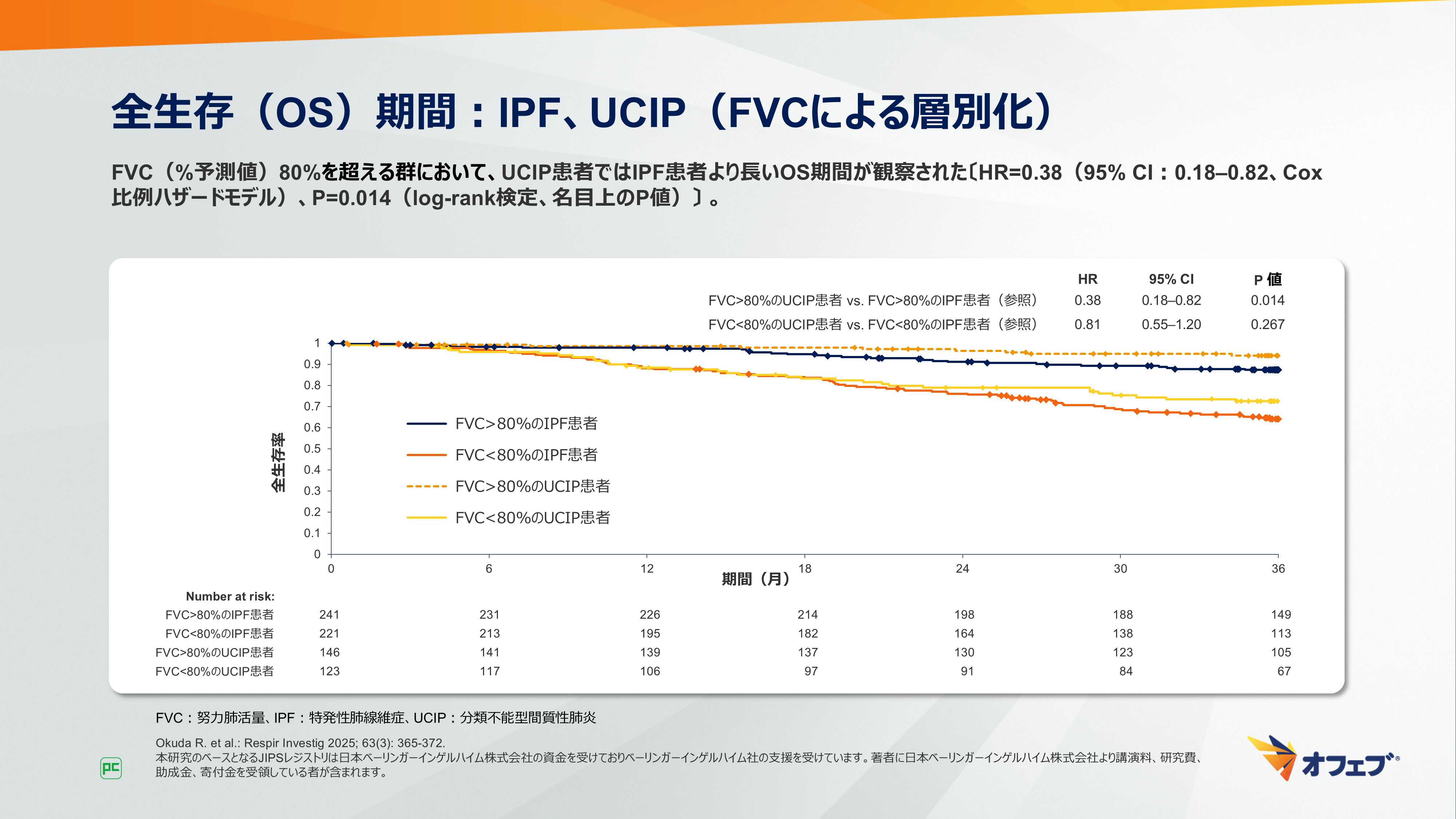 FVC(%予測値)80%を超える群において、UCIP患者ではIPF患者より長いOS期間が観察されました〔HR=0.38(95% CI:0.18–0.82、Cox比例ハザードモデル)、P=0.014(log-rank検定、名目上のP値)〕。