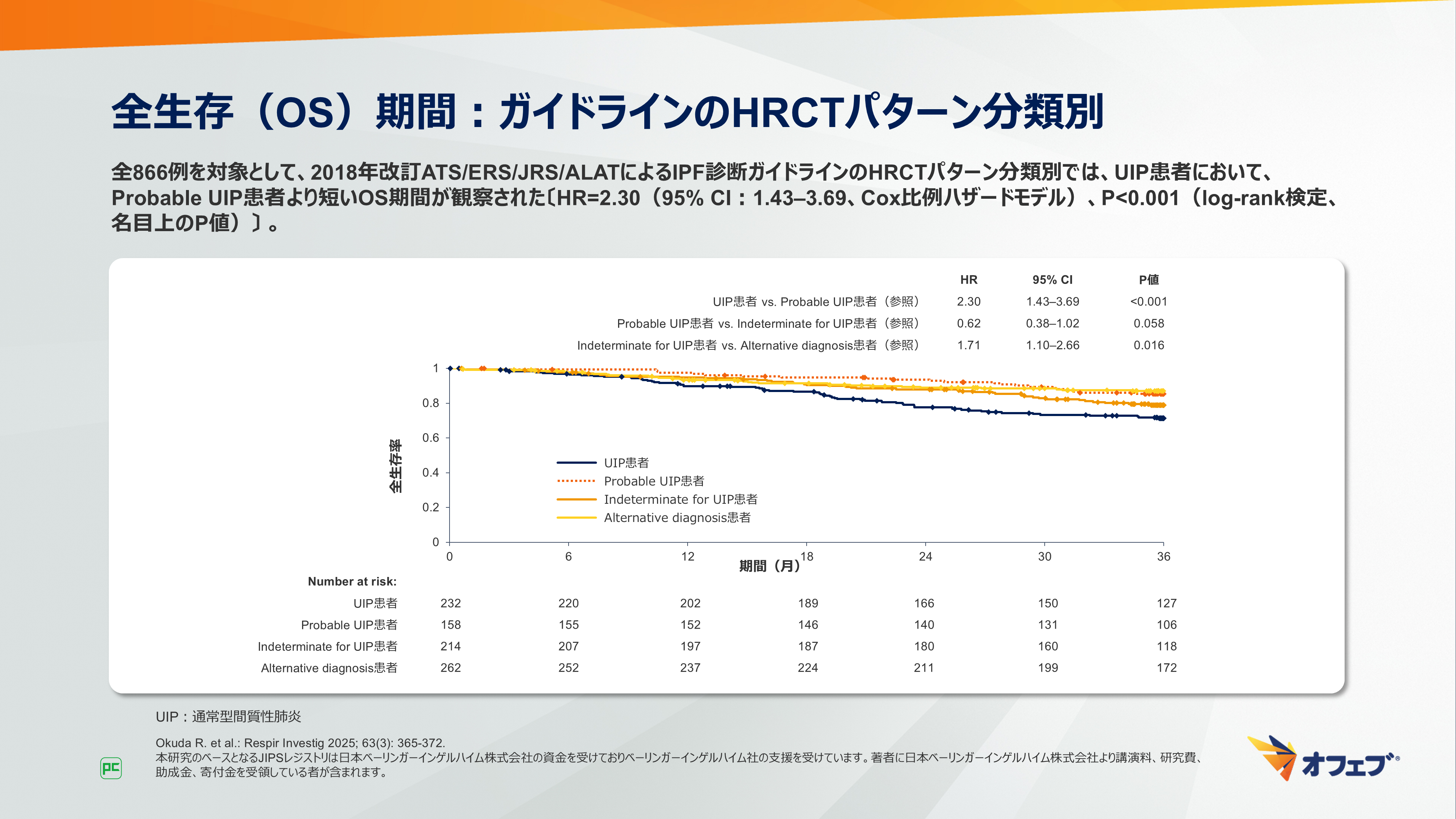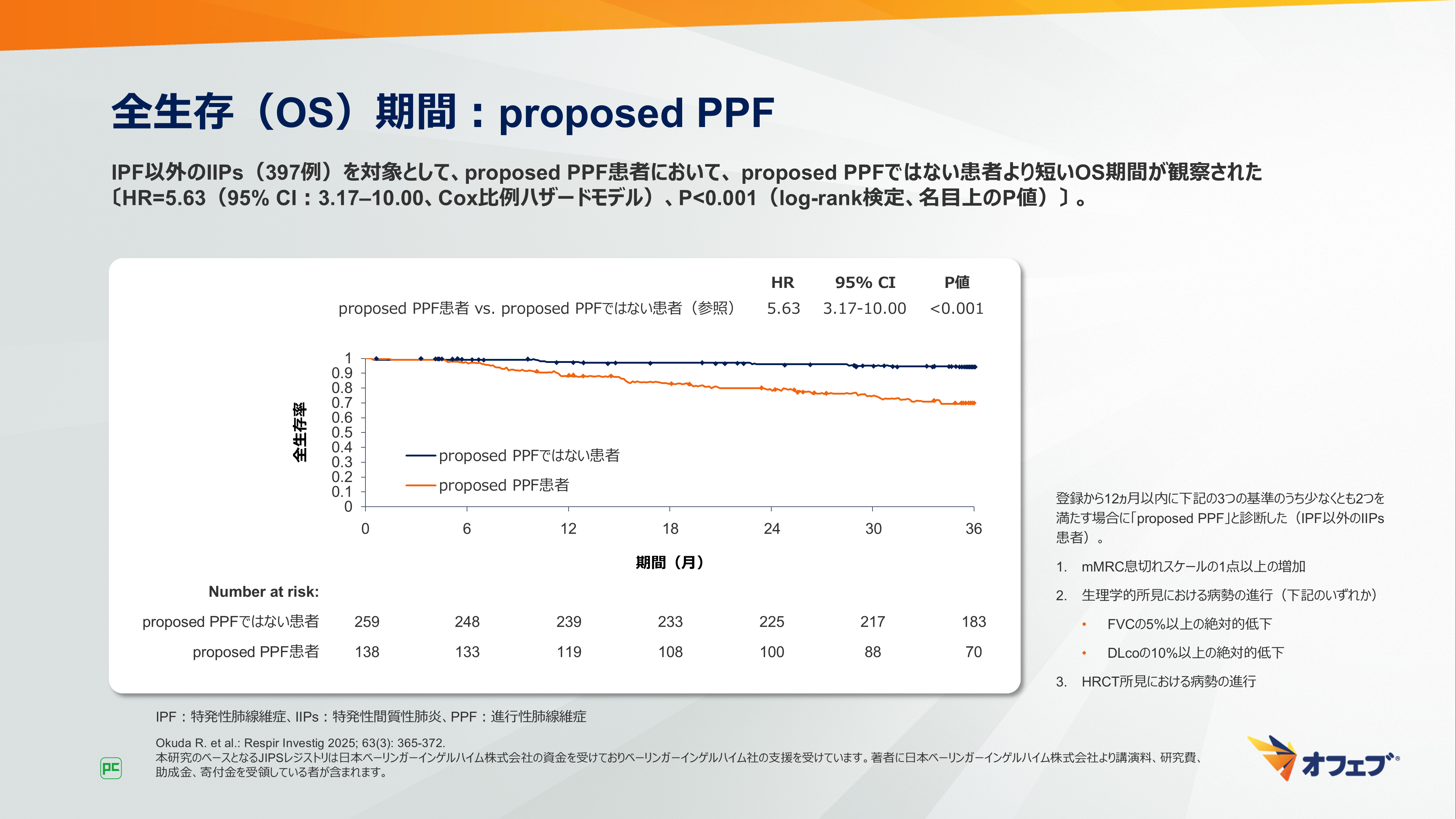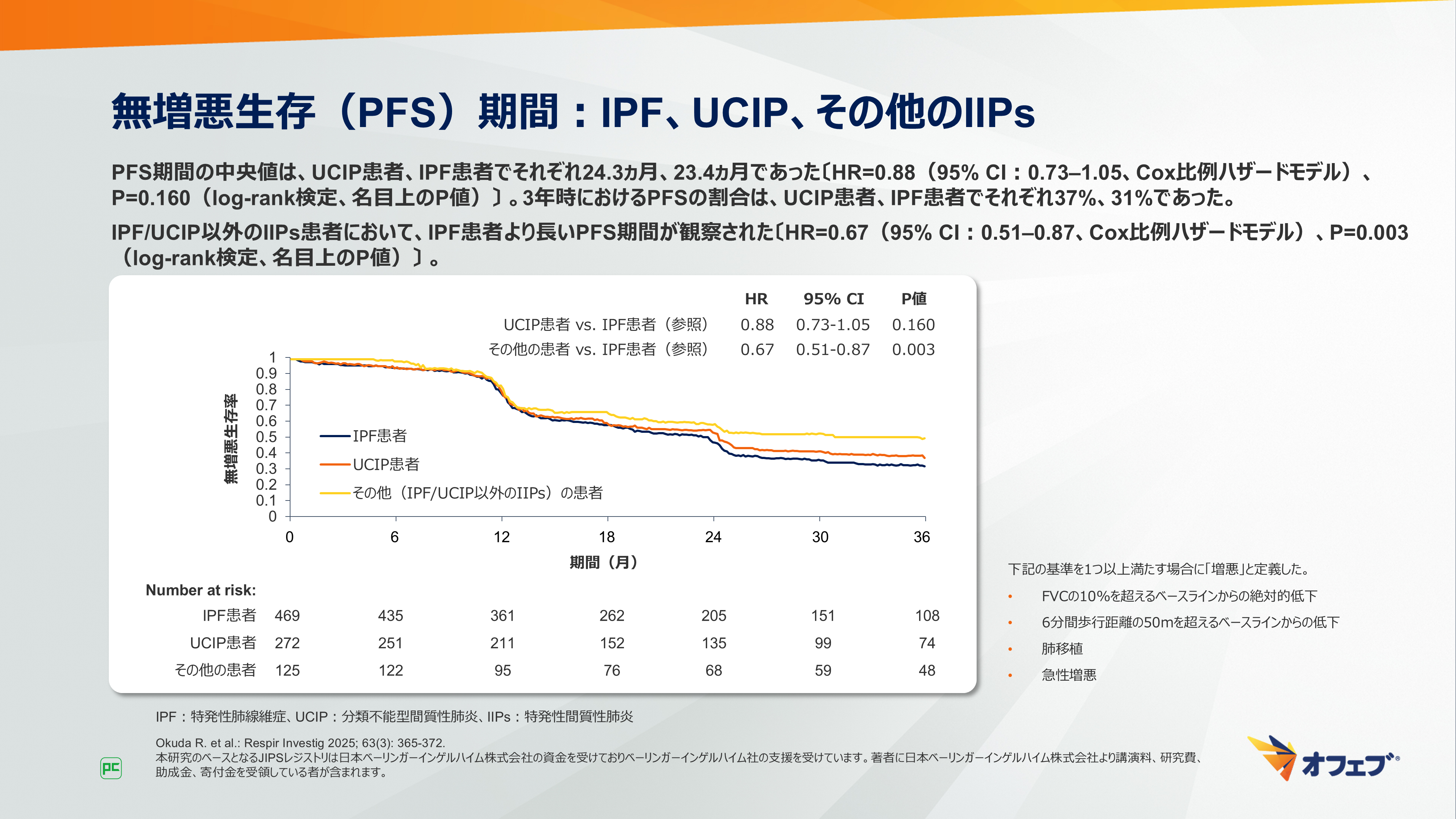 IPF/UCIP以外のIIPs患者(iNSIP、COP、iPPFEなど)において、IPF患者より長いPFS期間が観察されました〔HR=0.67(95% CI:0.51–0.87、Cox比例ハザードモデル)、P=0.003(log-rank検定、名目上のP値)〕。