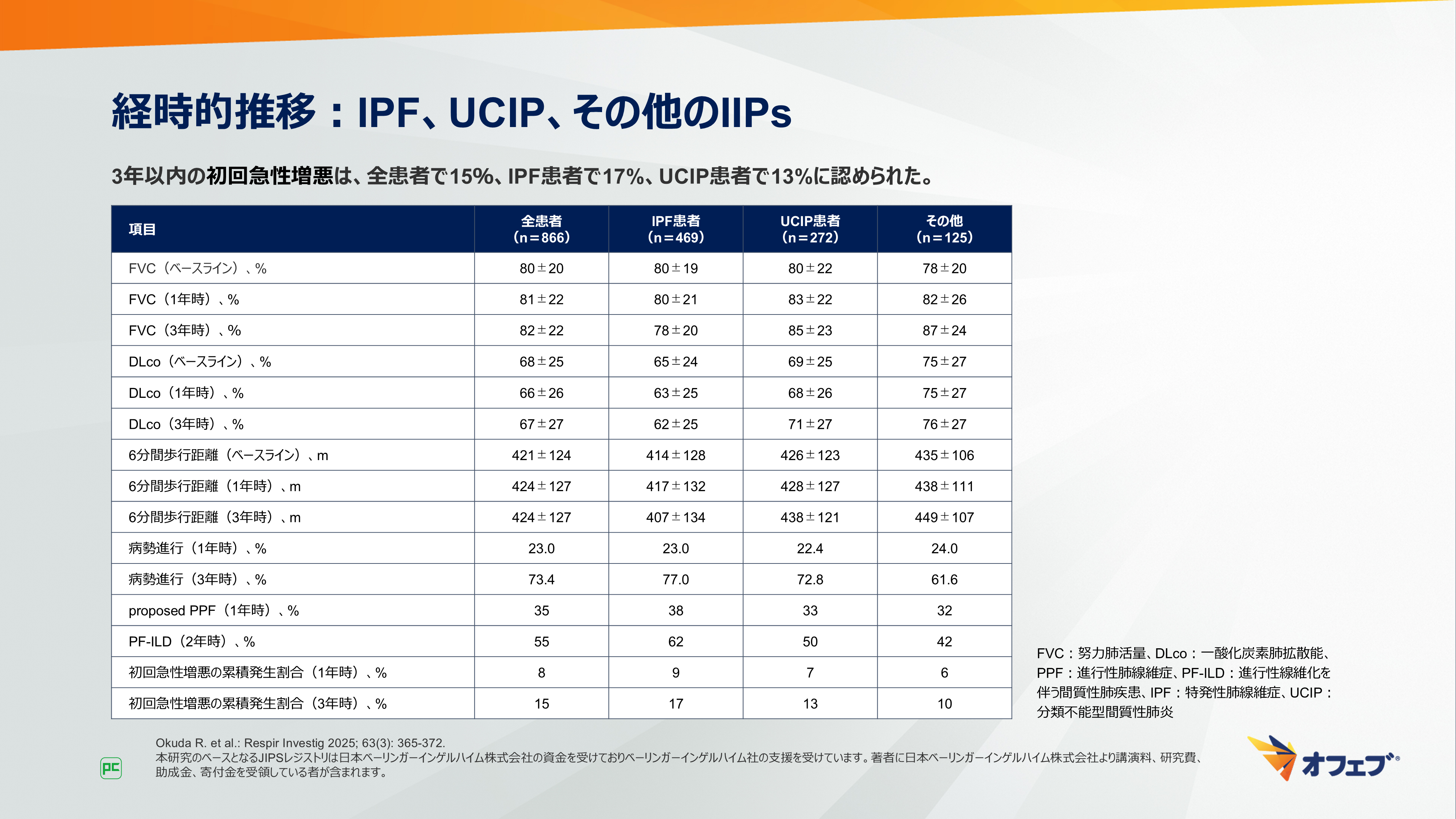 いずれの群においても、FVC、DLco、6分間歩行距離の著明な経時的悪化は認められず、検査が実施できた症例のみを追跡しても、病態の進行を十分に捉えられない可能性がありました。また、3年以内の初回急性増悪は、全患者で15%、IPF患者で17%、UCIP患者で13%でした。