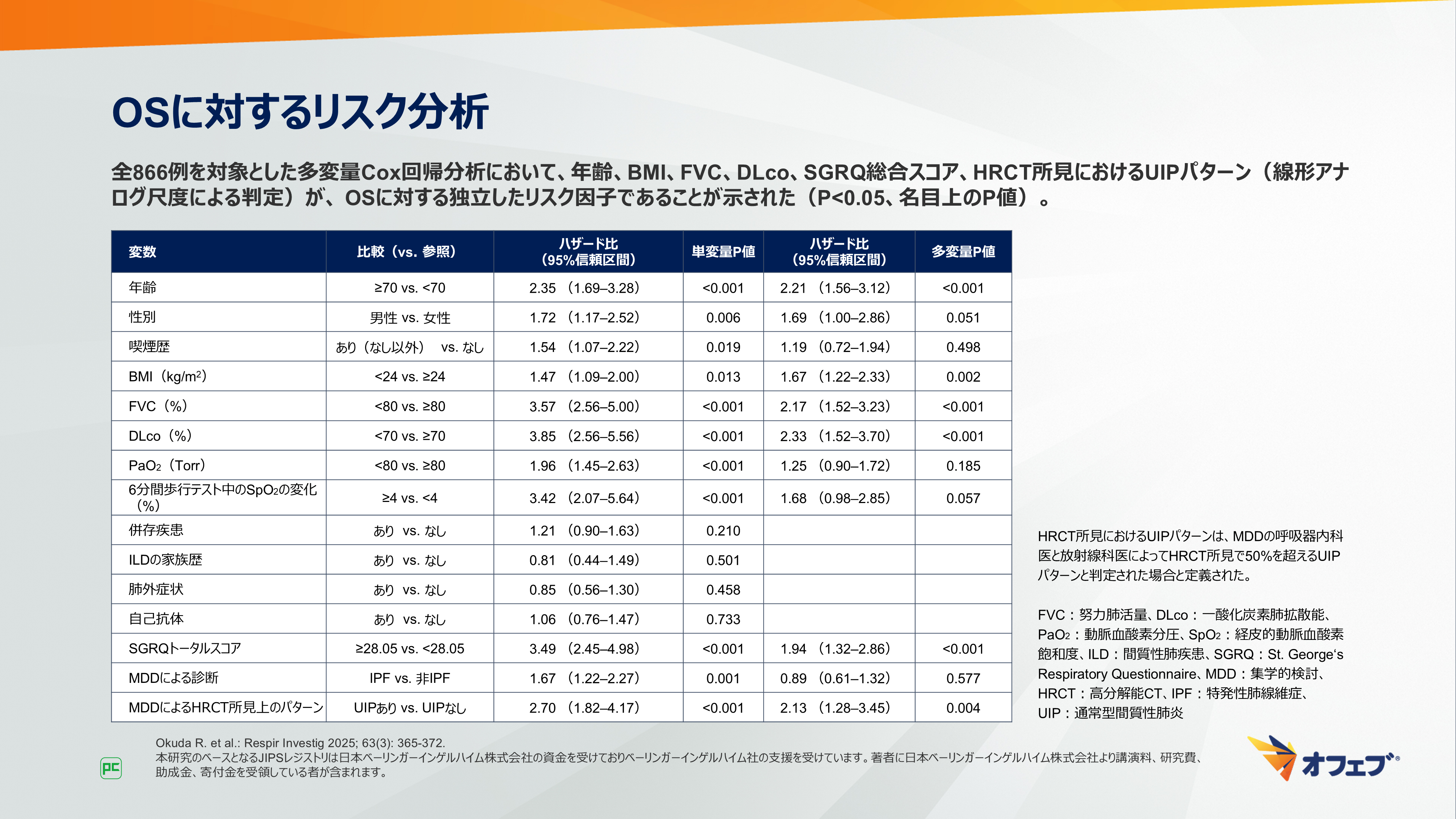 多変量Cox回帰分析において、年齢、BMI、FVC、DLco、SGRQ総合スコア、HRCTにおけるUIPパターン(線形アナログ尺度による判定)が、 OSに対する独立したリスク因子であることが示されました(P<0.05、名目上のP値)。