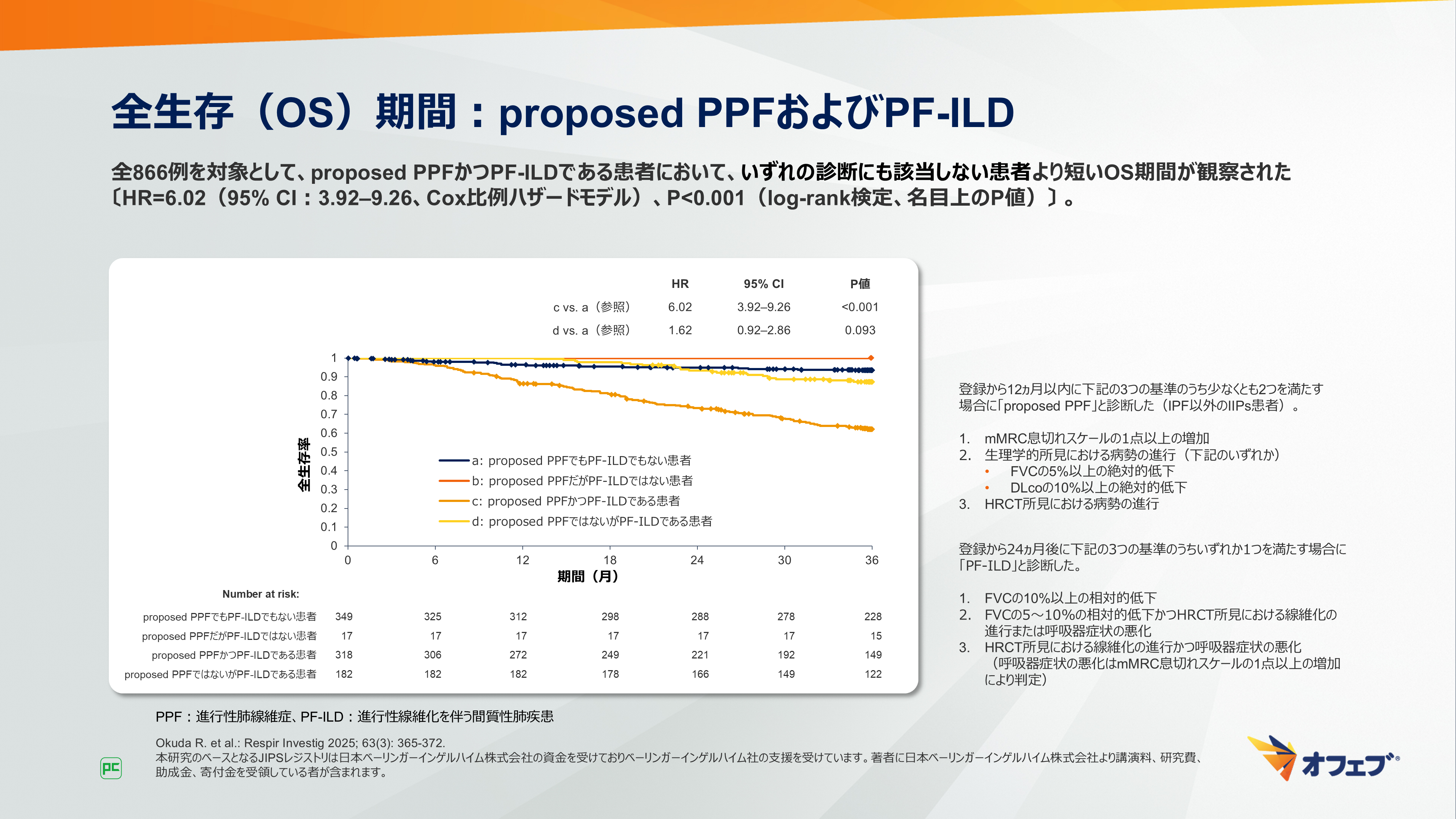 proposed PPFかつPF-ILDである患者において、いずれの診断にも該当しない患者より短いOS期間が観察されました〔HR=6.02(95% CI:3.92–9.26、Cox比例ハザードモデル)、P<0.001(log-rank検定、名目上のP値)〕 。