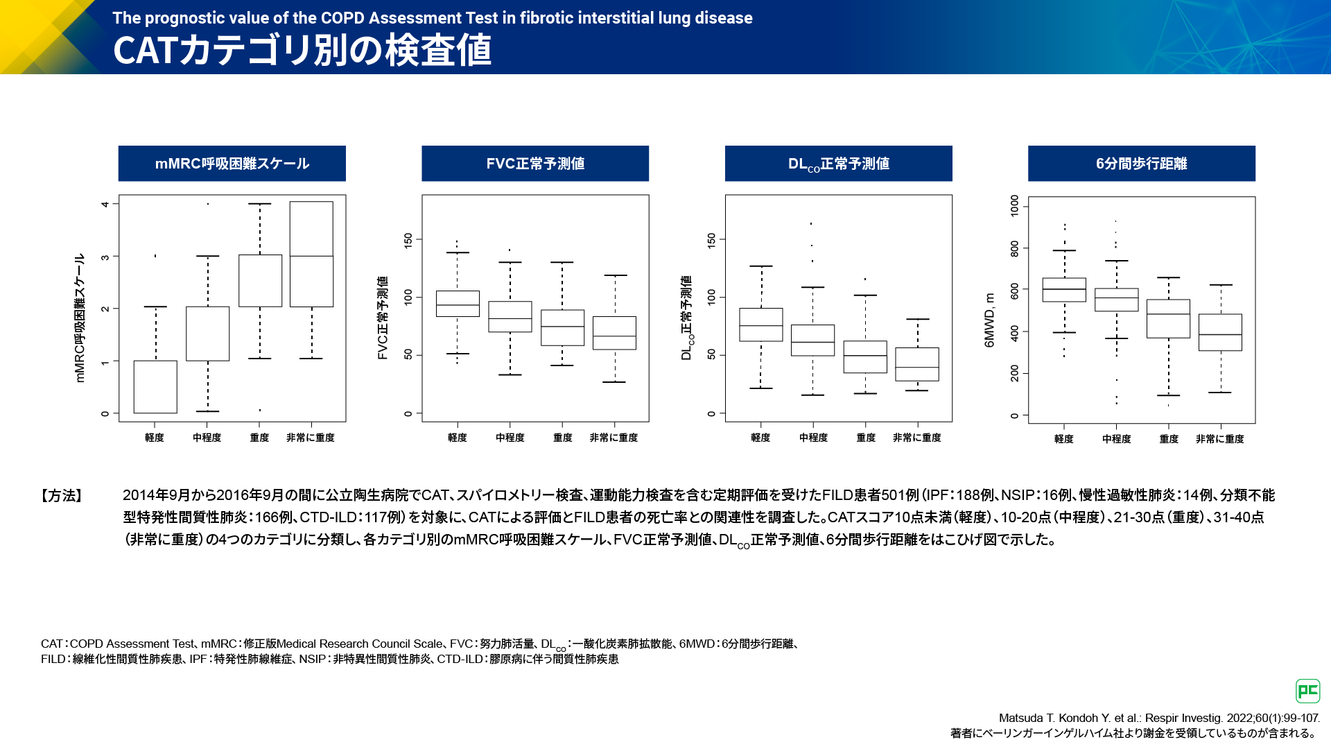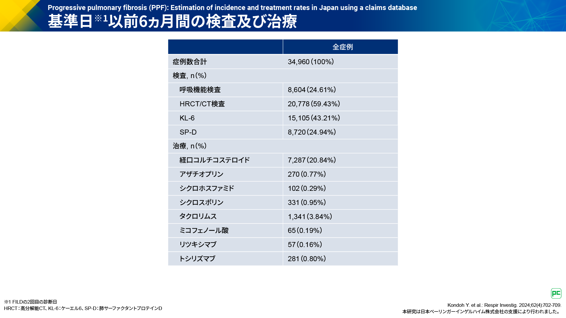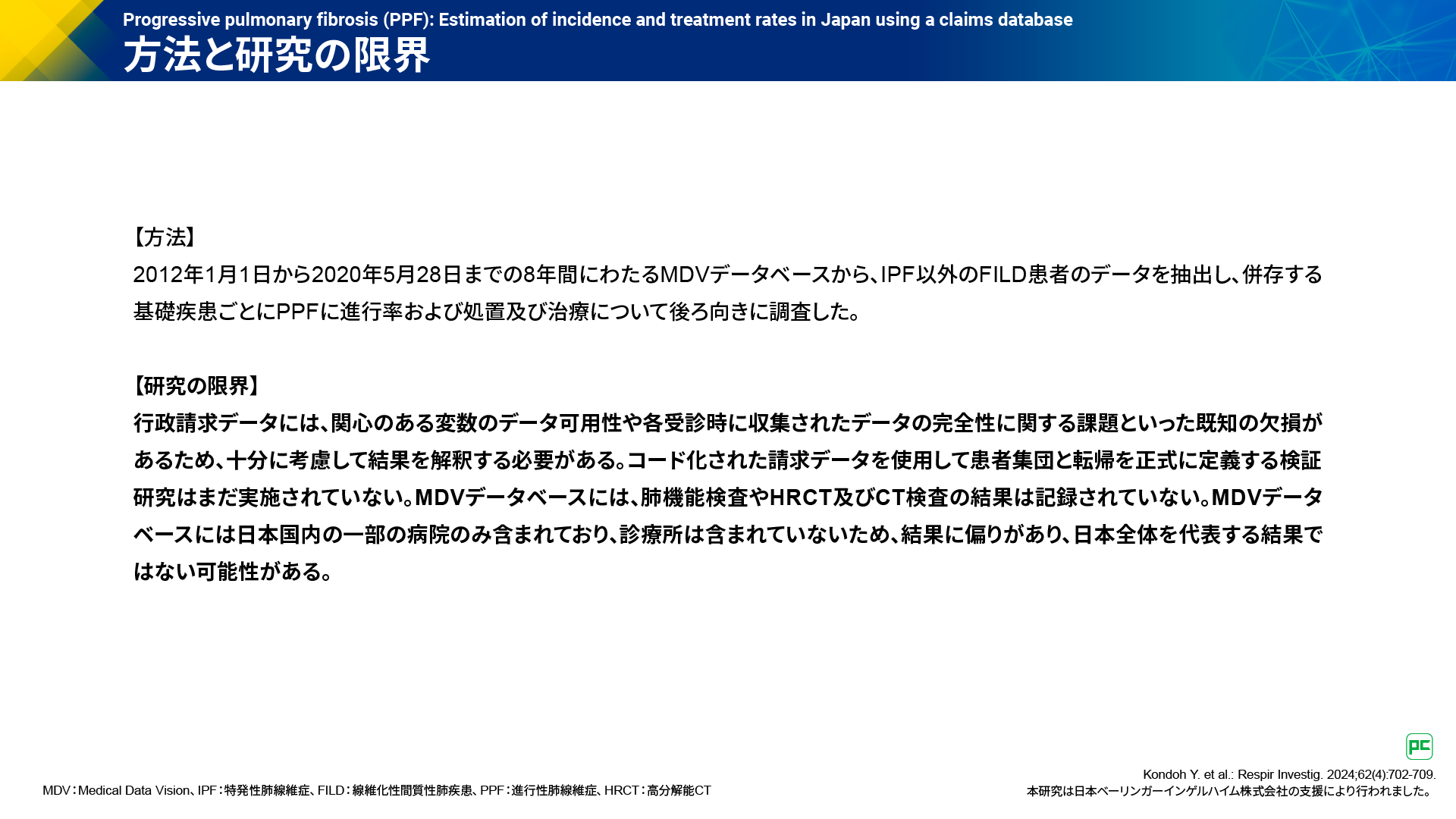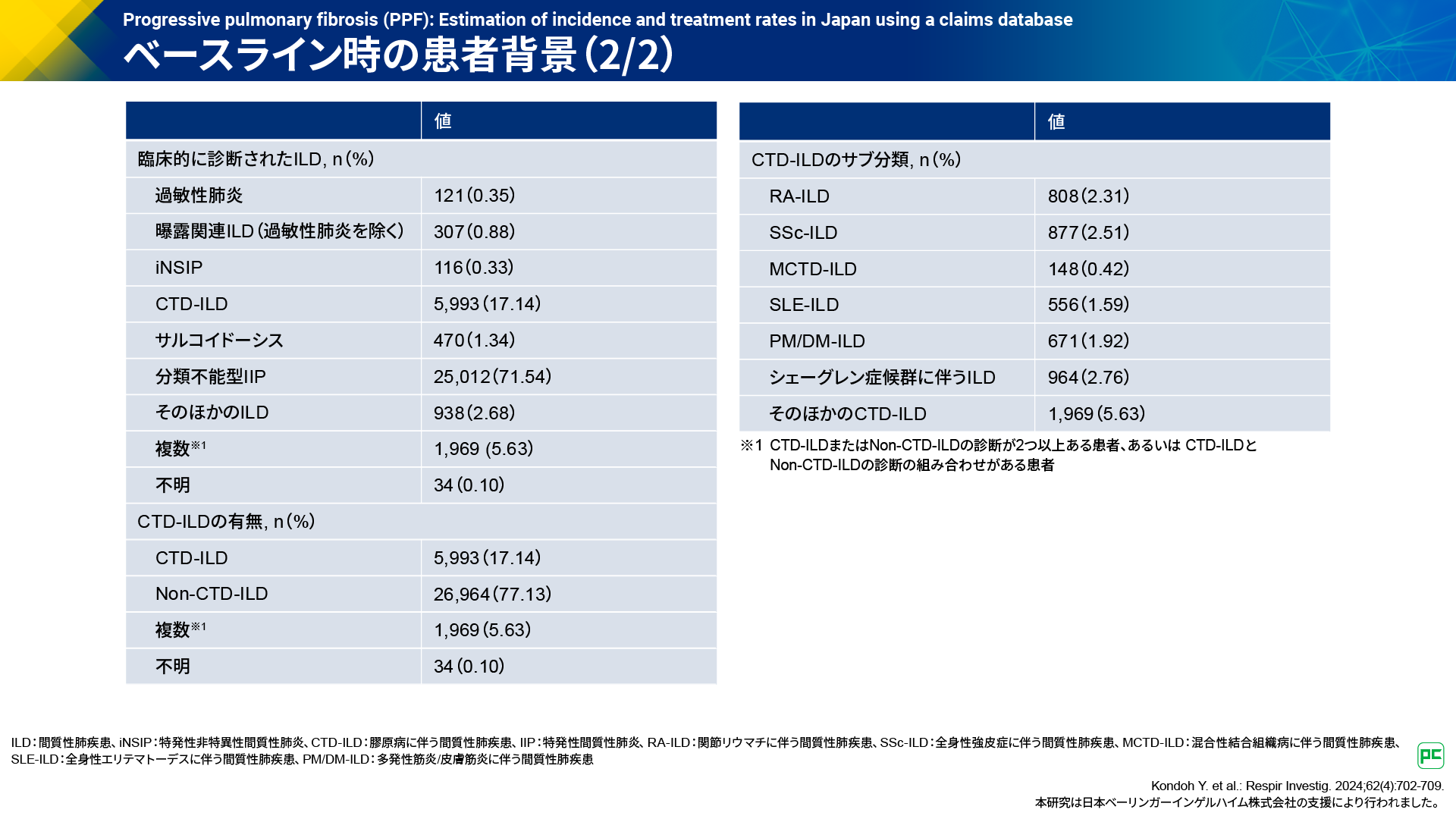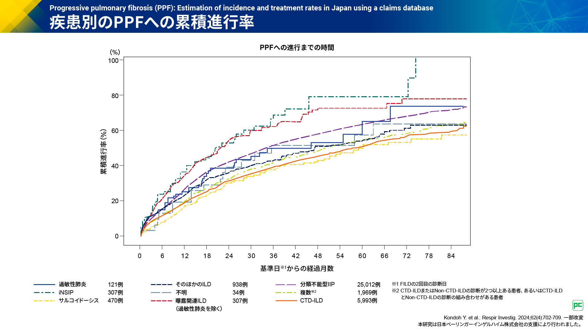 - Kondoh Y. et al.: Respir Investig. 2024;62(4):702-709. 本研究は日本ベーリンガーインゲルハイム株式会社の支援により行われました。