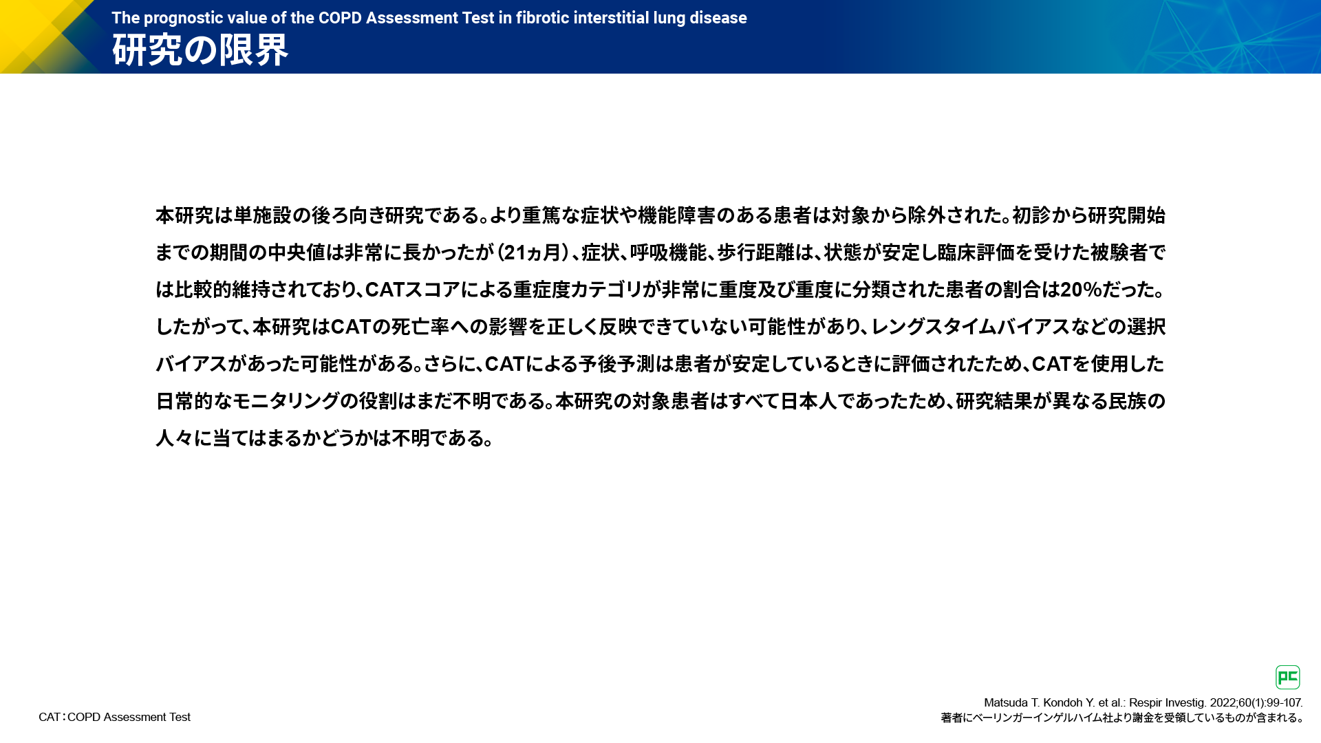 - Matsuda T. Kondoh Y. et al.: Respir Investig. 2022;60(1):99-107. 著者にベーリンガーインゲルハイム社より謝金を受領しているものが含まれる。