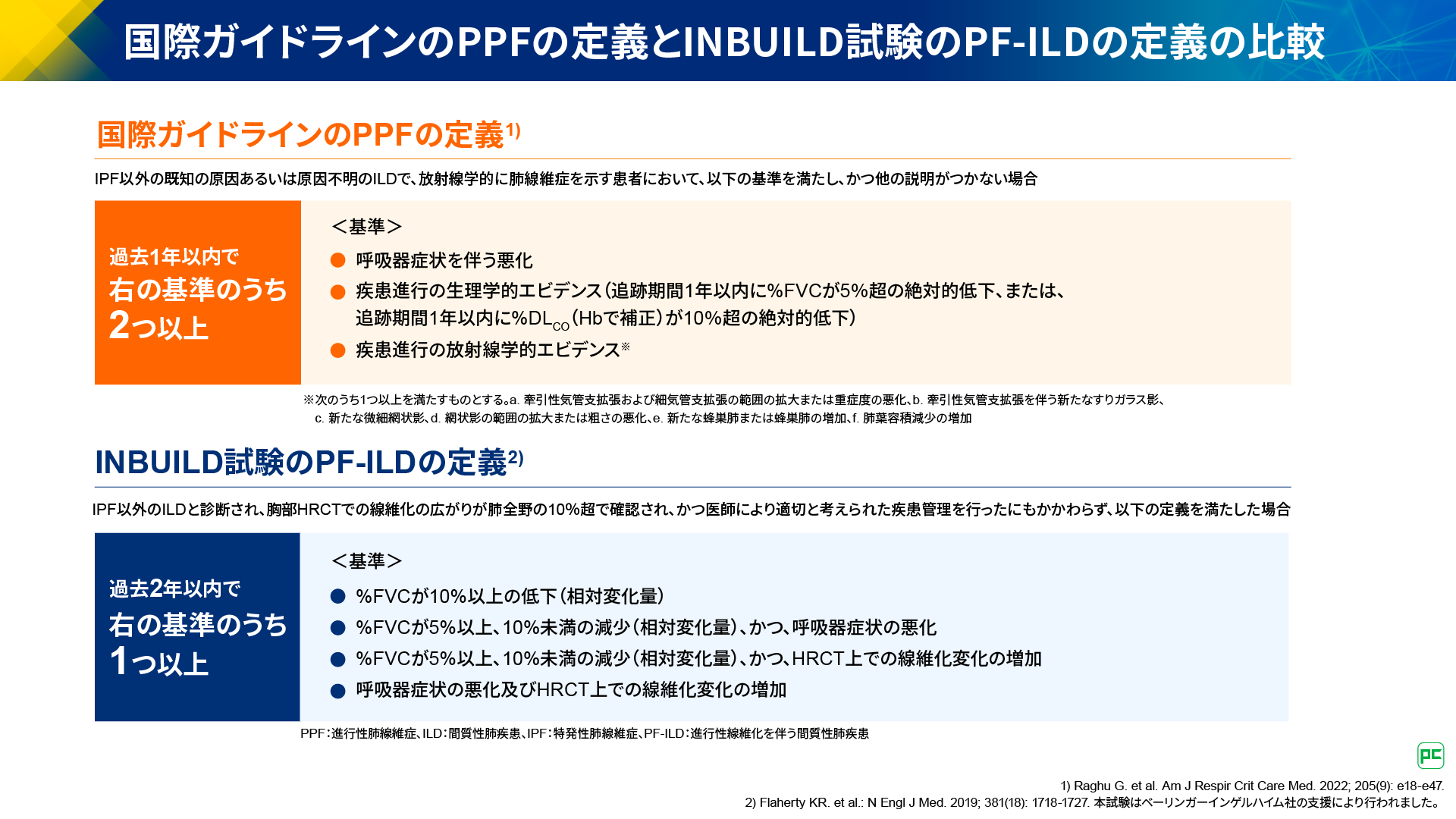 オフェブは、IPF以外のFILDがPPFに進行した場合の治療選択肢のひとつとなります。なお、国際ガイドラインにおけるPPFの定義5)とオフェブの適応である進行性線維化を伴う間質性肺疾患(PF-ILD)の定義6)はそれぞれ図14のとおりです(図14)。2つの定義には若干の違いがあるものの、両方の定義を満たす患者さんがいること、いずれも類似の予後を呈することが報告されています7)。