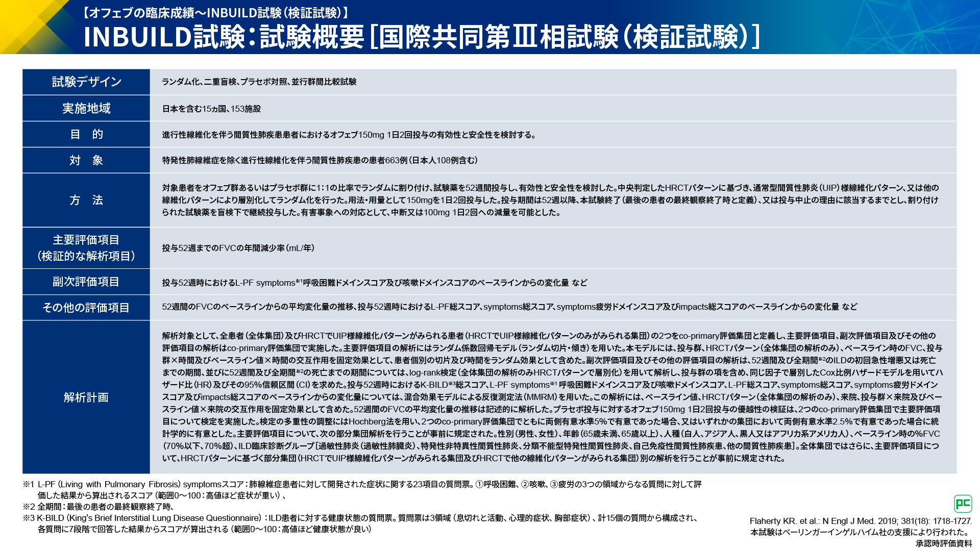 ここから、PF-ILD患者さんを対象にオフェブの有効性と安全性を検討した国際共同第Ⅲ相試験INBUILD試験をみていきましょう(図15)。