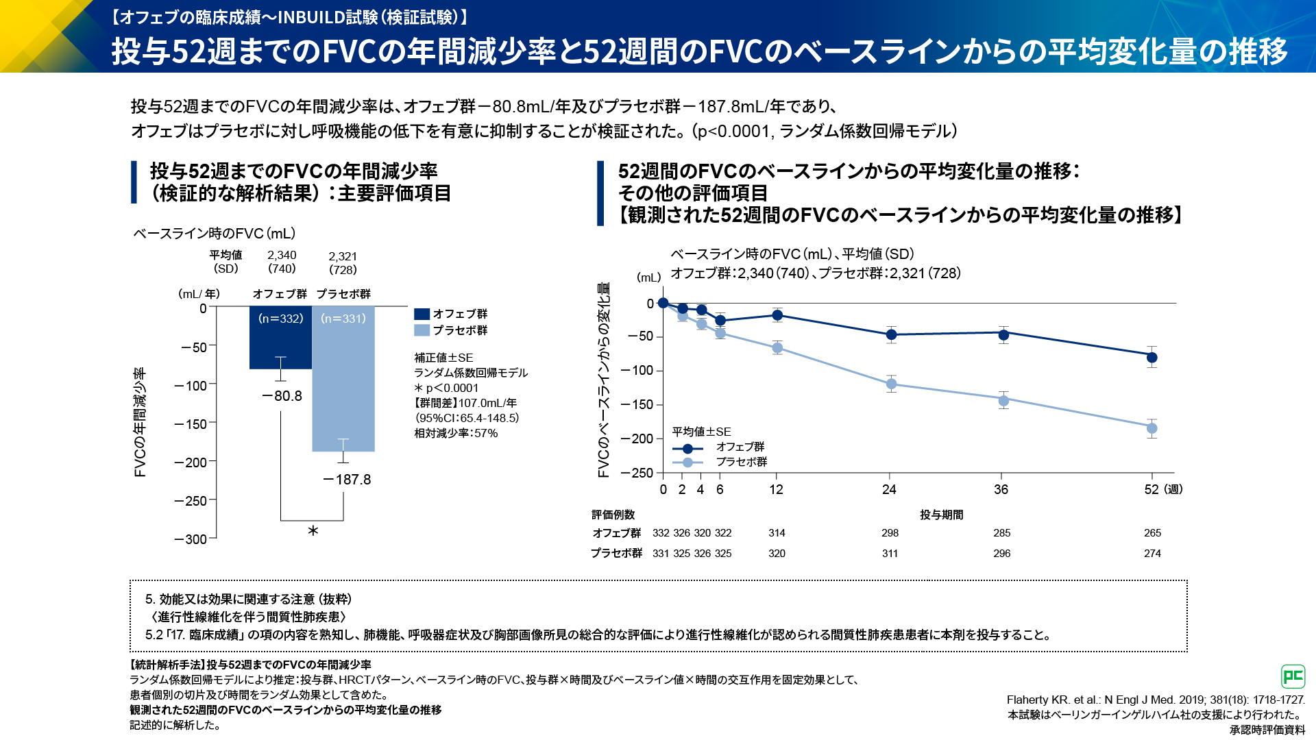 本試験の結果、投与52週までのFVCの年間減少率は、オフェブ群-80.8mL/年及びプラセボ群-187.8mL/年であり、オフェブはプラセボに対し呼吸機能の低下を有意に抑制することが検証されました(図17左)。
