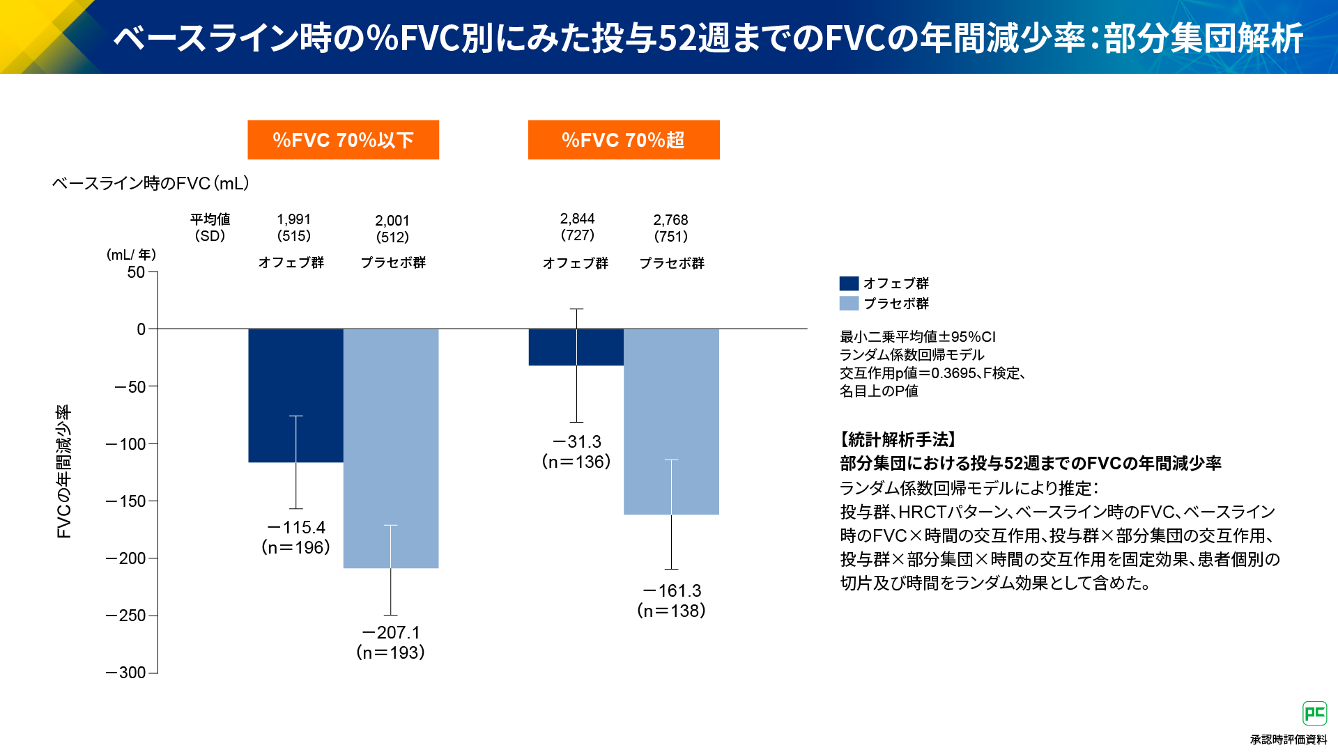 本試験では、ベースライン時の%FVC別の部分集団解析も行われました。投与52週までのFVCの年間減少率は、%FVC 70%以下の集団において、オフェブ群-115.4mL/年、プラセボ群-207.1mL/年、%FVC 70%超の集団において、オフェブ群-31.3mL/年、プラセボ群-161.3mL/年でした(図18)。