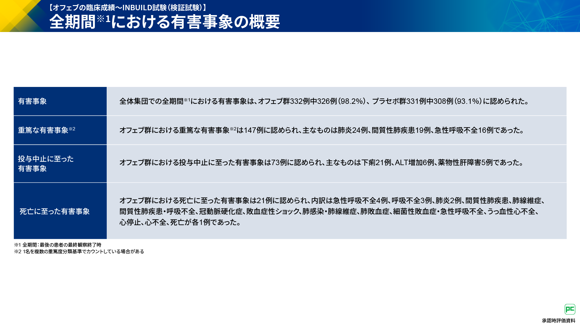 本試験の全期間における有害事象は、オフェブ群で326例(98.2%)、プラセボ群で308例(93.1%)に認められました。オフェブ群における重篤な有害事象として主なものは肺炎24例、間質性肺疾患19例、急性呼吸不全16例などでした。オフェブ群において投与中止に至った主な有害事象は下痢21例、ALT増加6例、薬物性肝障害5例などであり、死亡に至った有害事象は、急性呼吸不全4例、呼吸不全3例などでした(図19)。
