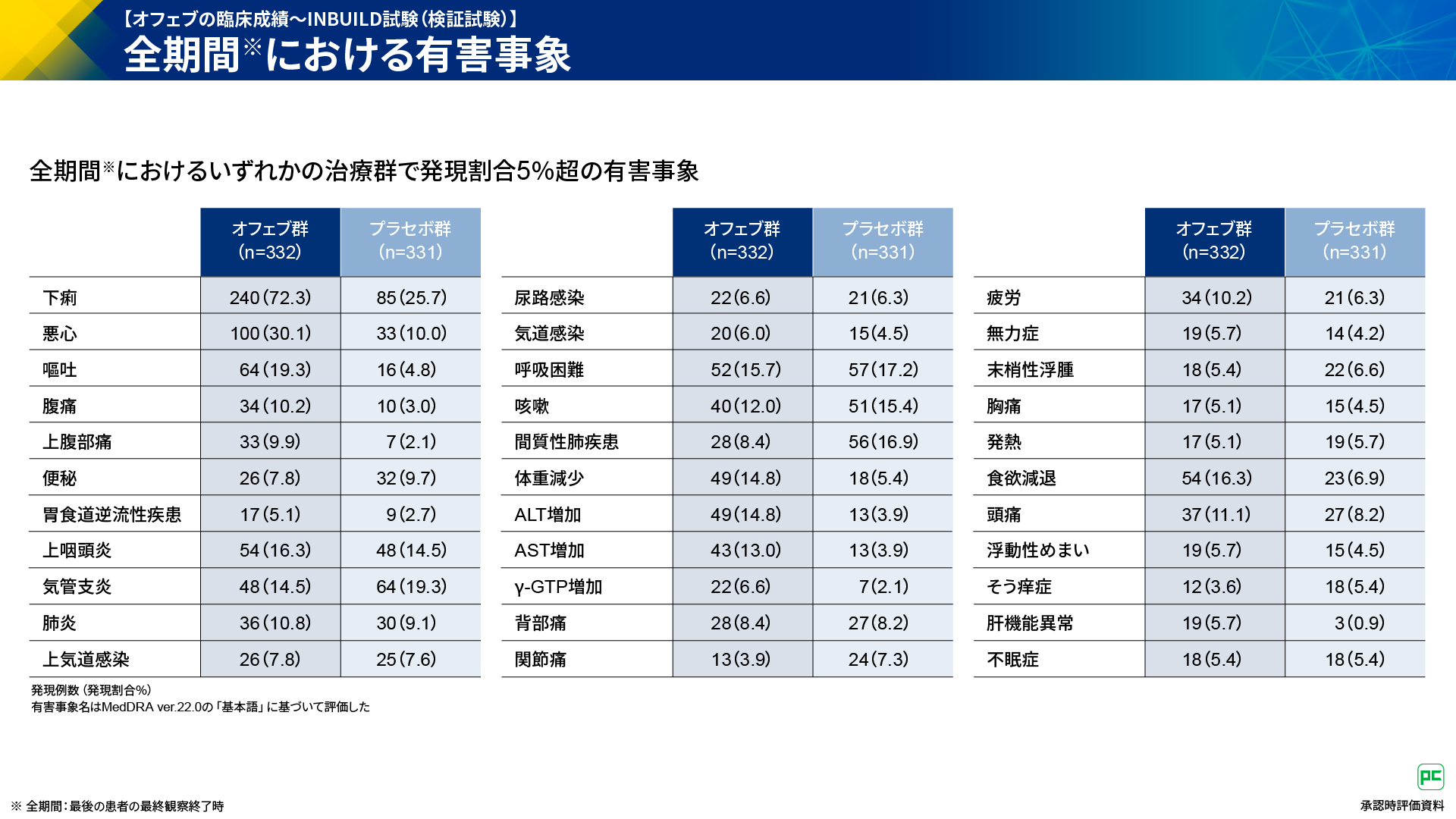 主な有害事象は、発現頻度が高い順にオフェブ群で下痢240例(72.3%)、悪心100例(30.1%)、嘔吐64例(19.3%)など、プラセボ群で下痢85例(25.7%)、気管支炎64例(19.3%)、呼吸困難57例(17.2%)などでした(図20)。